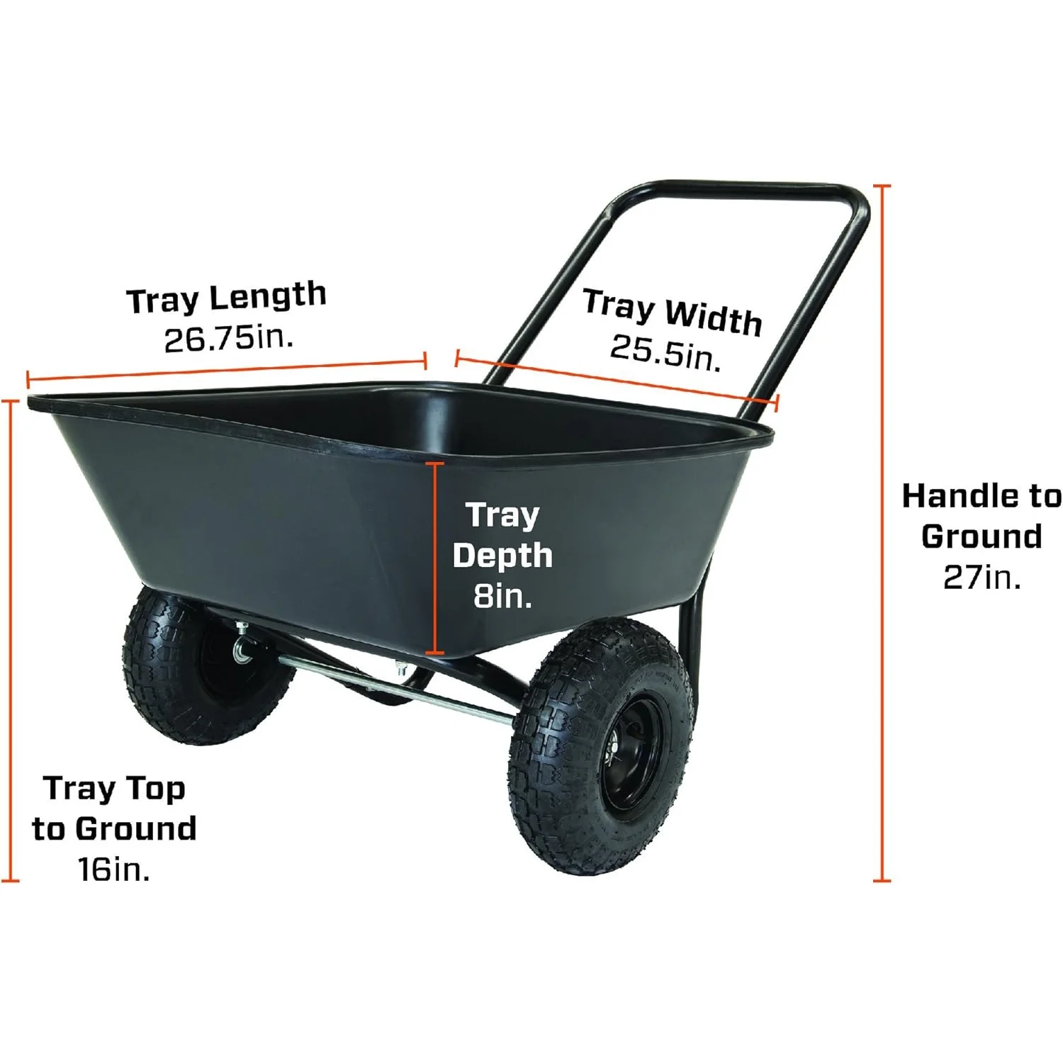 - The rust-proof 4 cubic foot poly tray has a depth of 8", load capacity of 300 pounds, and is perfect for light residential use as a wheelbarrow, yard cart or garden cart.