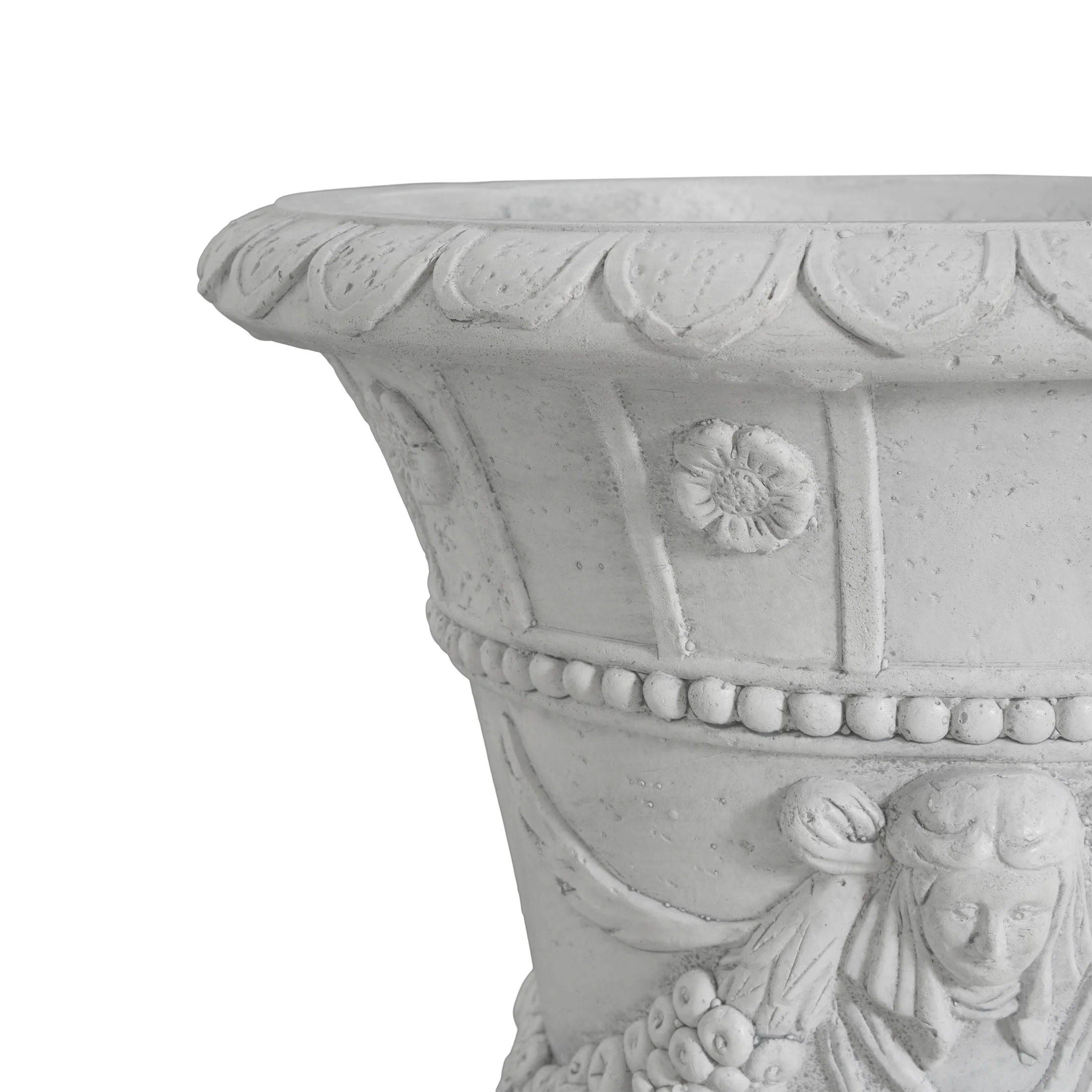 Bring timeless elegance to your outdoor space with the Christopher Knight Home 23.75" MGO Garden Urn Planter, Set of 2, featuring a hand-painted light gray finish and intricate classical detailing. Crafted from durable magnesium oxide, these urns mimic the look of carved stone while remaining lightweight and easy to move. Each planter includes a drainage hole with a removable stopper to keep plants healthy by preventing water buildup. The tall, pedestal-inspired silhouette adds a sophisticated accent to patios, entryways, gardens, or porches. Ideal for displaying vibrant flowers, greenery, or seasonal arrangements, these urns seamlessly blend style with function. Each piece is uniquely finished by hand, ensuring no two are exactly alike. No assembly required, simply place and enjoy their refined charm year-round.