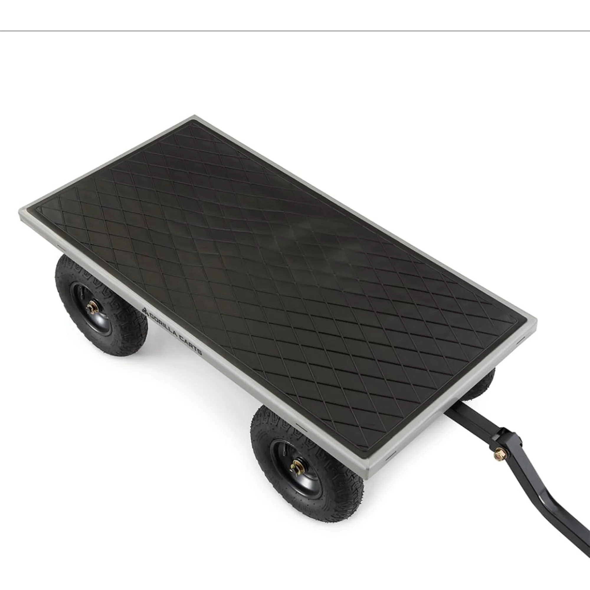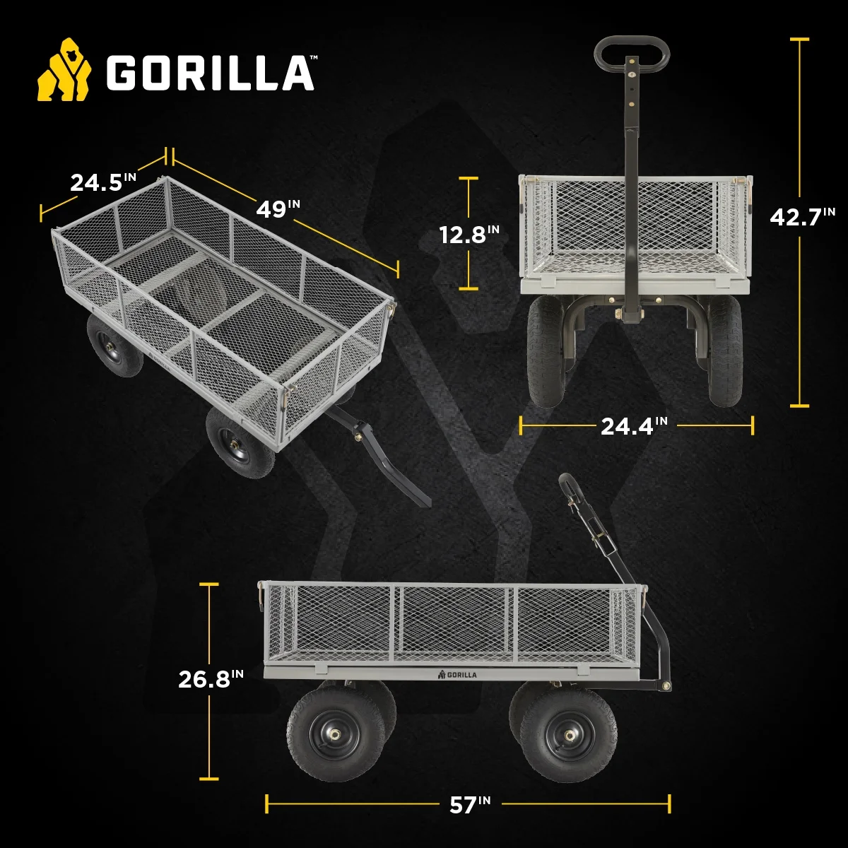 - Durable 49-inch x 24.5-inch steel mesh bed and 13-inch pneumatic tires