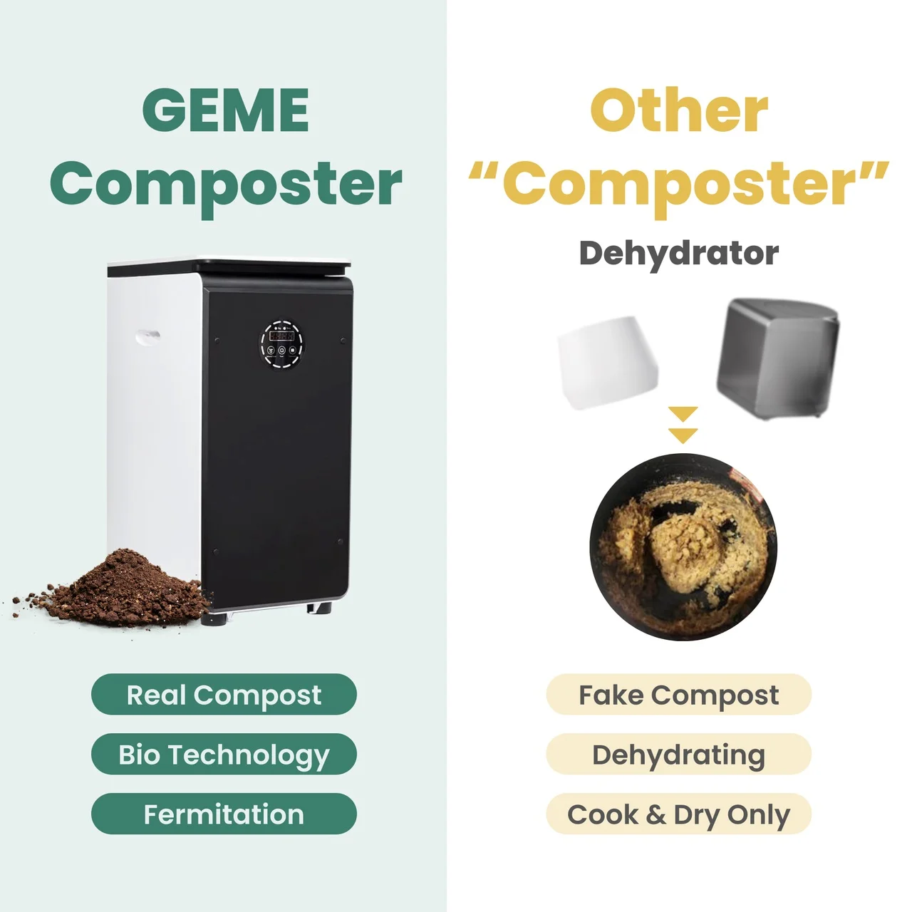 Electric Composter, Real Composting World's First Bio Compost Machine for Kitchen. GEME Electric Composter is designed to break down food waste with microbial degradation technology into organic compost around 6-8 hours.