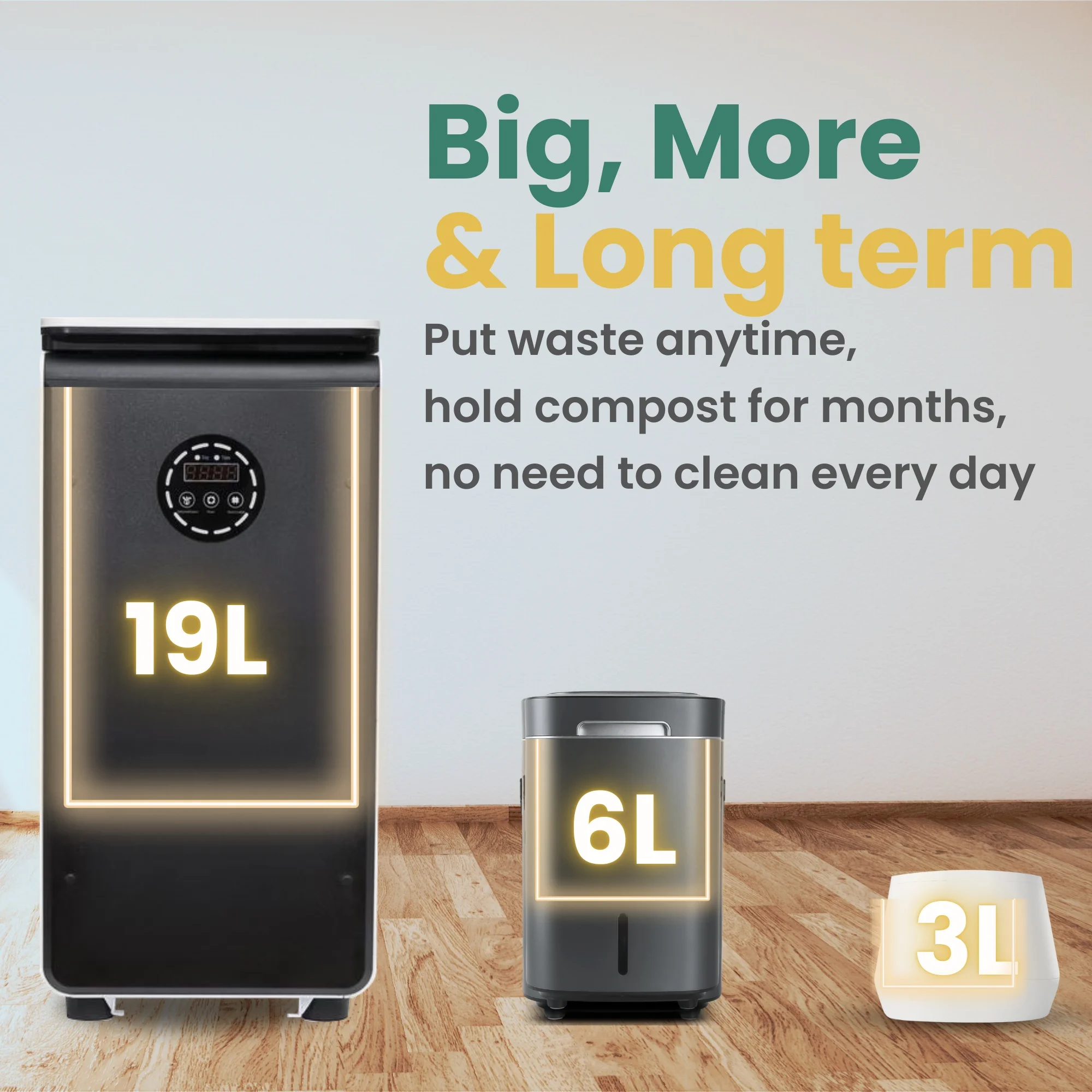 19L Large Capacity GEME Electric Composter for Kitchen with 19L Volume, up to 2kg daily processing capacity. Same prices, obtain bigger Food Cycler, bigger capacity, better experience.