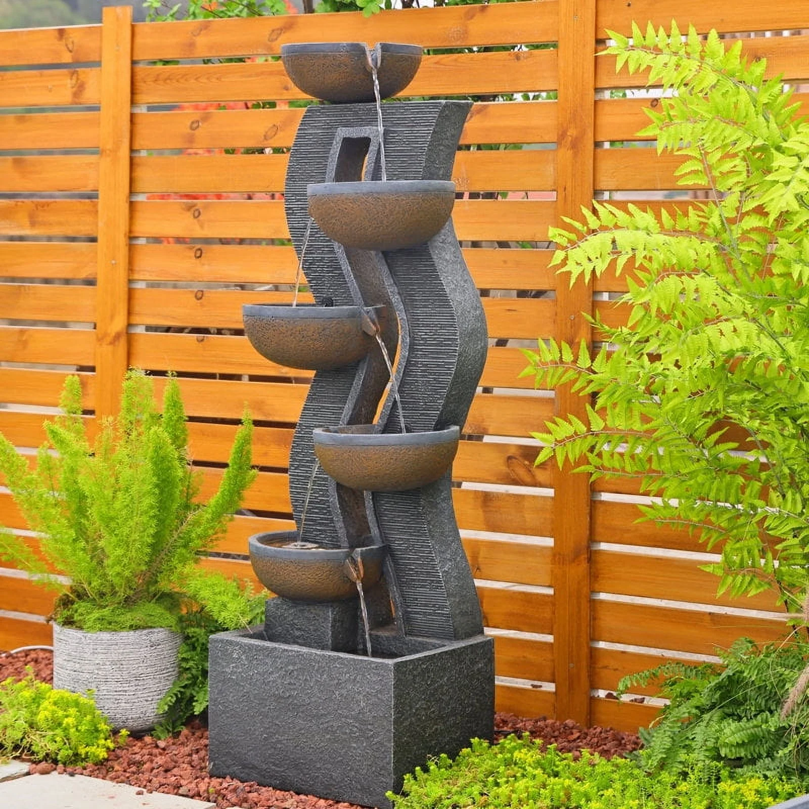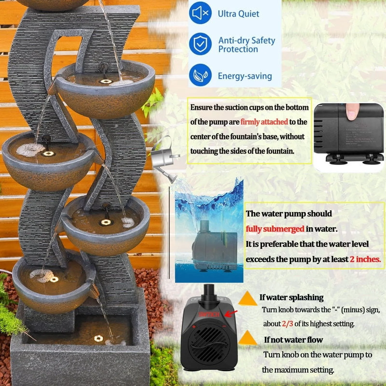 - Outdoor Fountain Size & Easy Setup: The bowl fountain outdoor featuring a stable base combining the shapes of wave shape with five bowls,adds a unique touch to any space. Measuring 16.77"L x 13.85"W x 52.8"H, perfectly sized to fit into any garden or indoor space. 110V~120V, 60HZ Input US Plug. Simply find the perfect spot, plug it in, and delight in the immediate transformation of your space with the soothing sights and sounds of flowing water.