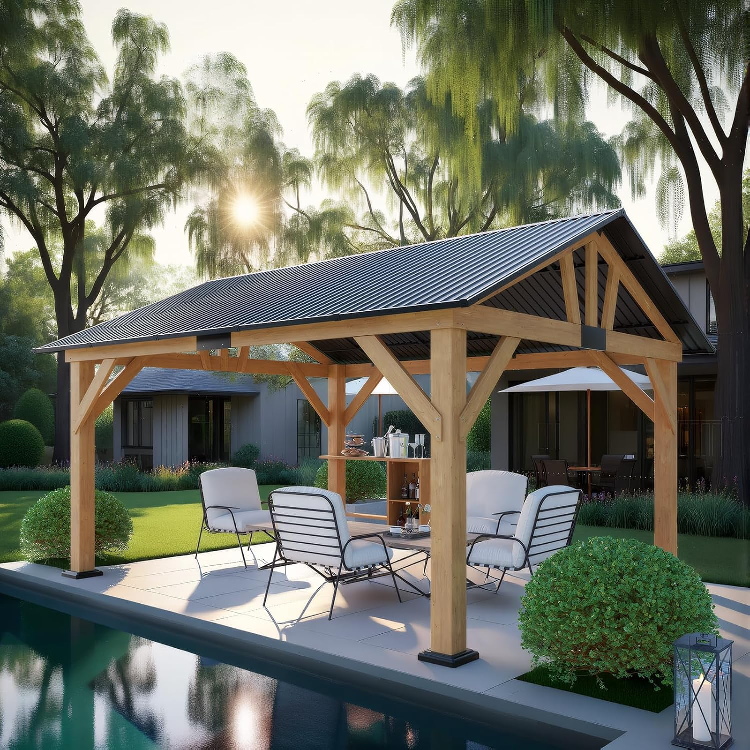 - Aesthetic Design: Aesthetic Design: Chic iron topped wooden gazebo with top beams for hanging items. Creating stunning outdoor spaces with our elegantly designed structures.