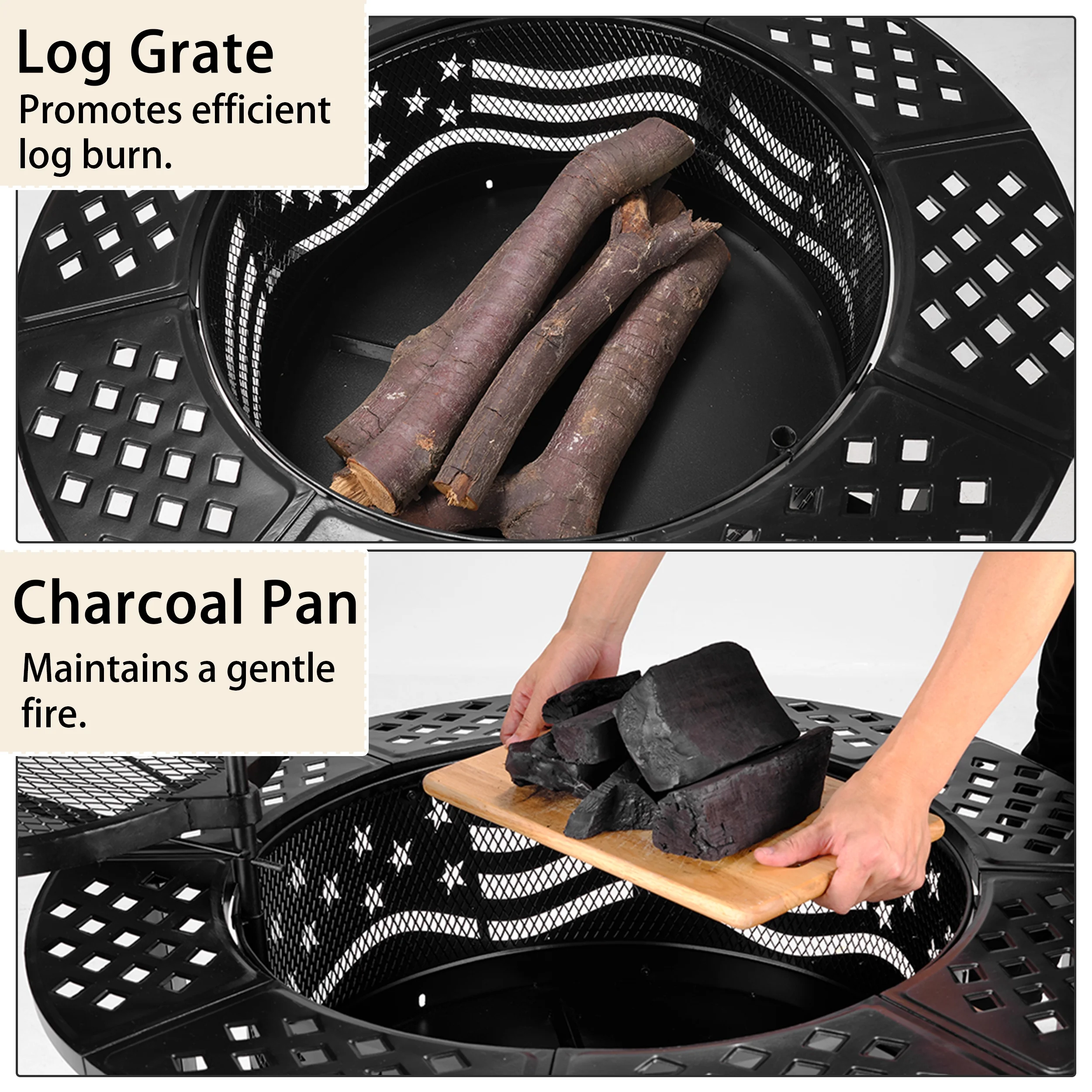 - �?strong>High Quality Materials for Long-lasting】Made from premium metal steel and coated with a high-temperature powder finish, this fire pits for outside with two grills offers outstanding resistance to heat, water, rust, and scratches, guaranteeing long-lasting endurance.