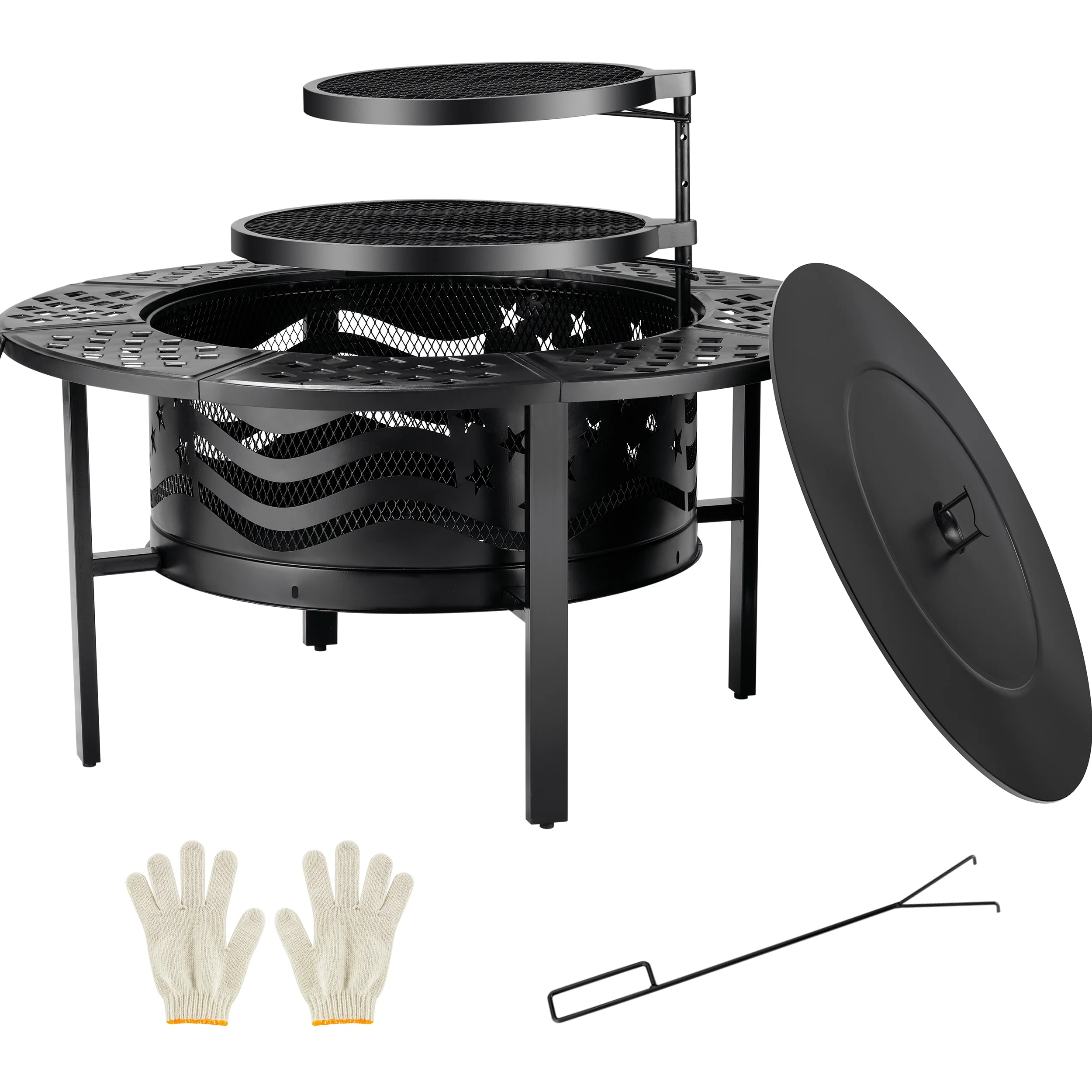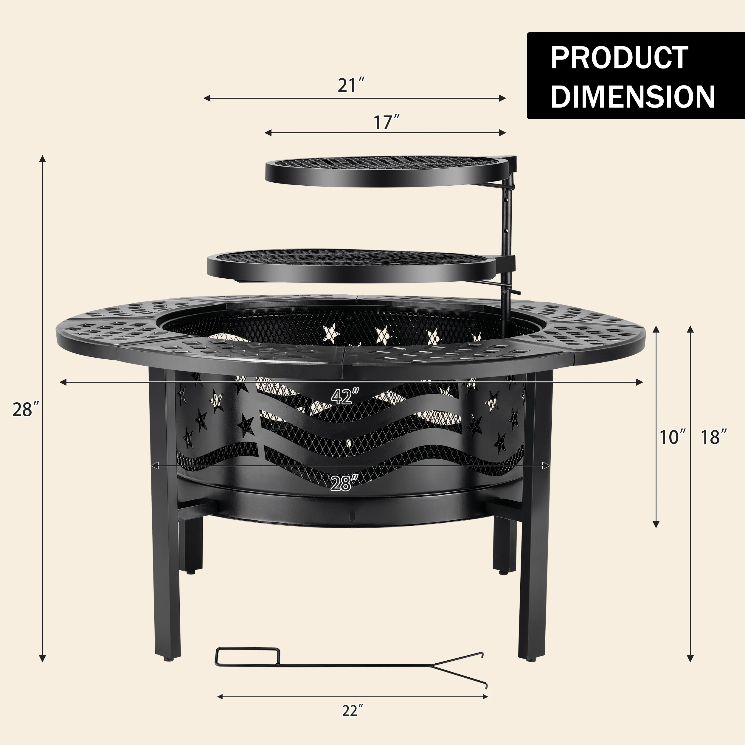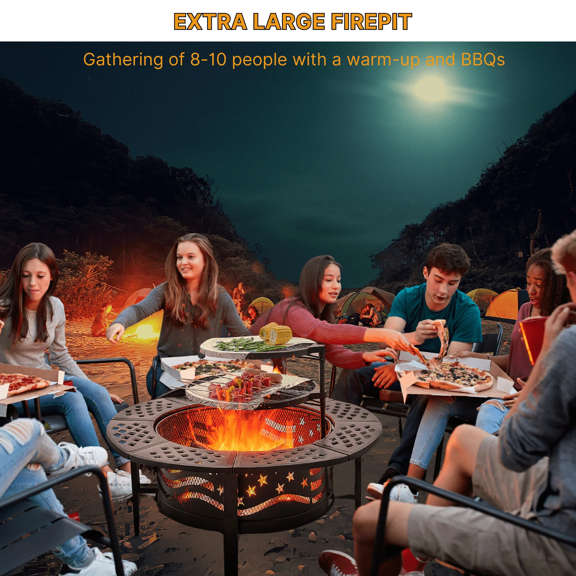 - �?strong>Multi-Functional Outdoor Fire Pit】This large fire pit features 2 adjustable cooking grills, 1 lid and tabletop. When you fix grills and tabletop to the fire pit, you can enjoy the roast and bonfire. When the lid is on, you will have a 42" round fire pit table for 8-10 people.