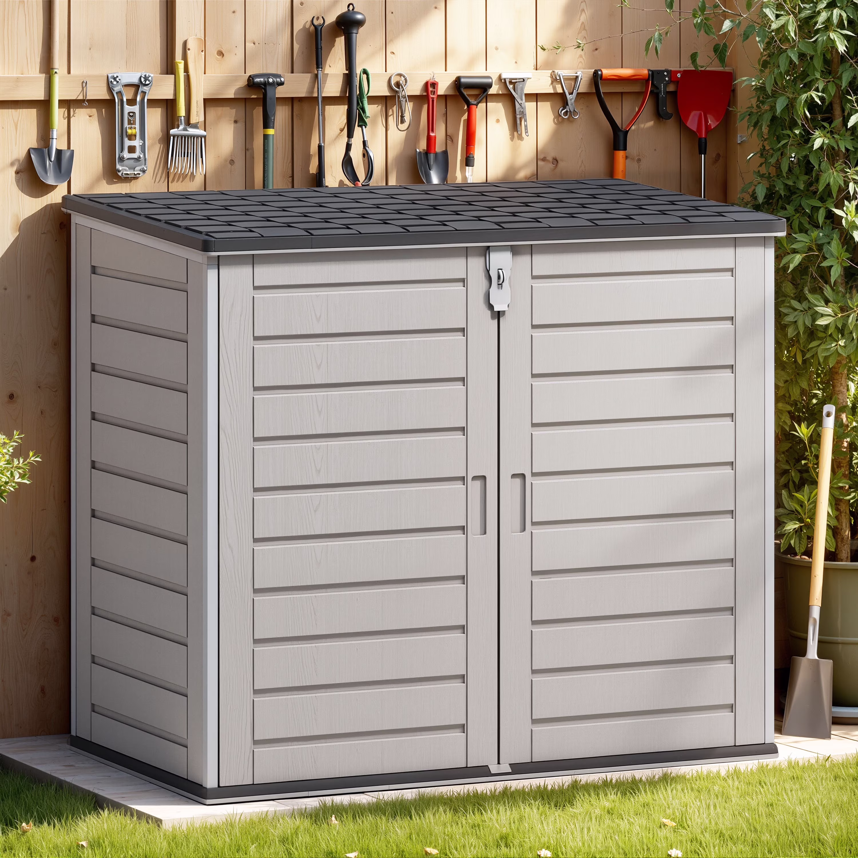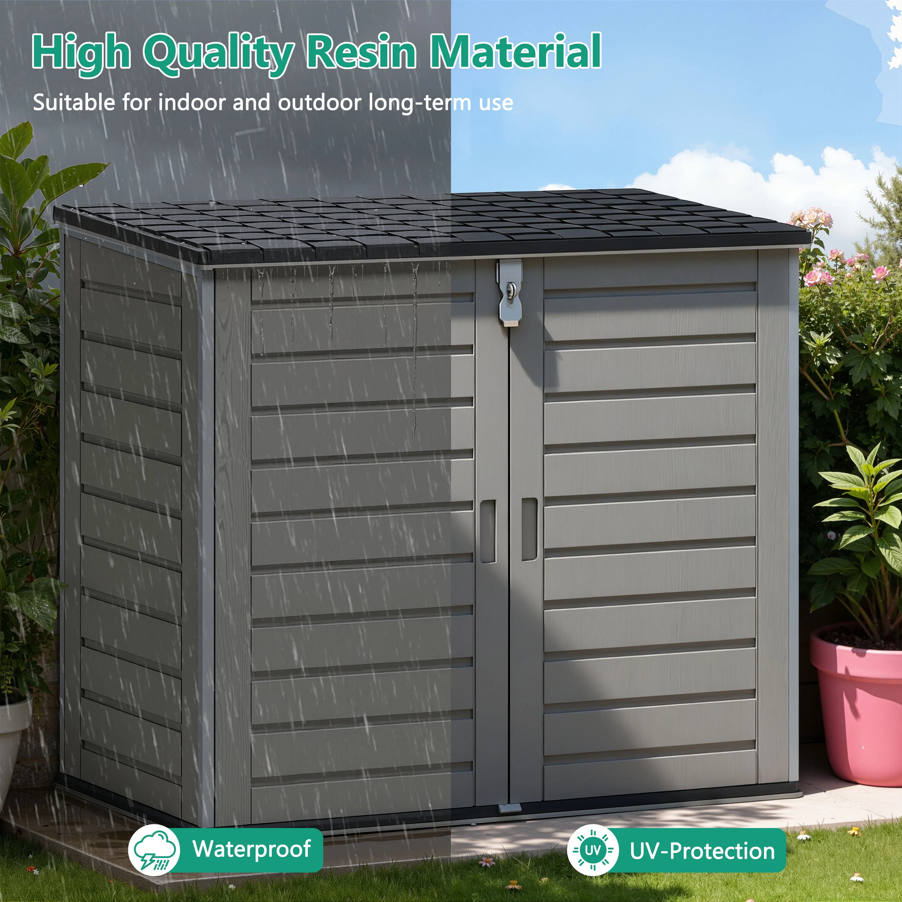 - 【MULTI-PURPOSE SHED】Our outdoor shed is perfect for storing garden tools, BBQ grills, bikes, trash cans, etc. If you want to reduce clutter and save space, placing a storage shed in your yard, garden, backyard, living room or pool is a good choice.