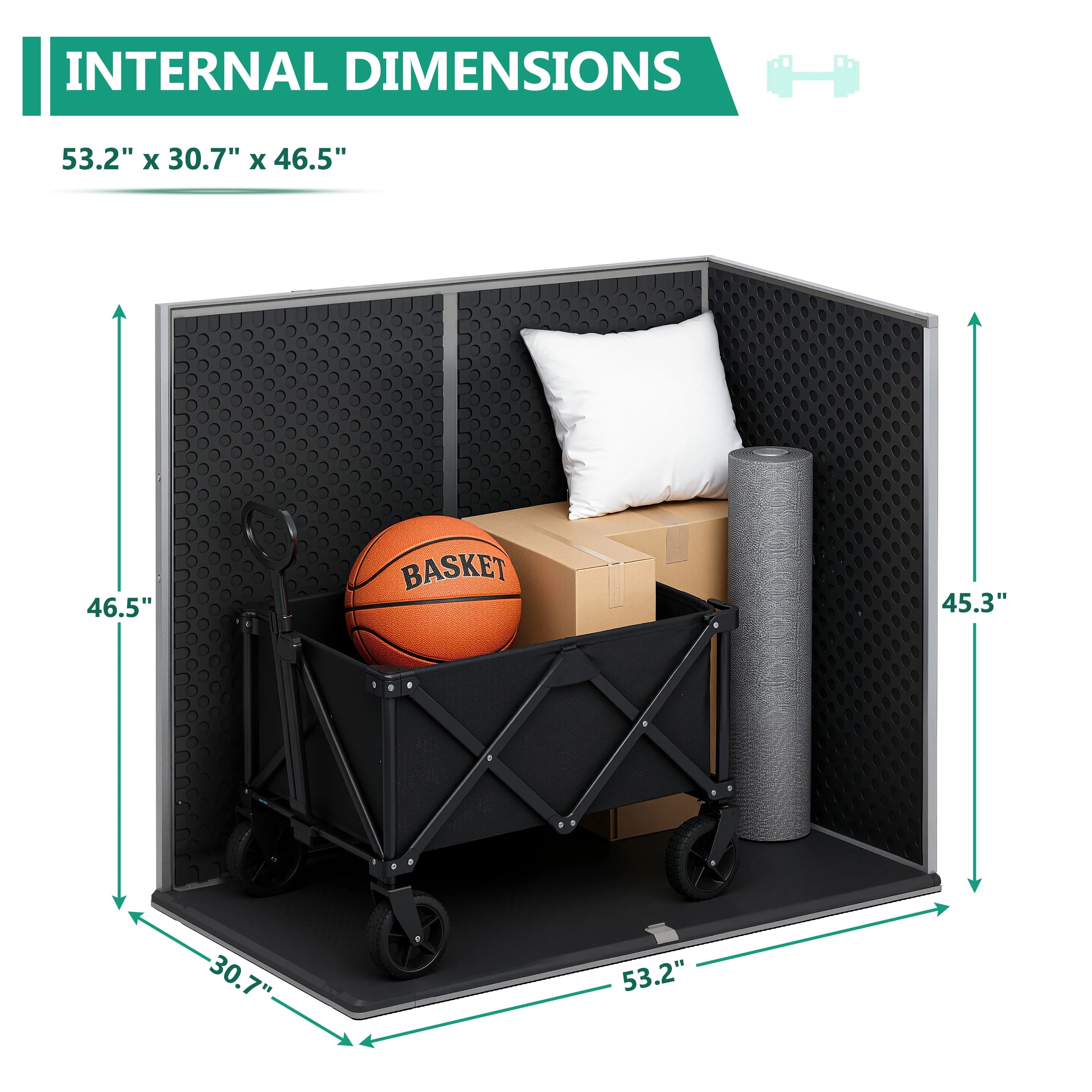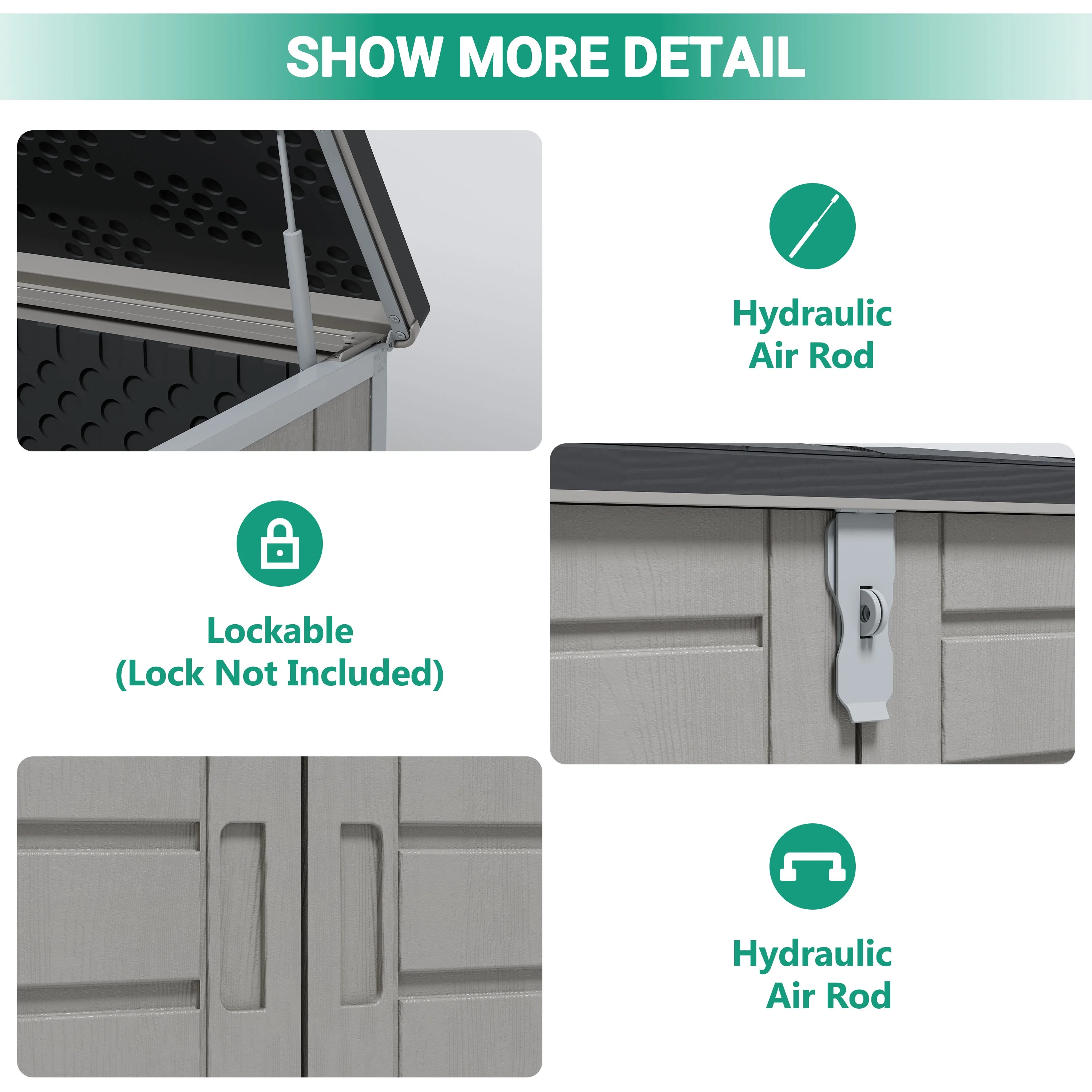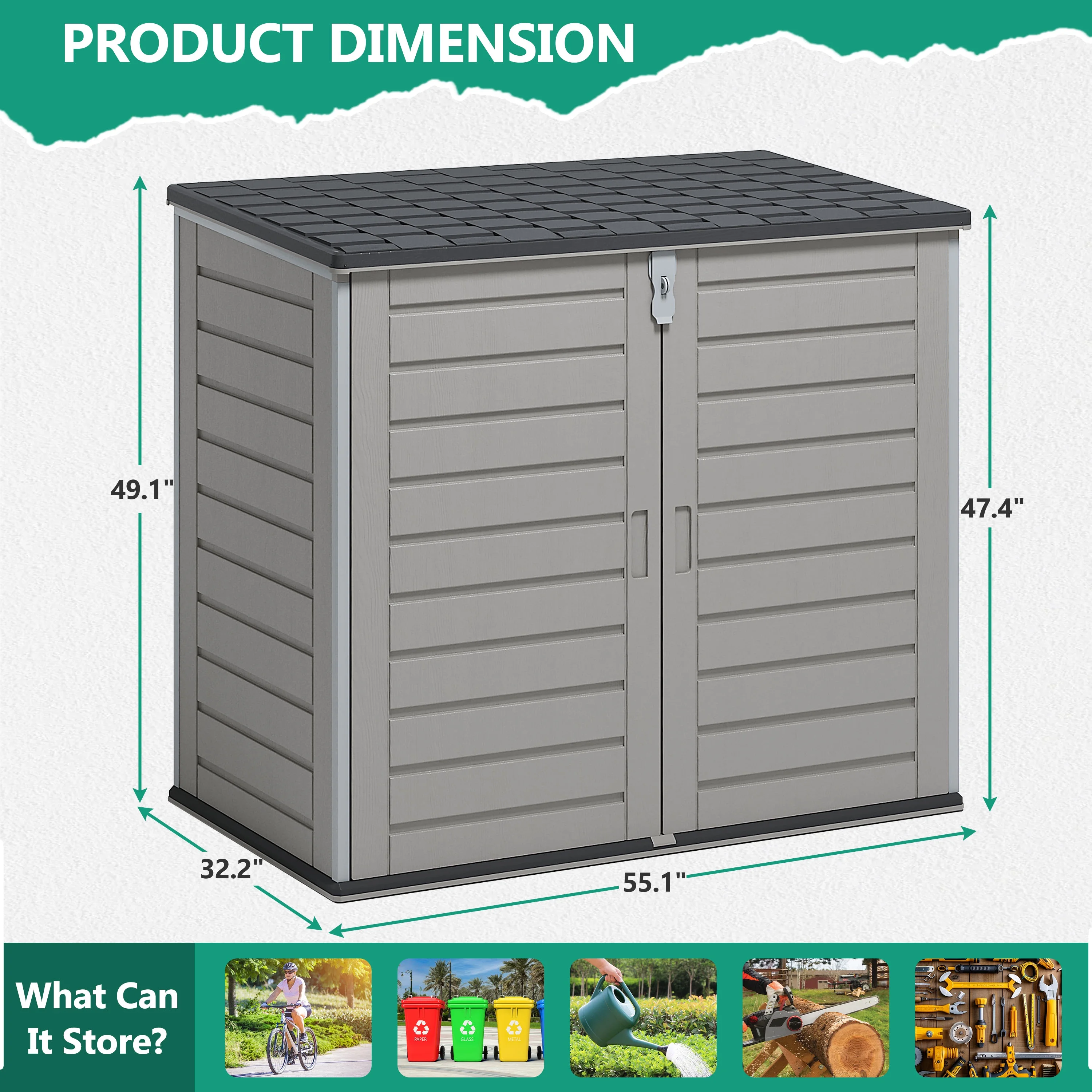 -- Larger capacity of 51 Cu Ft, that's perfect for storing garden tools, BBQ grills, firewood, bikes and trash cans, patio & pool accessories and more.