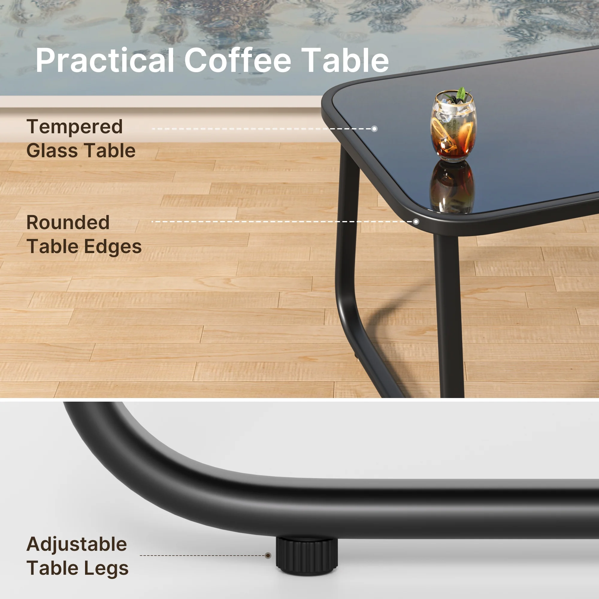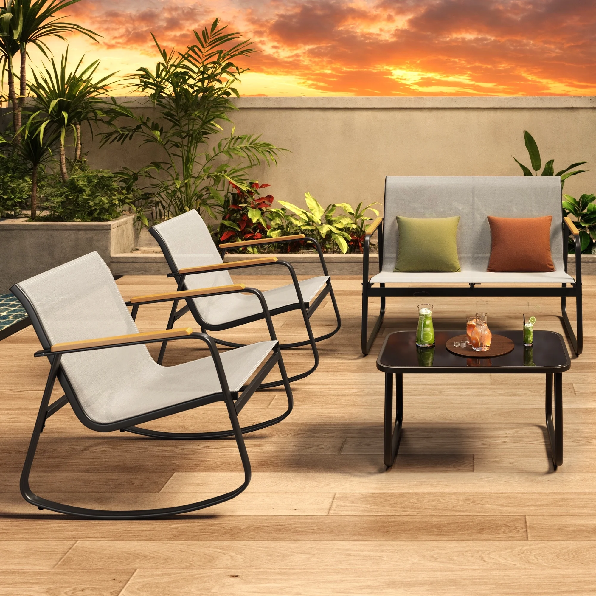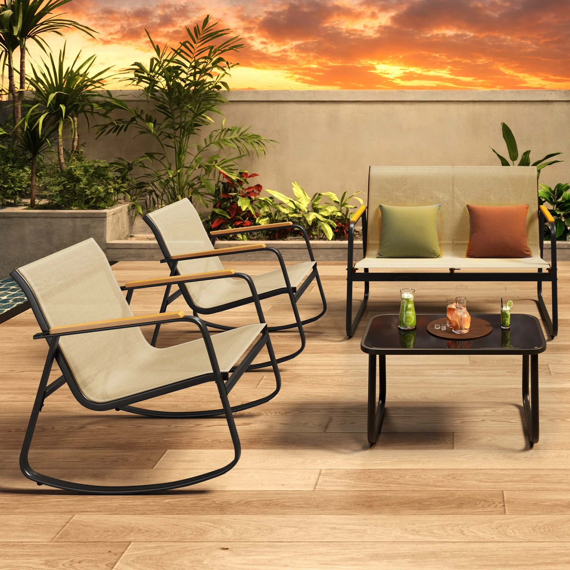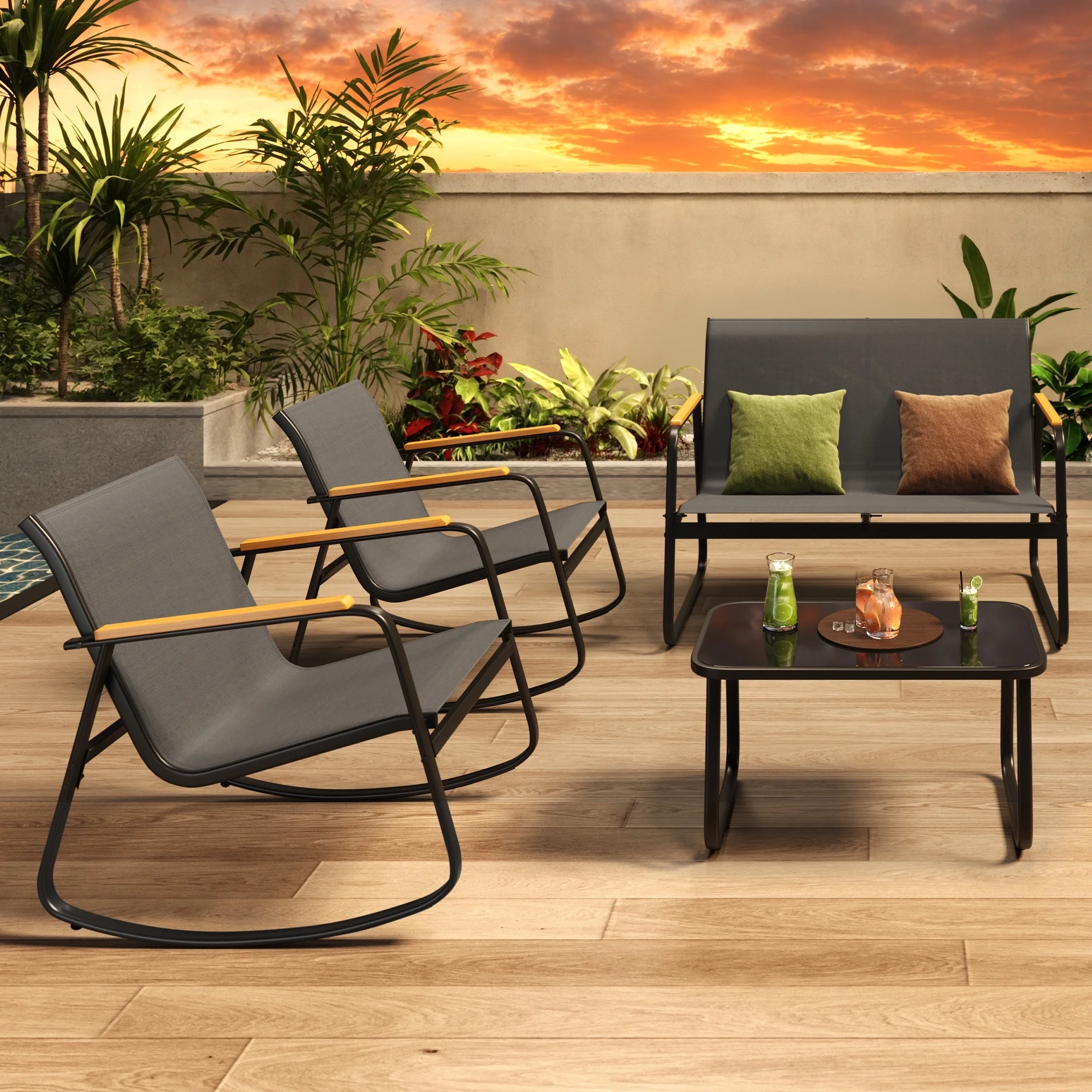 Patio Conversation Sets for 4, Lofka 4 Pieces Patio Furniture Sets with Rocking Bistro Fabric Chairs, Garden Loveseat, Glass Coffee Table for Backyard, Poolside, Porch, Lawn, Black