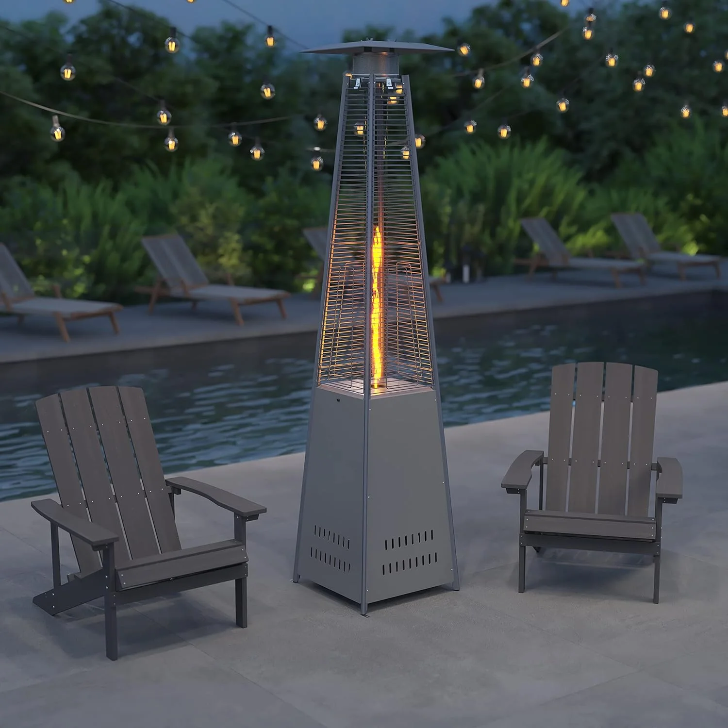 【A MESMERIZING CENTERPIECE OF DANCING FLAME�?/b>Standing at an impressive 89.37 inches tall, the patio heater immediately draws the eye with its elegant pyramid design. At its core, a mesmerizing column of fire dances safely within a quartz glass tube, creating a hypnotic visual that is guaranteed to captivate your guests. This dynamic flame provides not only exceptional warmth but also a luxurious, ambient glow that elevates any atmosphere, turning an ordinary night into an unforgettable experience.