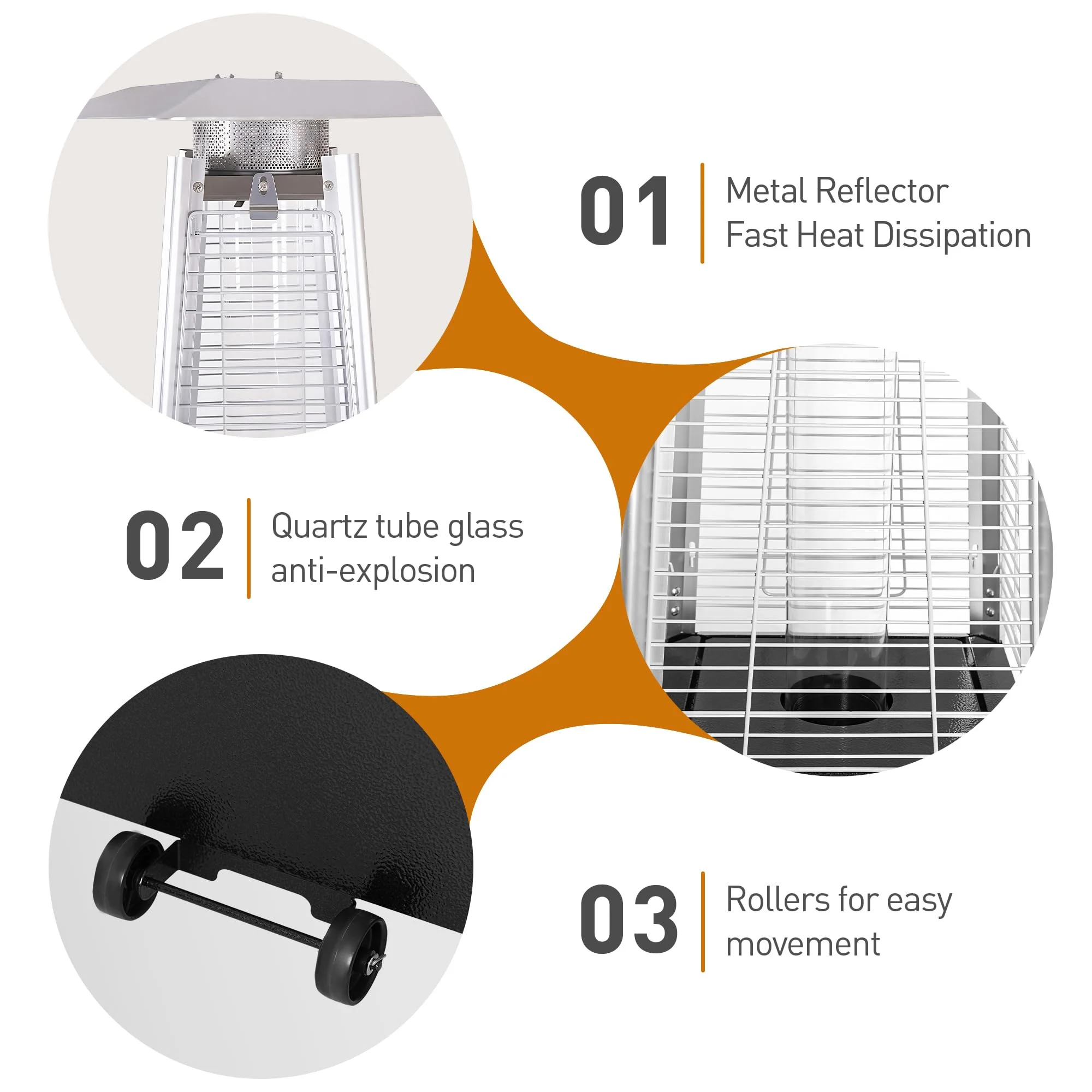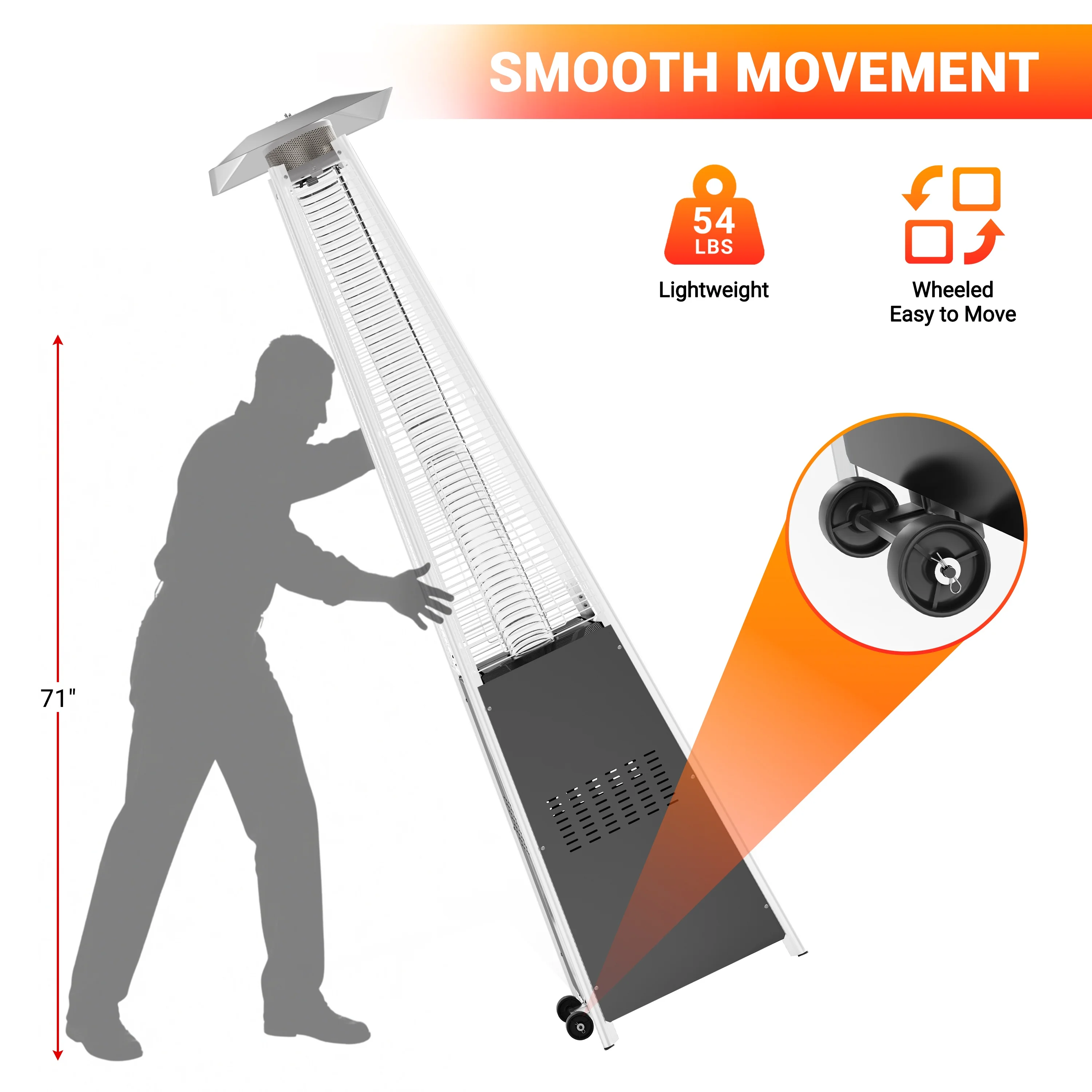 【UNCOMPROMISING SAFETY & UNMATCHED CONVENIENCE�?/b>Your peace of mind is paramount. That's why we've integrated a crucial auto shut-off safety switch that instantly cuts the fuel supply if the Heater is tilted more than 45 degrees. For added security in windy conditions, we've also included ground stakes to anchor the unit firmly in place. Starting it up is effortless with the simple, reliable push-button electronic ignition. And when you need to change your layout or store the unit, the smooth-rolling wheels at the base make repositioning it anywhere on your patio a breeze.