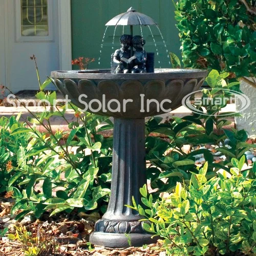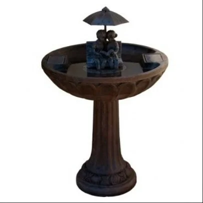 - Features an antiqued bronze finish, umbrella waterfall, and statue of a boy and girl reading on a bench