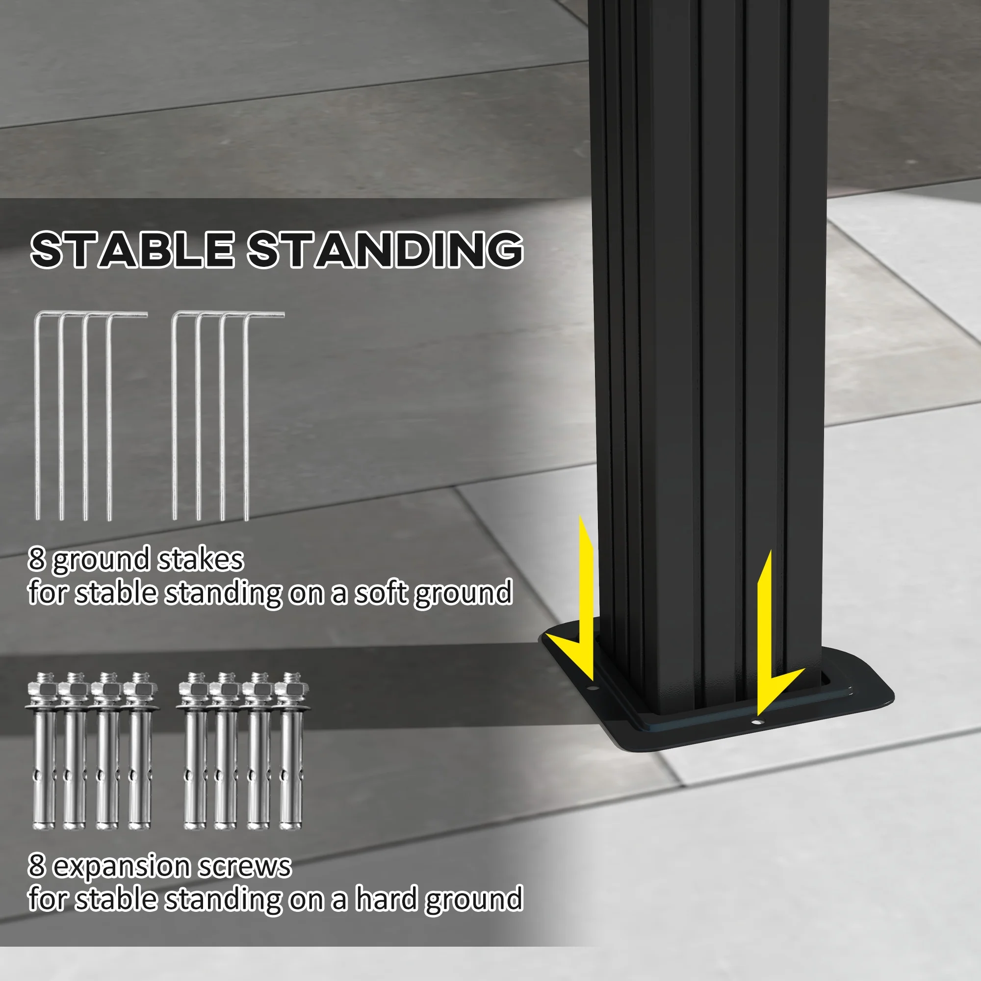 - Accessories Included: Make use of the included stakes or expansion screws to mount pre-drilled feet to soft or hard ground, respectively.