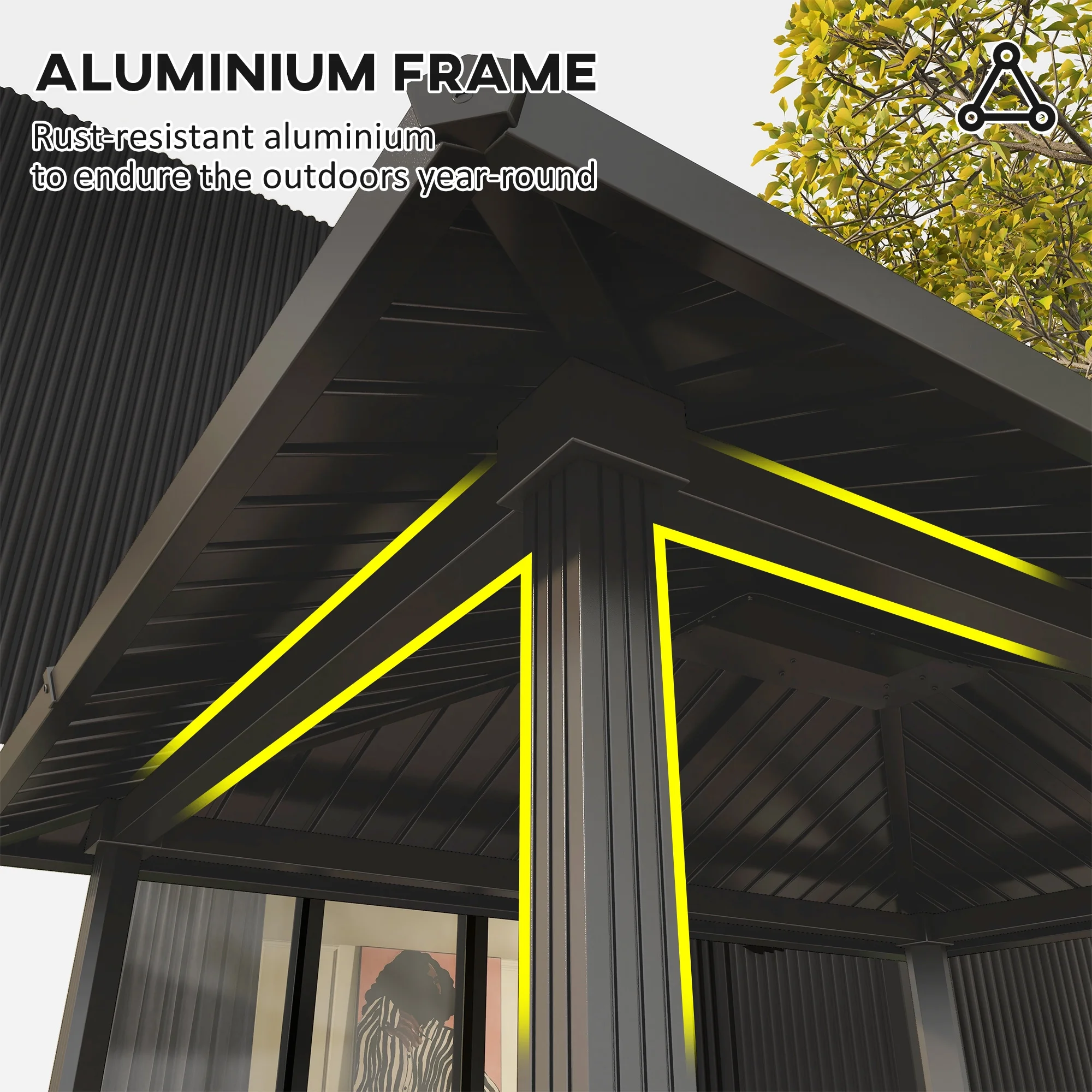 - Aluminum Frame Hardtop Gazebo: Offers a hard frame made of rust-resistant aluminum to endure the outdoors year-round.