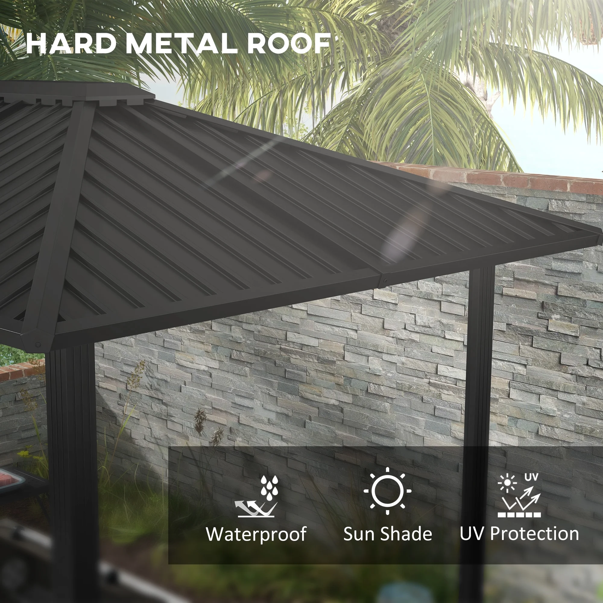 - Hard Metal Roof: Our gazebo for grill's roof is made with metal panels to be an enduring shelter against sun, UV and rain.