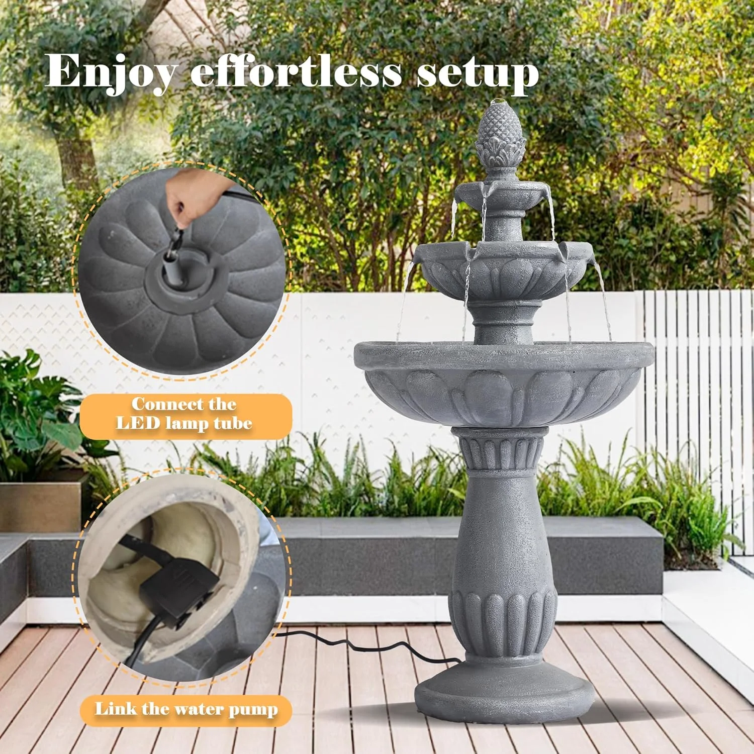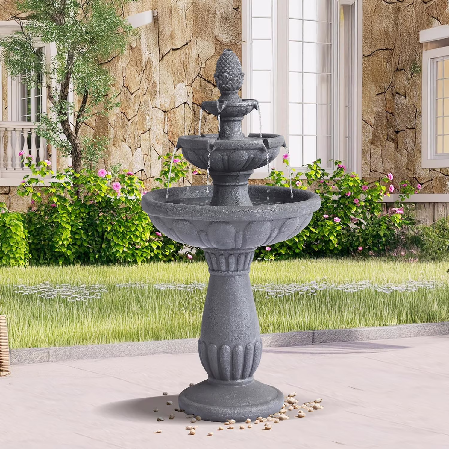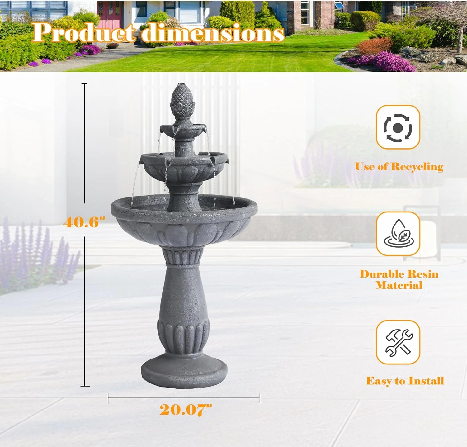 Designed to bring you the best outdoor relaxation experience, the Italian outdoor fountain with pineapple top is the perfect center for your outdoor space. Classic Italian styling adapts to both indoor and various outdoor spaces such as gardens, backyards, and porches. The water flows from the top of the pineapple, and the 3 tiers of running water created by a total of 10 water outlets simulate the sound of a waterfall, providing you with the ultimate relaxation. The garden water fountain is made of durable resin material that is rust and heat resistant, and the solid base ensures longevity in outdoor use