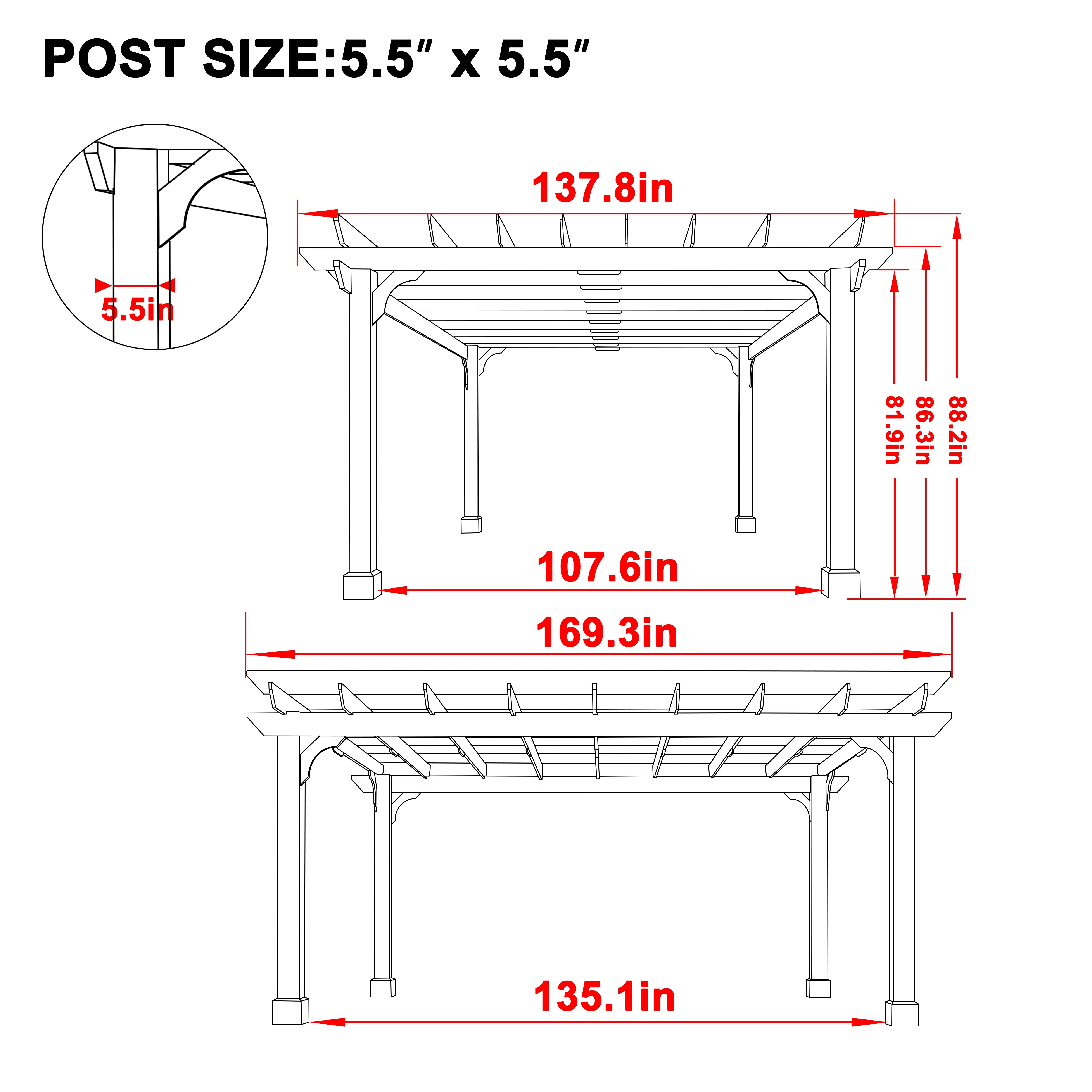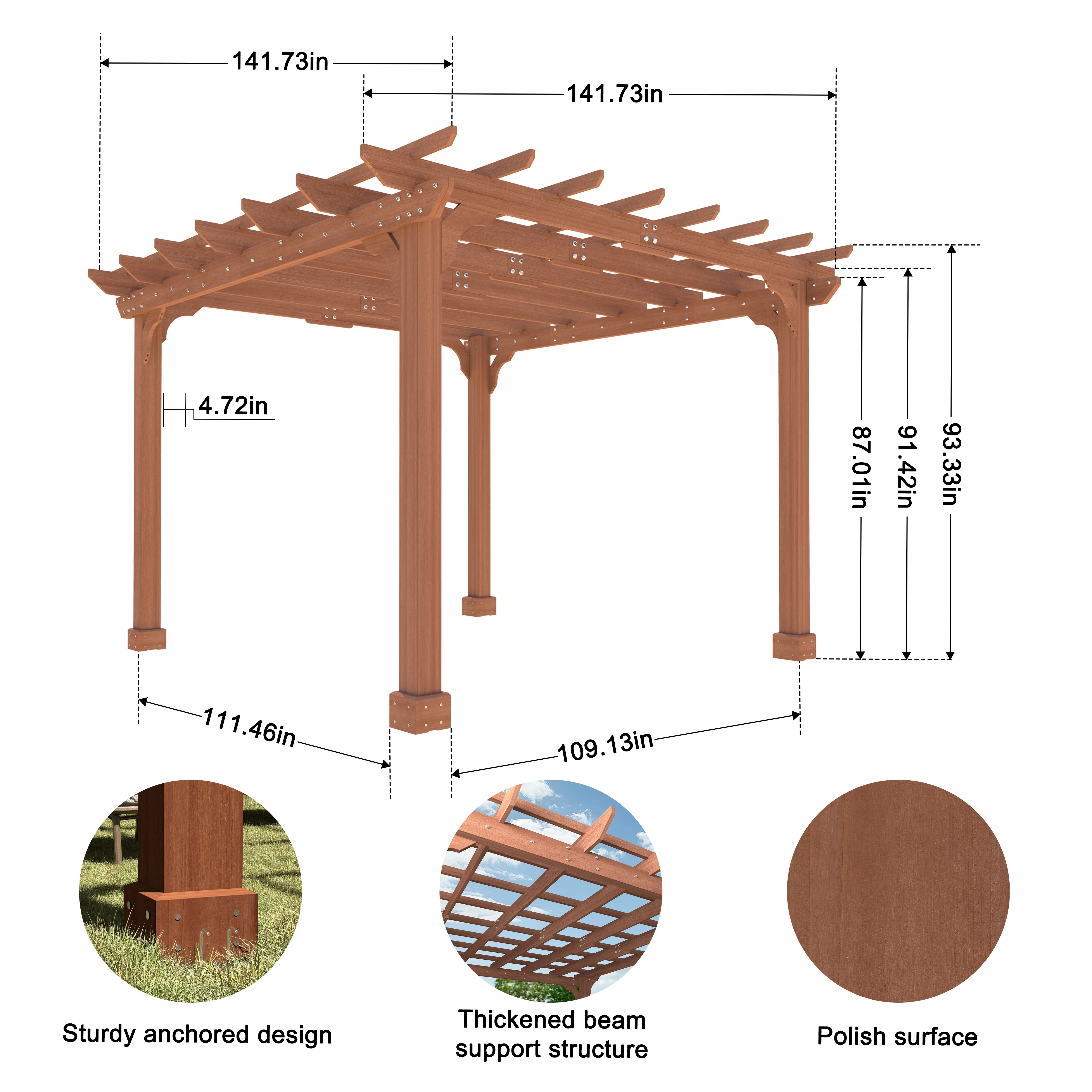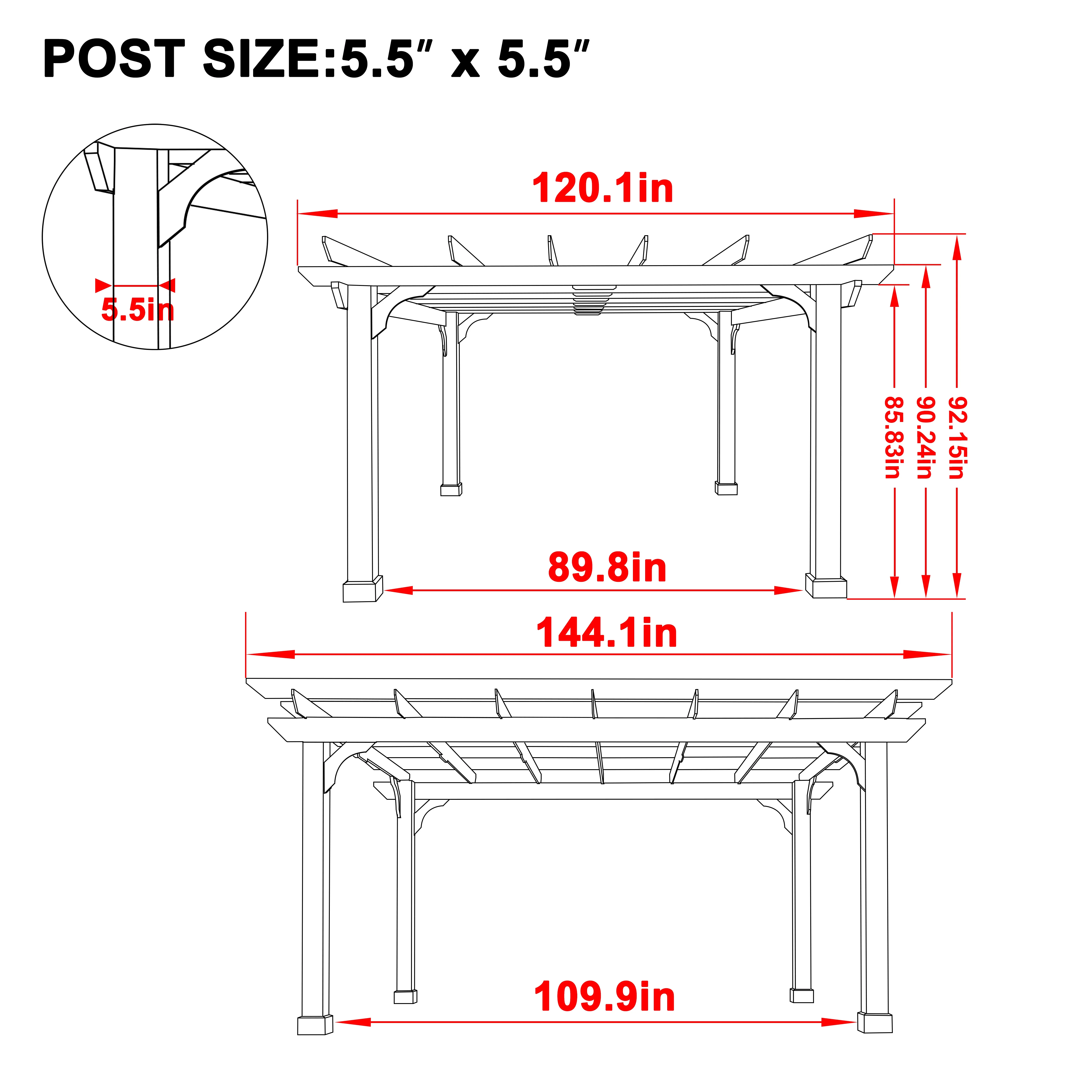 - The outer size of outdoor wooden pergola gazebo: 144''L x 120''W x 92.5''H. Inner size of wood pergola: 111.8''L x 91.7''W x 82.6''H. Maximum entry height of patio pergola: 85.8''.