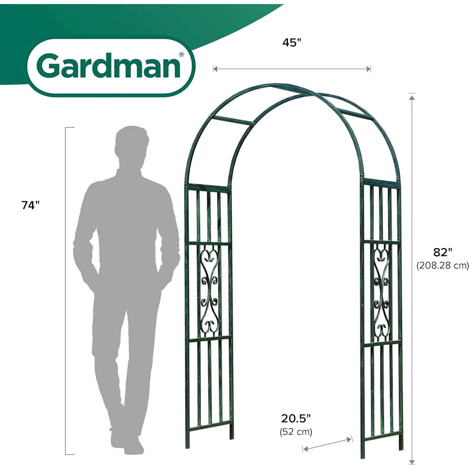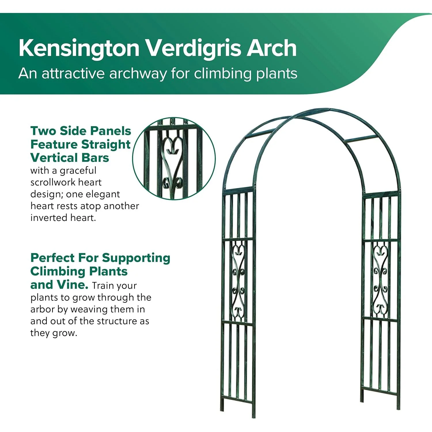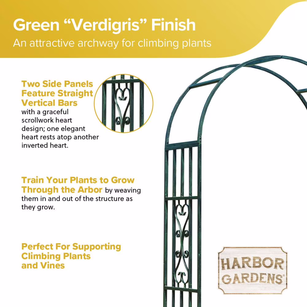 - Two side panels feature straight vertical bars with a graceful scrollwork heart design; one elegant heart rests atop another inverted heart. Perfect for supporting climbing plants and vines. Train your plants to grow through the arbor by weaving them