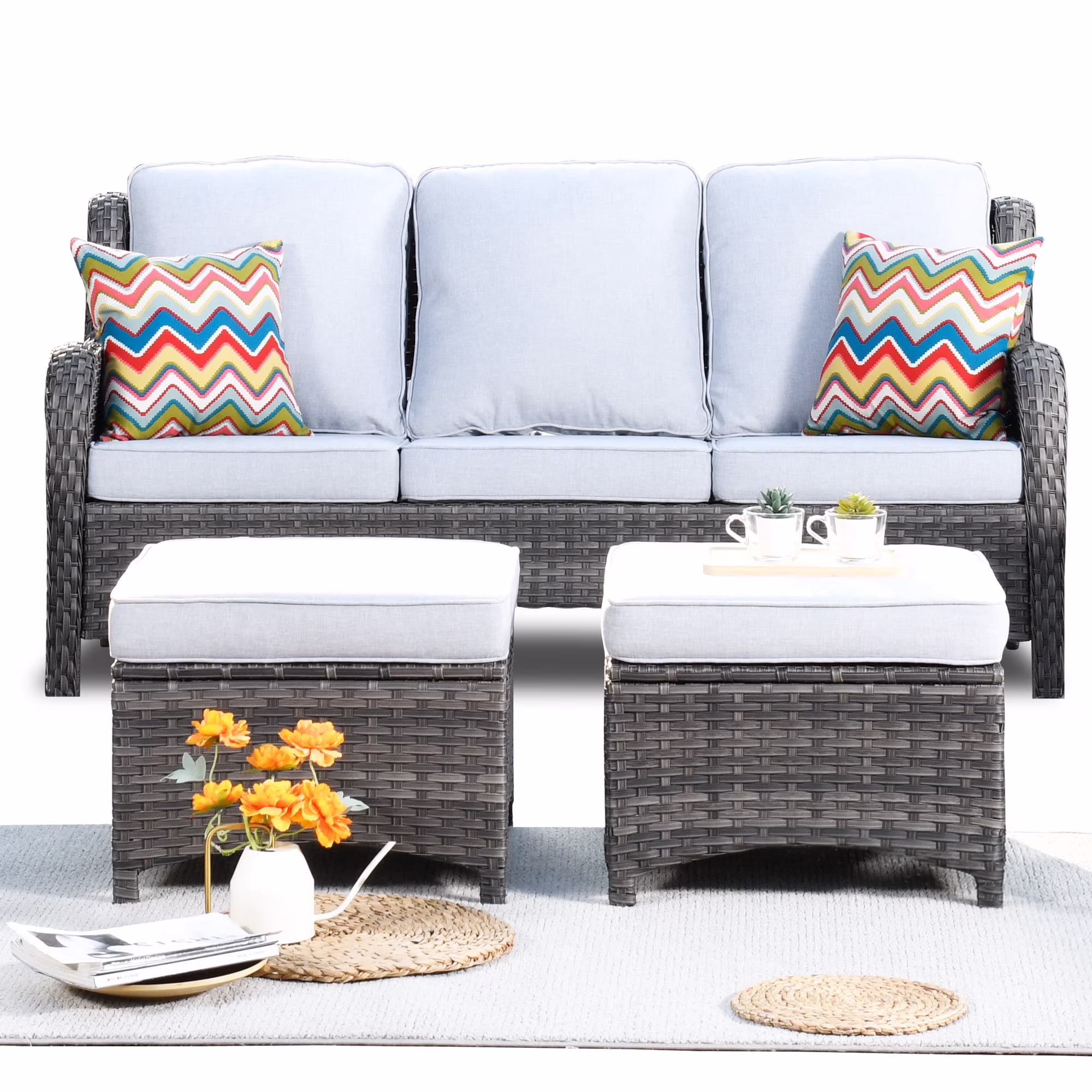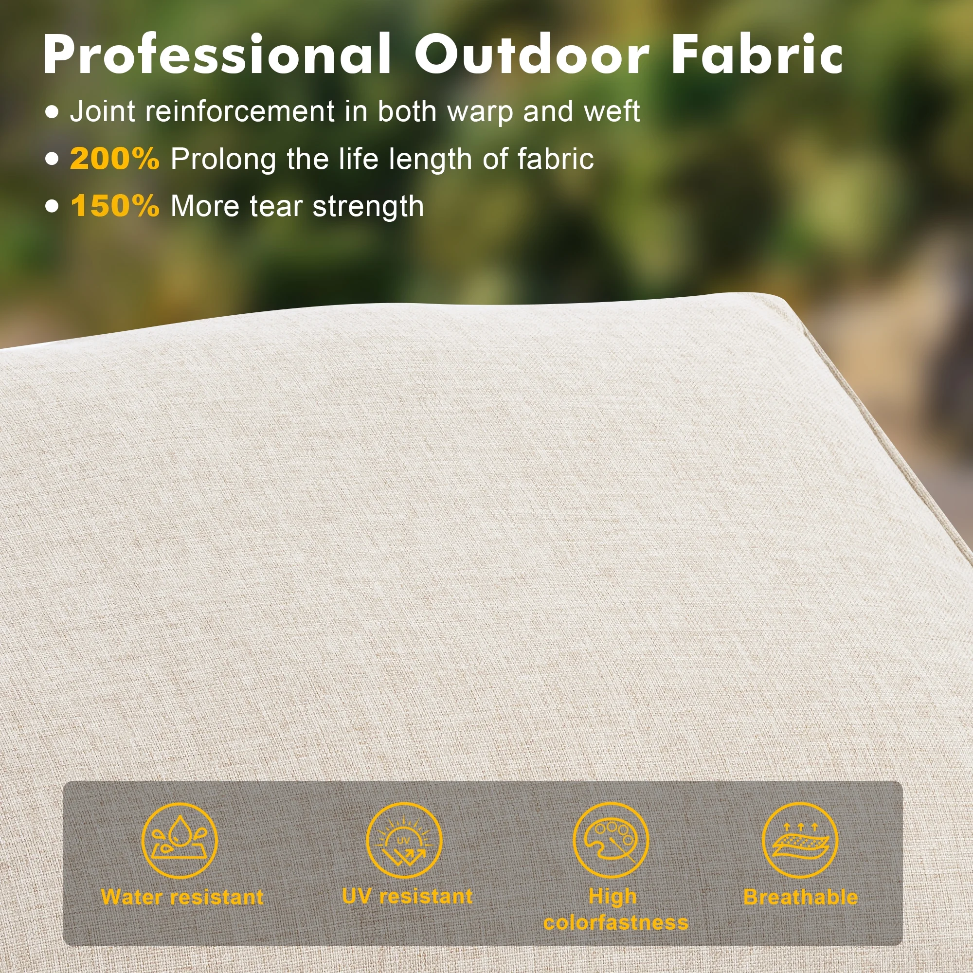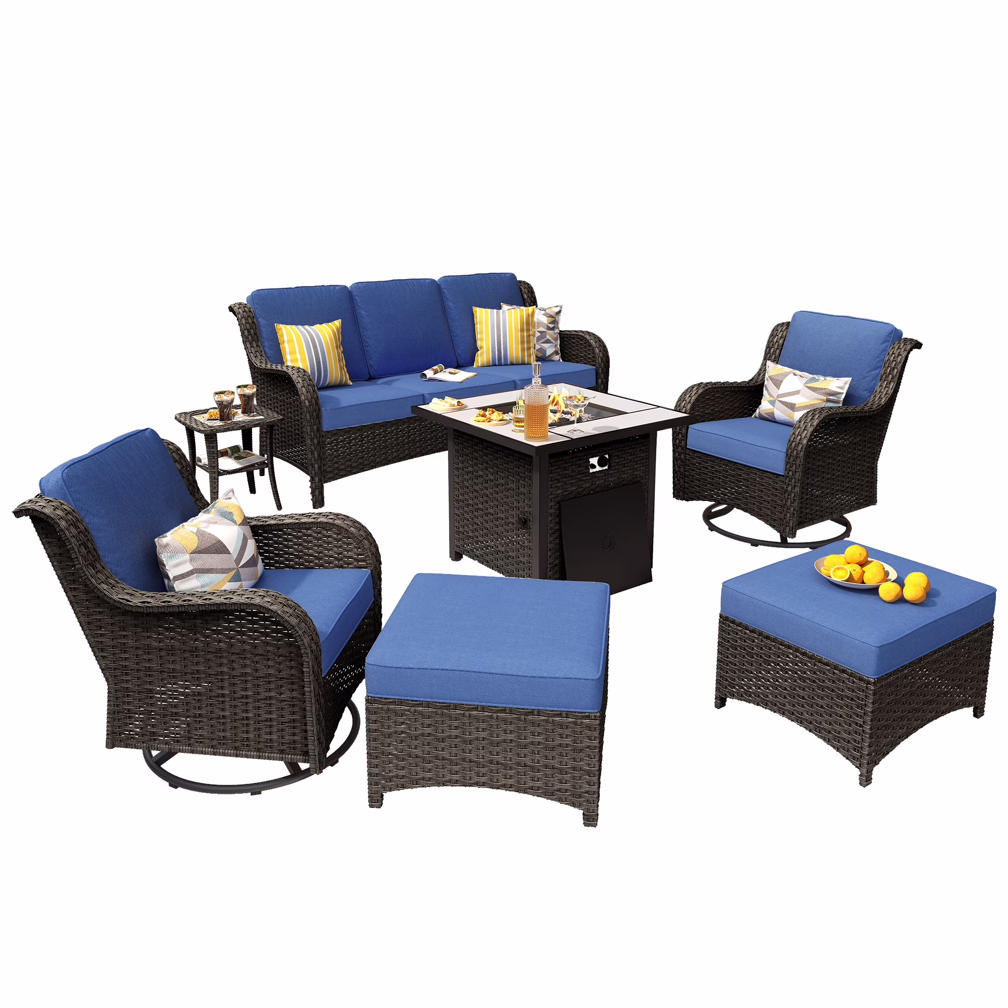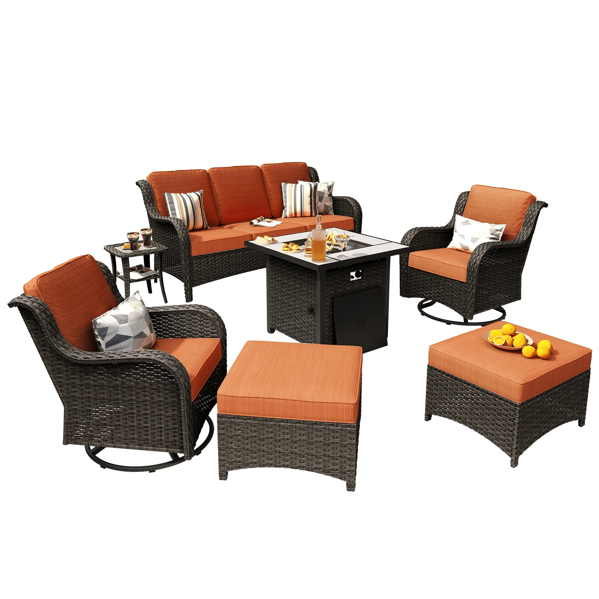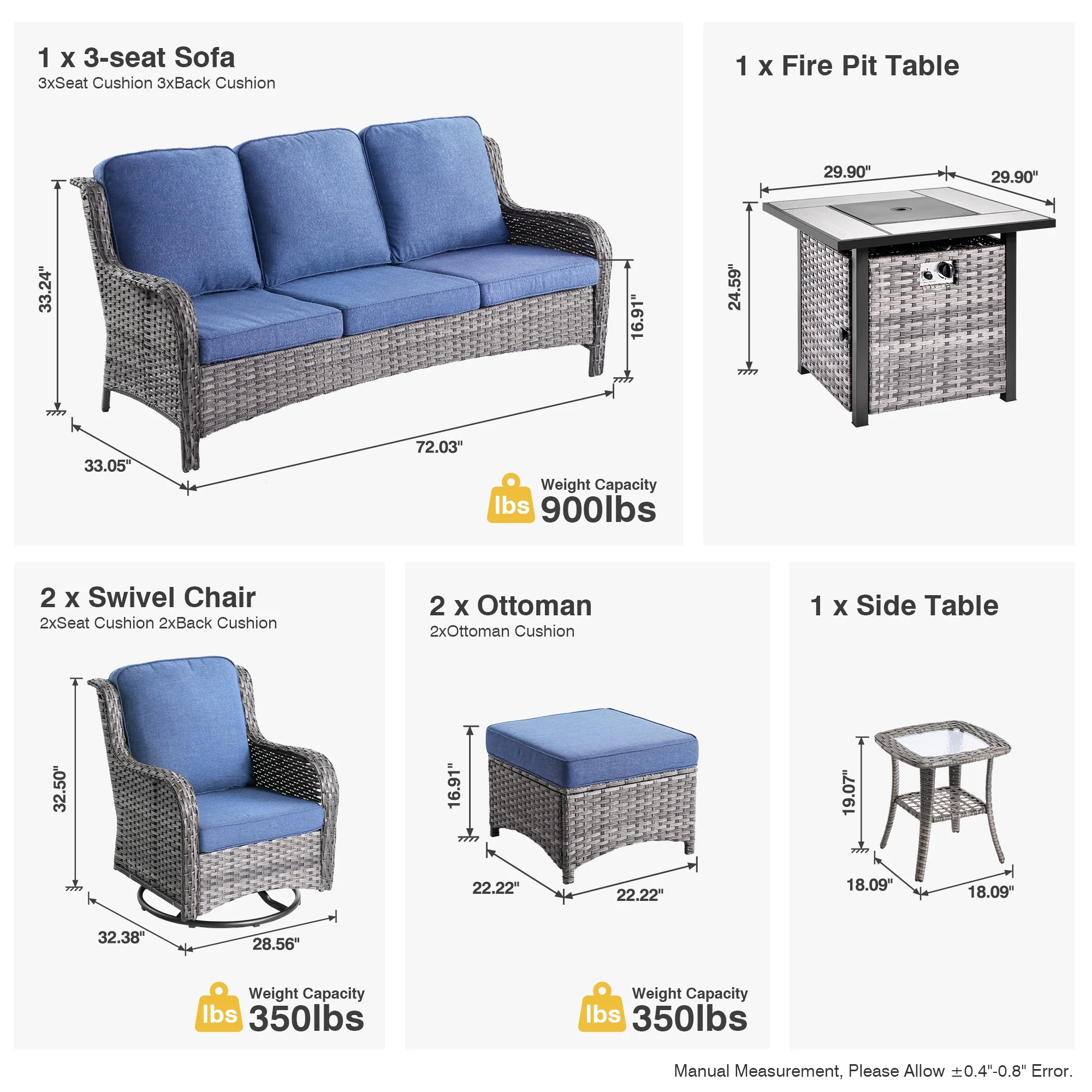 - 7 Pieces Outdoor Sectional Furniture: The set includes a 3 seater patio couch, 2 swivel chairs, a side table, 2 ottomans, and a fire pit table, allowing for versatile arrangements for various outdoor activities