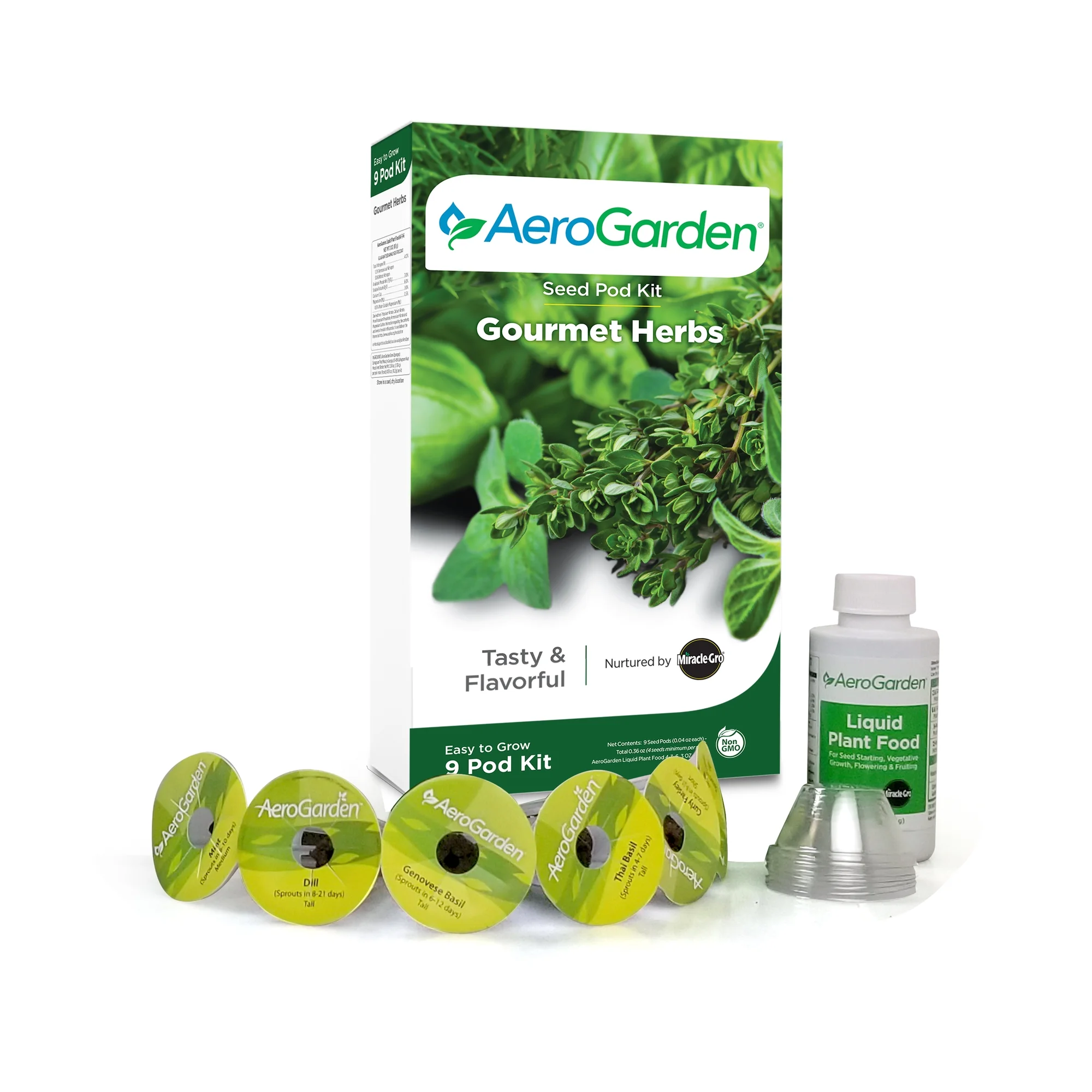 - Includes the Gourmet Herbs Seed Pod Kit, featuring Genovese Basil (2), Curly Parsley, Dill, Thyme, Thai Basil, Mint, Chives, and Italian Parsley