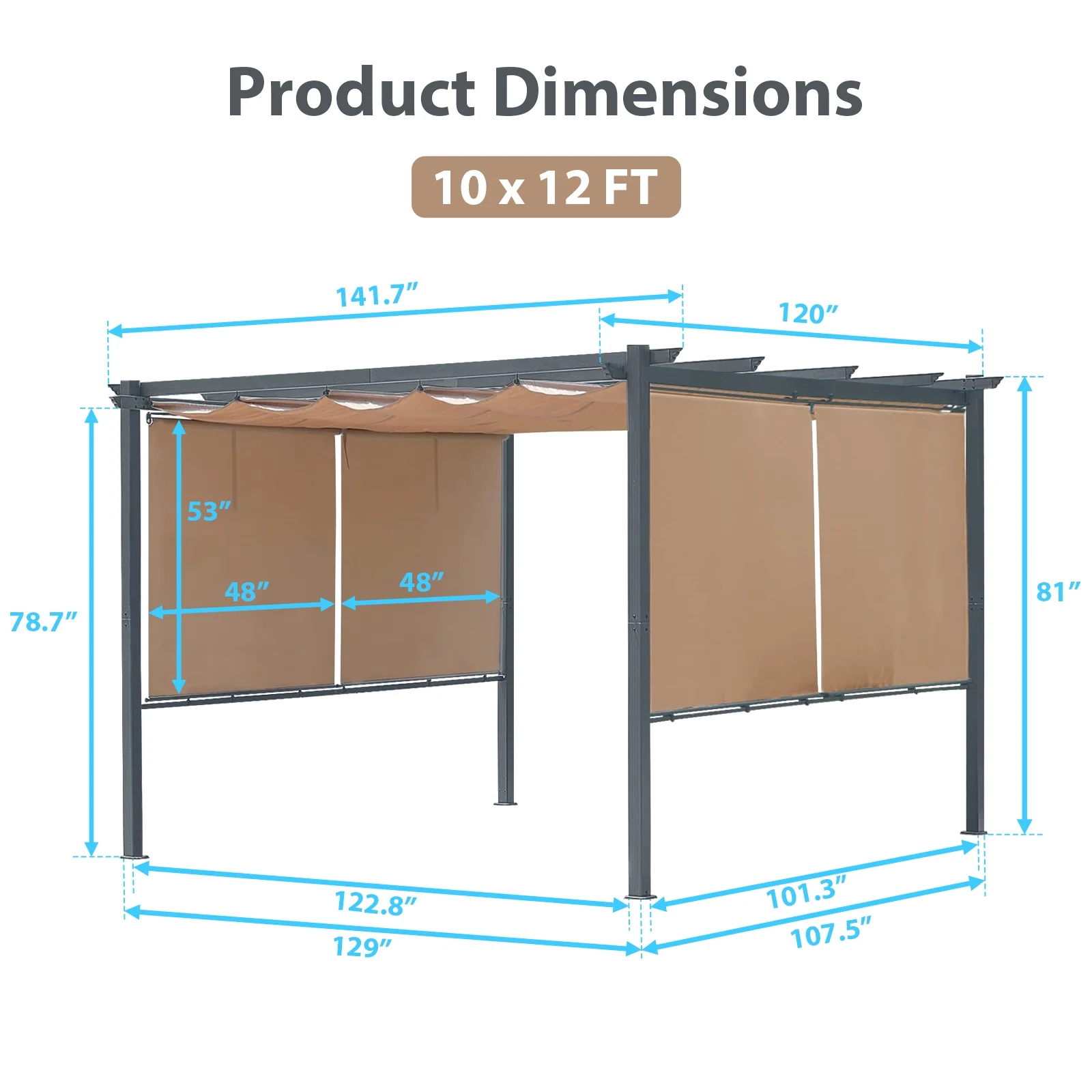 - Dimensions - 12' x 10' of Outermost; 10.8' x 9' of Inside Framework. Perfect shelter for sunblock or light rain.