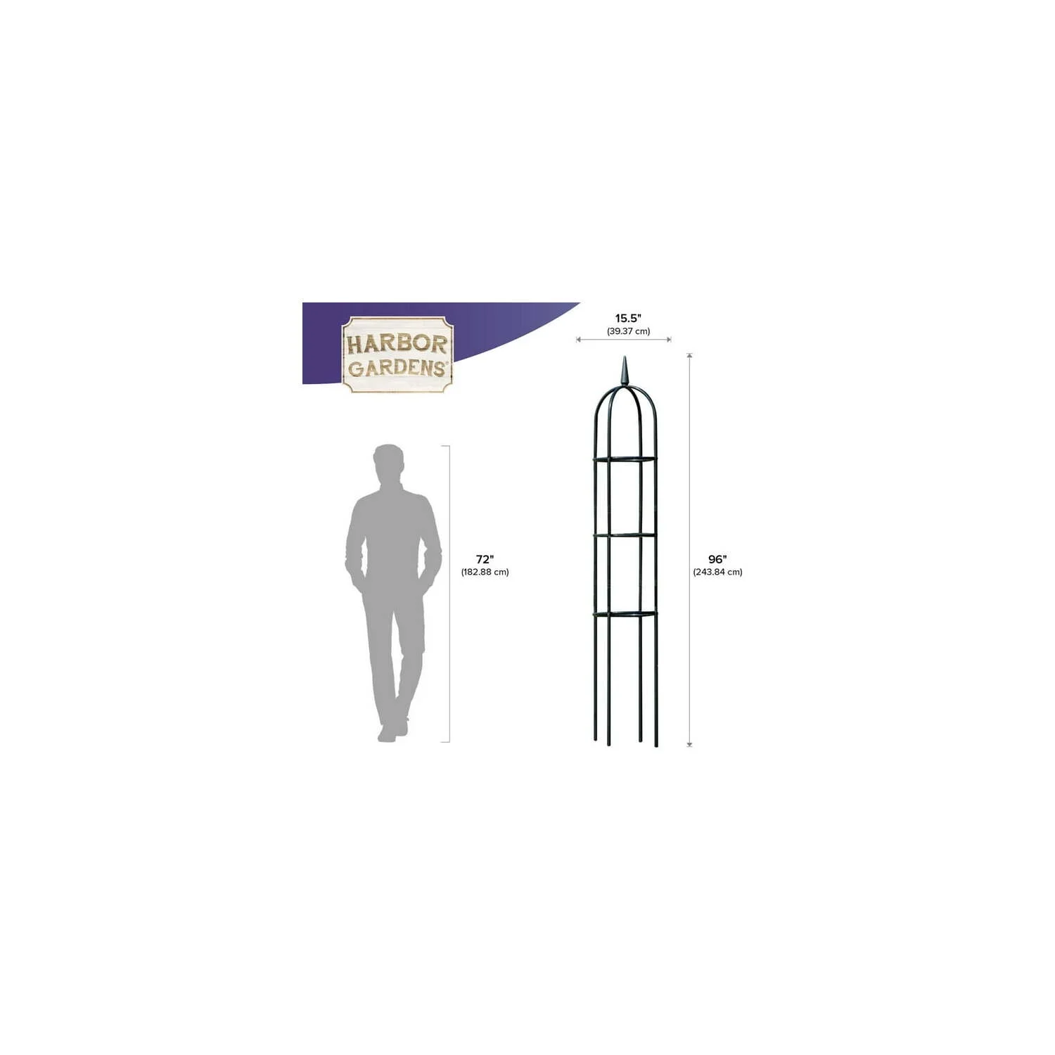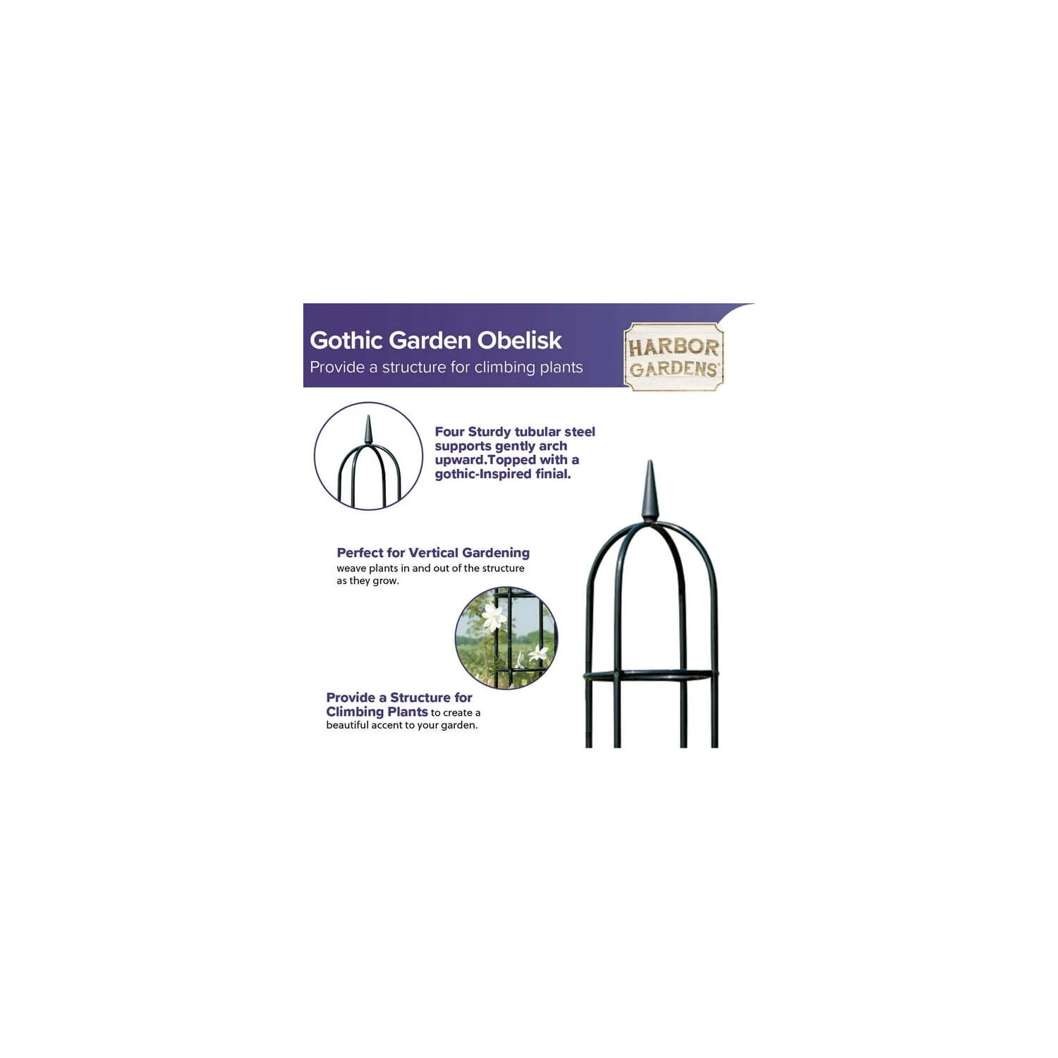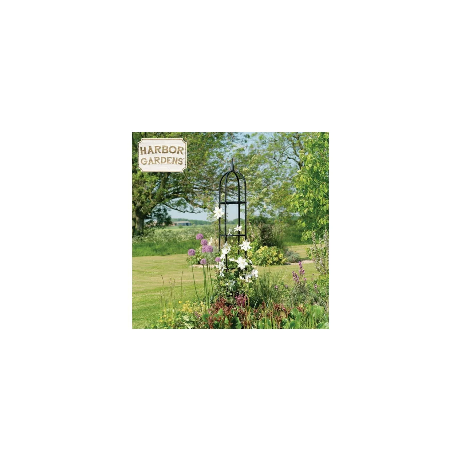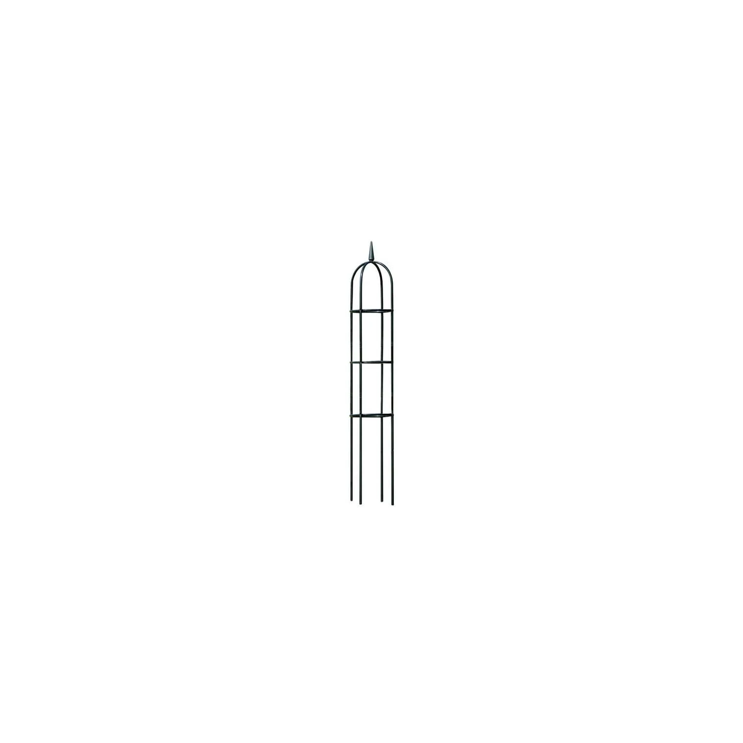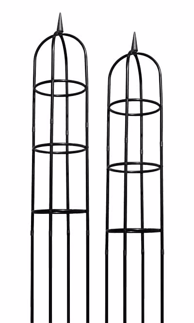 - Garden Obelisk featuring four sturdy tubular steel supports that gently arc upward adding height and variety to your garden, beds, borders, and containers. Accented by a bold spear cone on top.