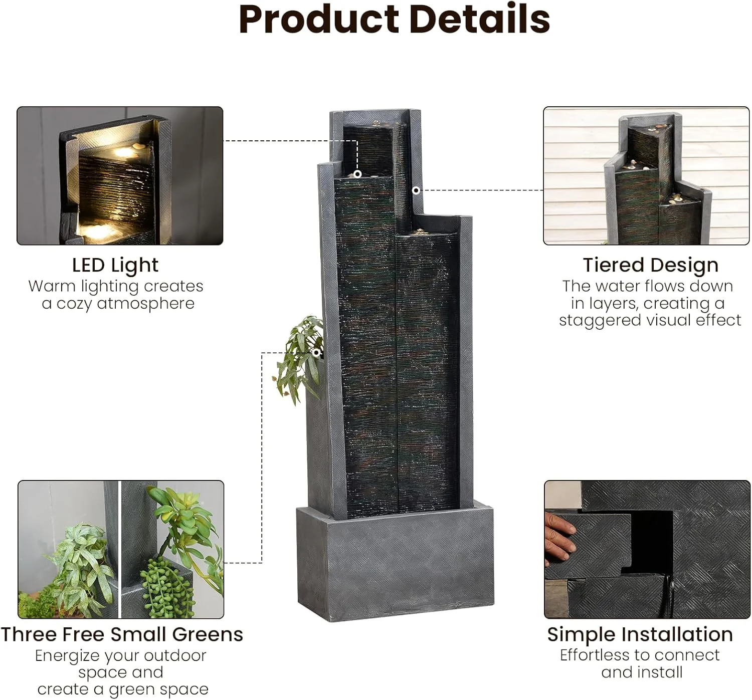 - Dimentions & Packaging: Sized at 13.97"L x 8.07"W x 39.37"H, perfectly fitting into your water fountain decor. Simple assembly includes lights and pump. The package comprises the Garden Fountain (25.4LB)1, Transformer with 6ft Power Cord1, Pump1, and Instruction1.