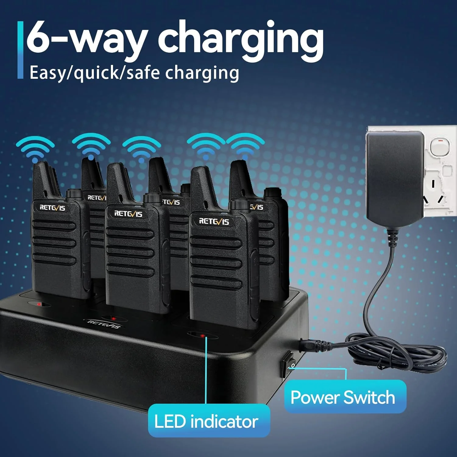 - Includes six way multi gang charger; with multiple charging protections; overcharge; over voltage and short circuit protection; more safer for charging the 6 pack 2 way radios at the same time