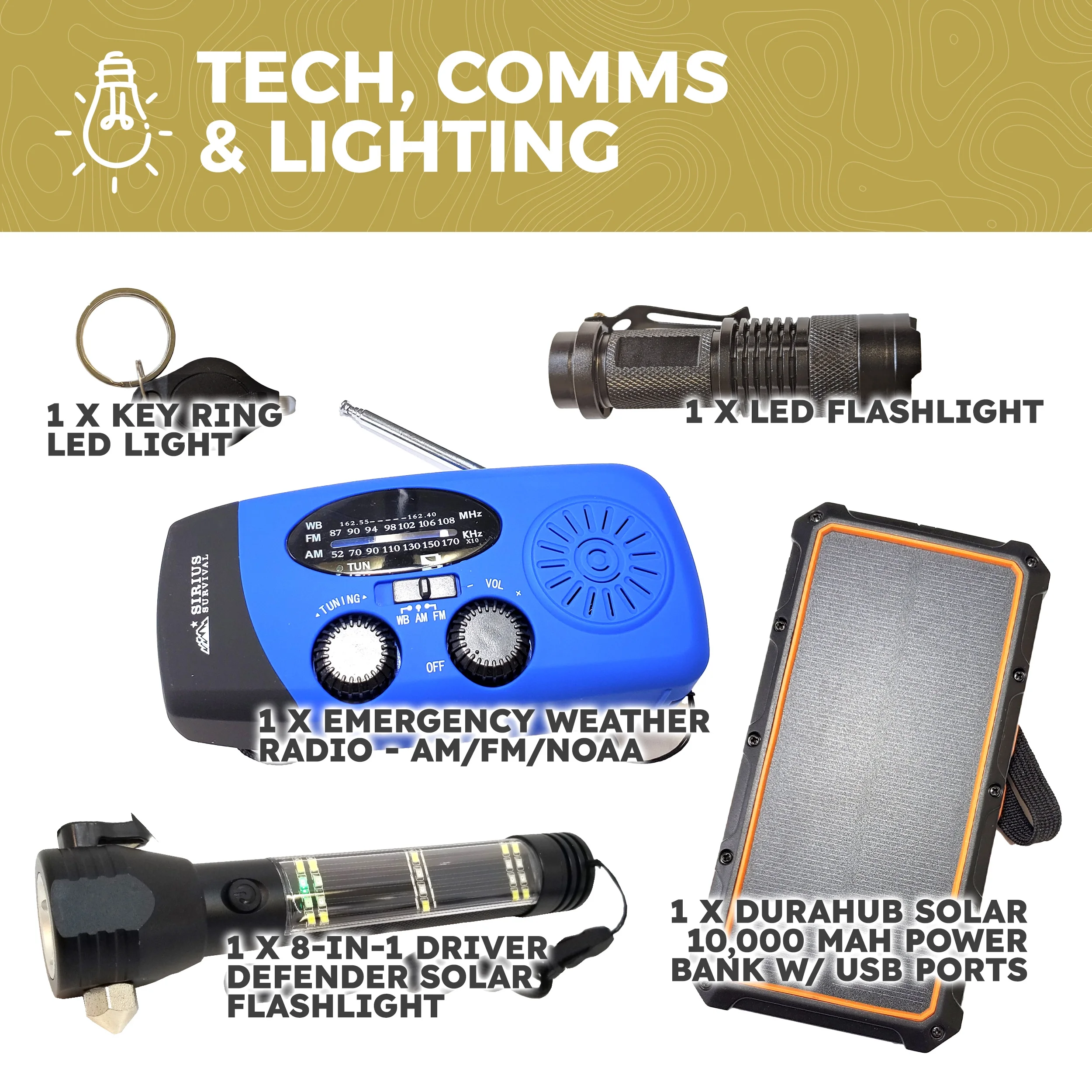 - 72 Hour Support for 2 - Stocked with First-Aid, warmth, communication, tools, food and water. Also plenty of room to add your own items and clothing.
