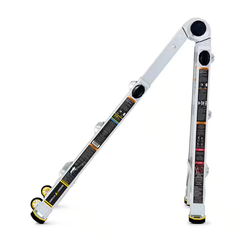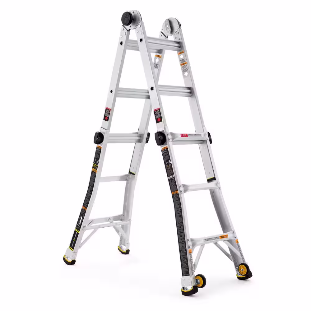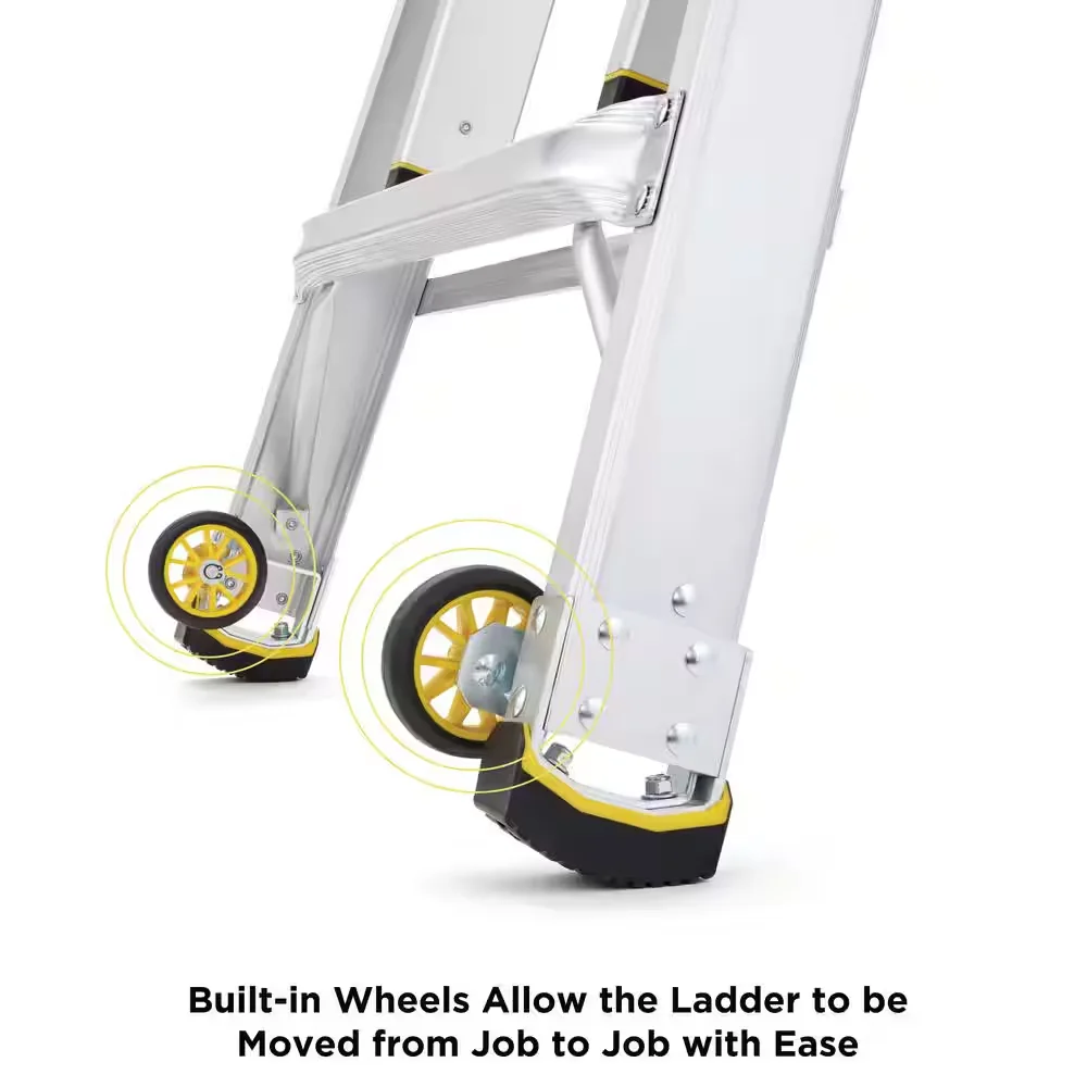 Lighter, stronger, easier - the newly designed Gorilla Ladders 14 ft. Reach MPXW Aluminum Multi-Position ladder with wheels combines versatility, safety and strength. With a 375 lb. weight capacity and telescoping adjustable heights, this ladder can be used as an extension ladder, double-sided twin step ladder, 90 ladder and a stairway step ladder. Easily adjust the height from all sides with 1-hand using the speed locks. The extra-large, heavy-duty hinges give you improved strength with less flex and sway for safer climbing, plus the built-in wheels allow the ladder to be easily transported. The innovative rail design makes this ladder lighter weight yet stronger than comparable models. This Gorilla Ladders 14 ft. Reach MPXW Multi-Position Ladder with wheels is the next generation of safe, strong, innovative, and versatile climbing products that is perfect for all your project needs.