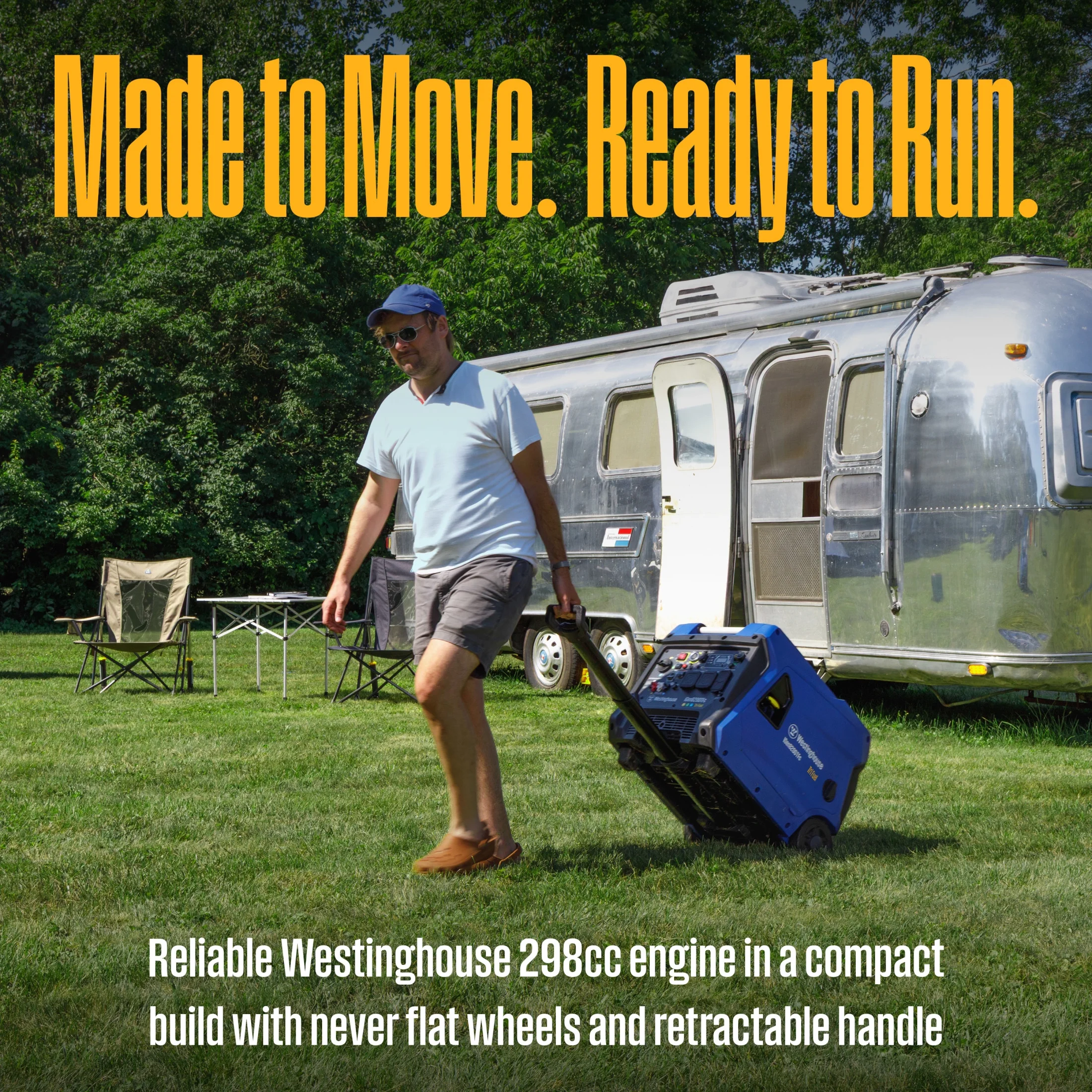 - DURABLE ENGINE WITH SAFETY BUILT-IN: Powered by a heavy duty 298 cc Westinghouse 4-stroke OHV engine with a cast iron sleeve; up to 17 hours of run time on a 3.9 gallon fuel tank at 25% load with automatic low oil shutdown and carbon monoxide (CO) sensor