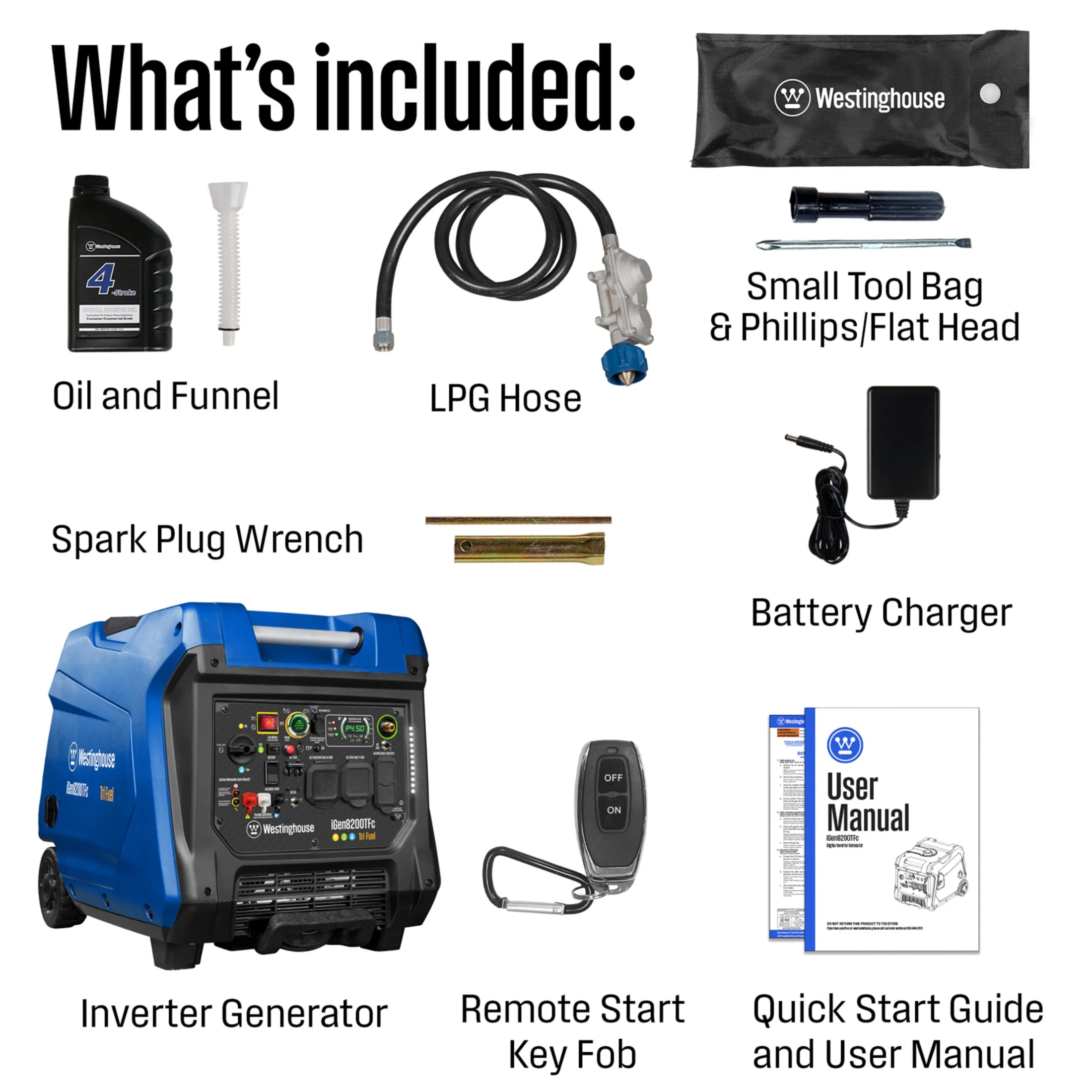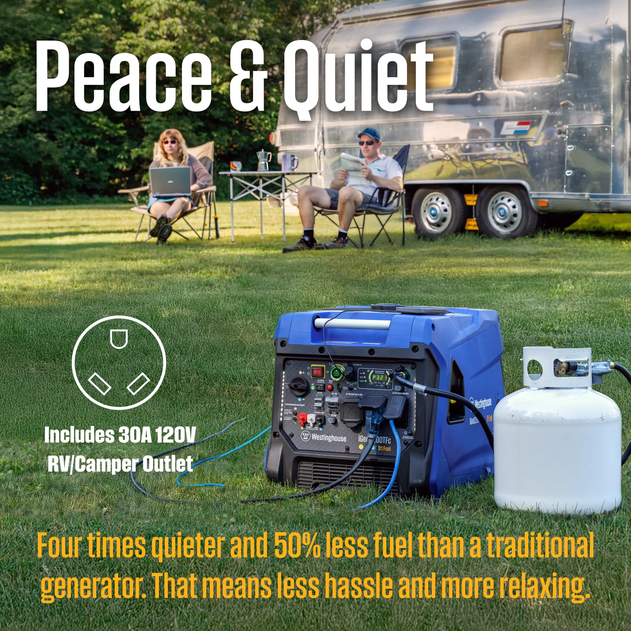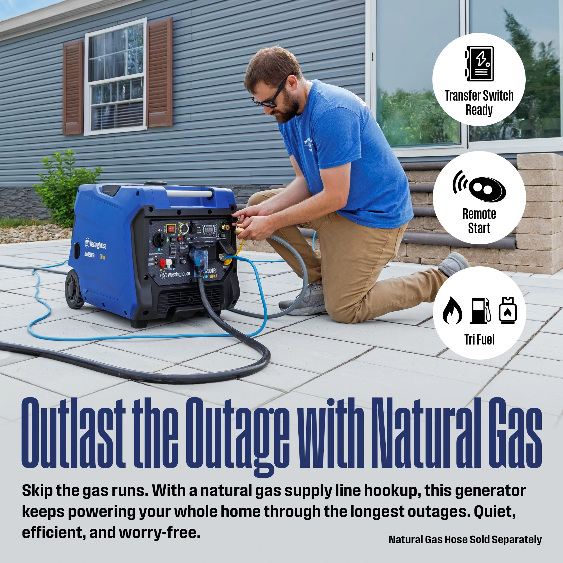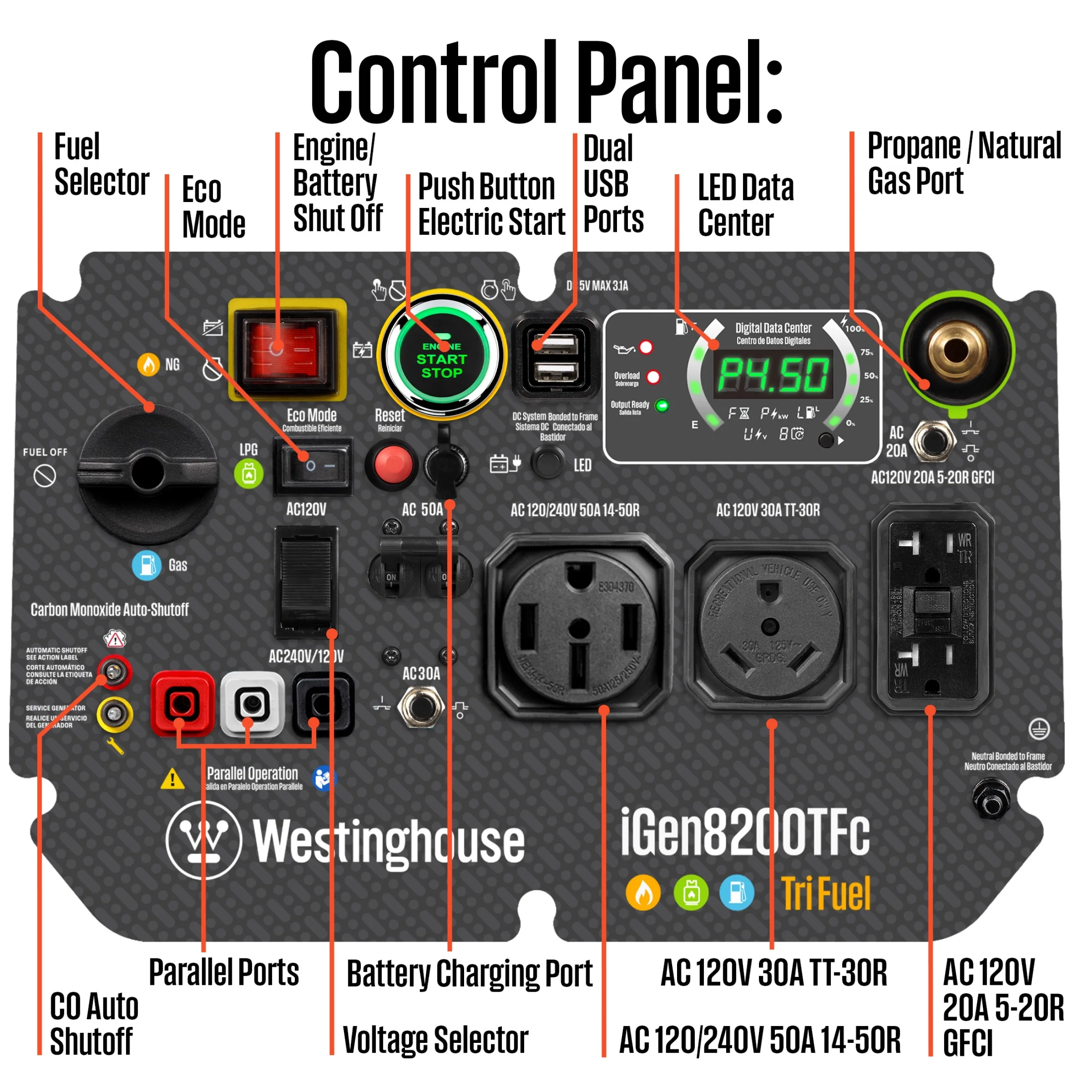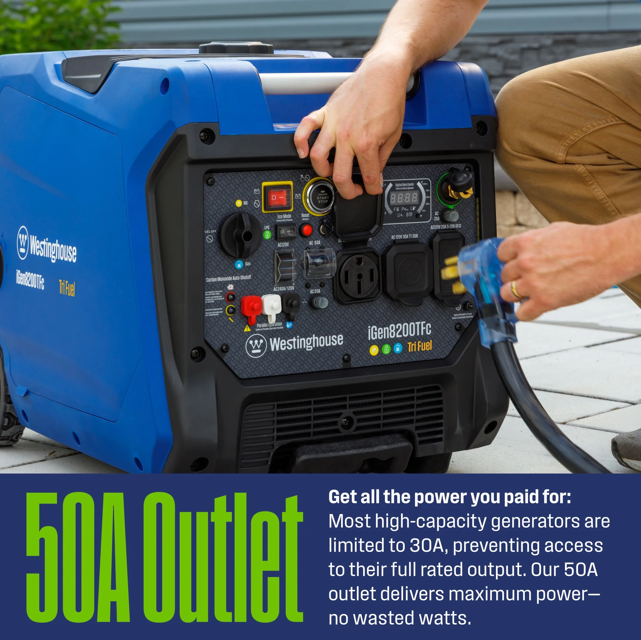 - INVERTER BENEFITS, HOME BACKUP POWER: The Westinghouse iGen8200TFc is a tri fuel generator with all the benefits of an inverter, but also with home backup power and a 50A outlet; Gasoline: 6600 running/8200 peak watts, Propane: 5940 running/7380 peak watts, Natural Gas: 5280 running/6560 peak watts