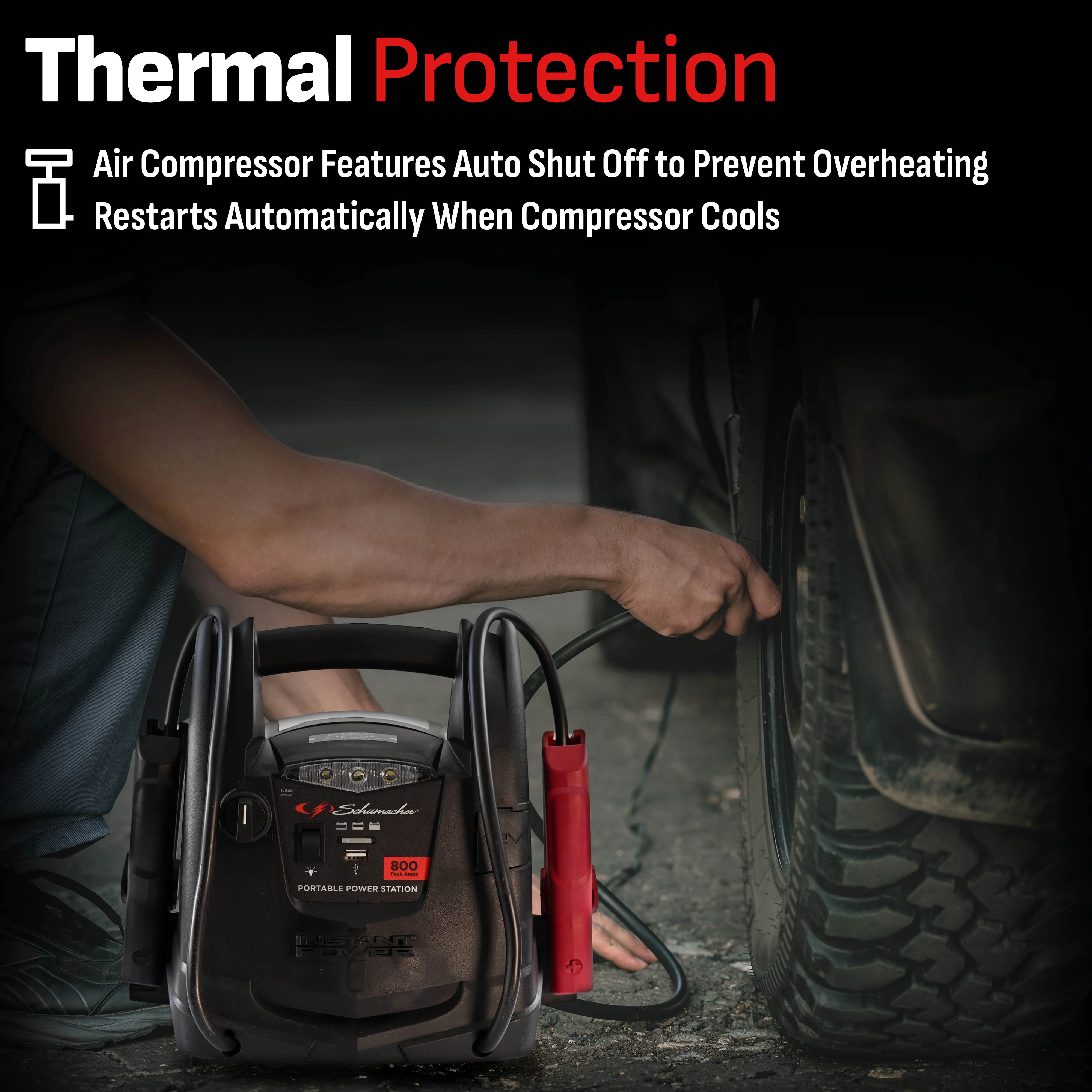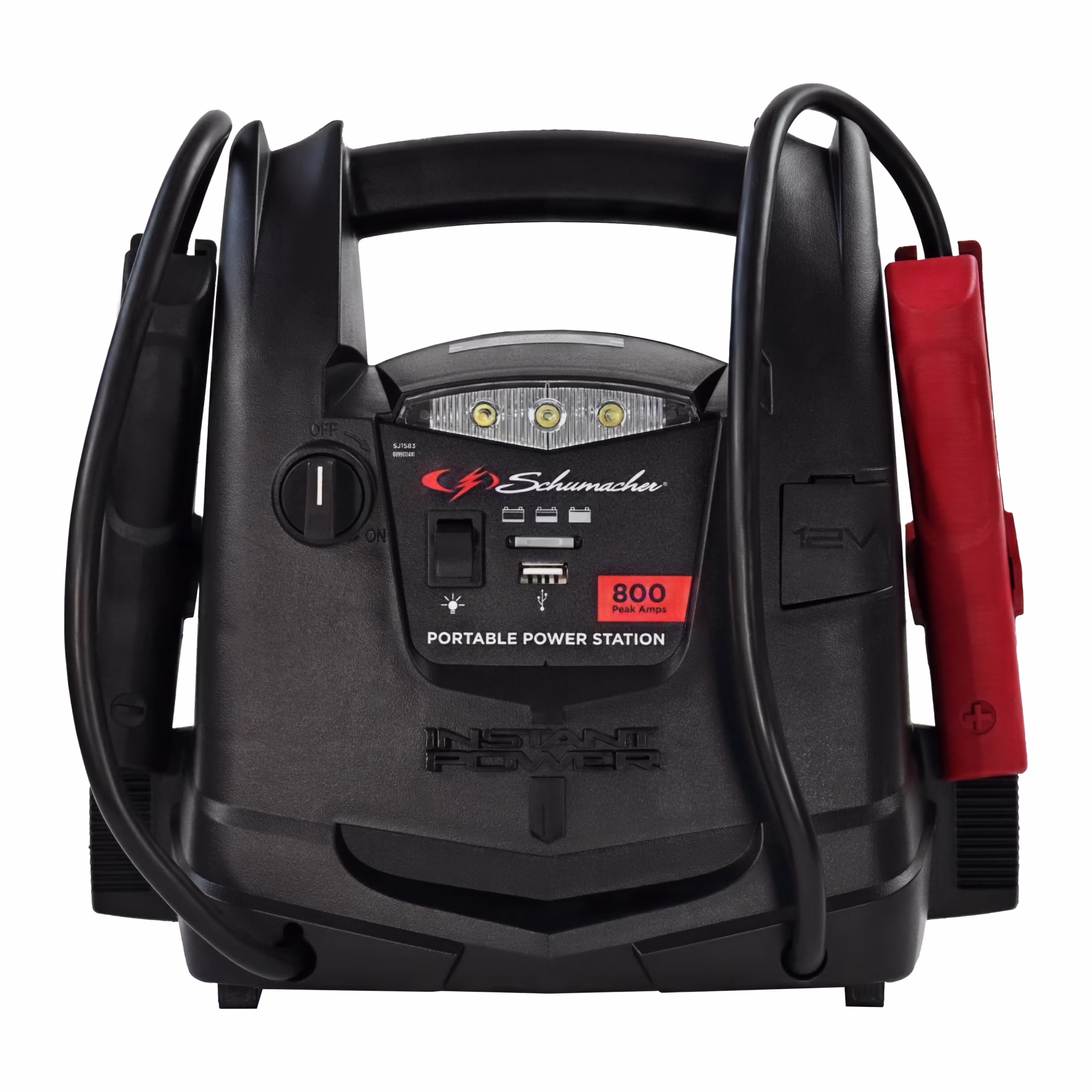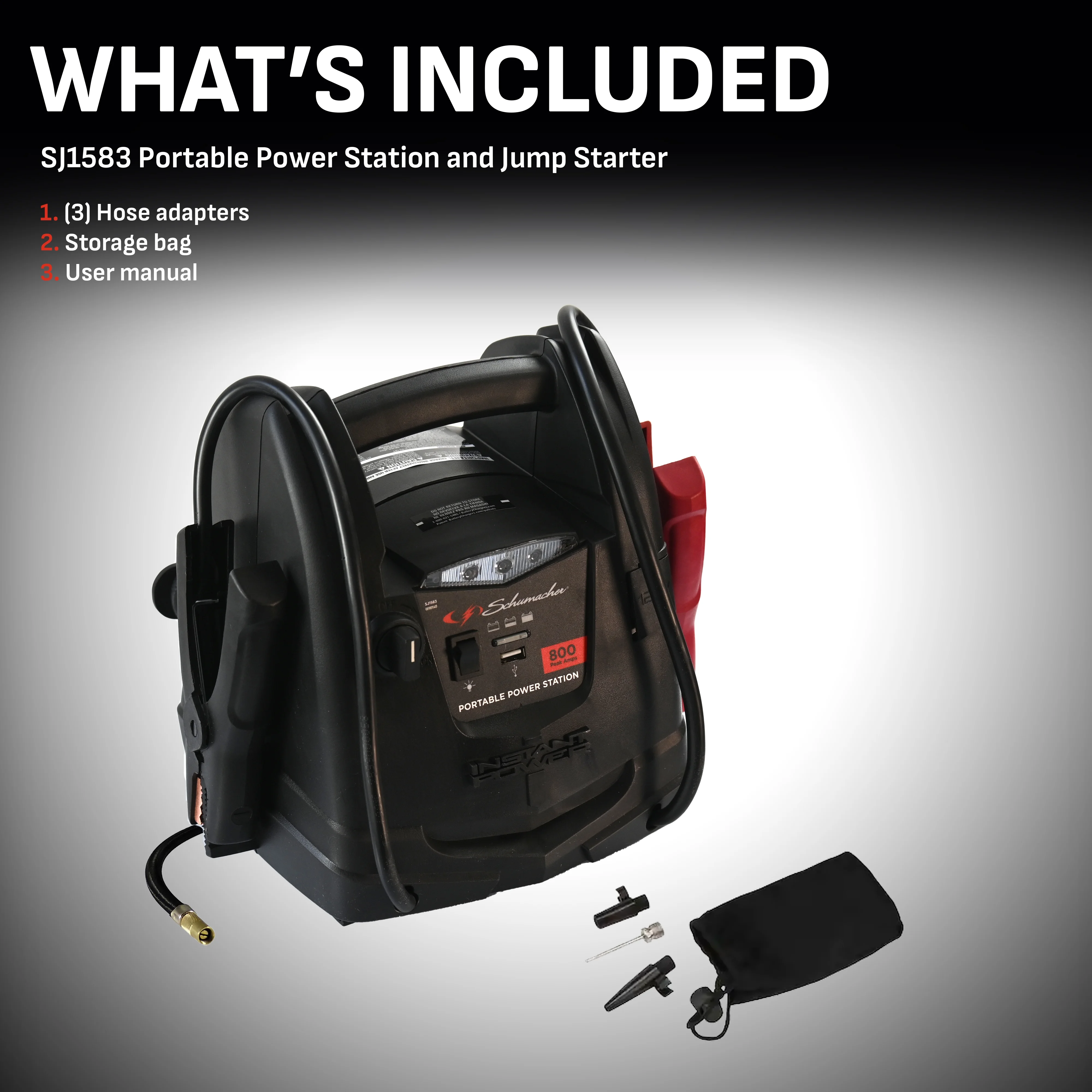 - New in Box �CSchumacher SJ1583 Portable Power Station and Jump Starter, (3) hose adapters, bag, and user manual.