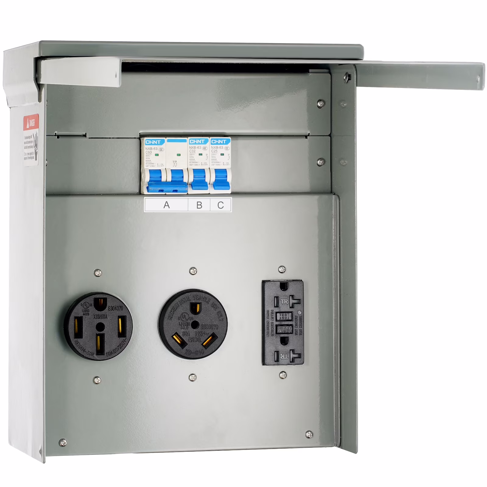KFFKFF Portable Power Supply Panel, 125/250V, Equipped with 20/30/50 Amp Socket for RV, Compliant with NEMA 14 - 50R / NEMA TT - 30R / 15A GFCI, Ideal for RV Camper Trailer Motorhome