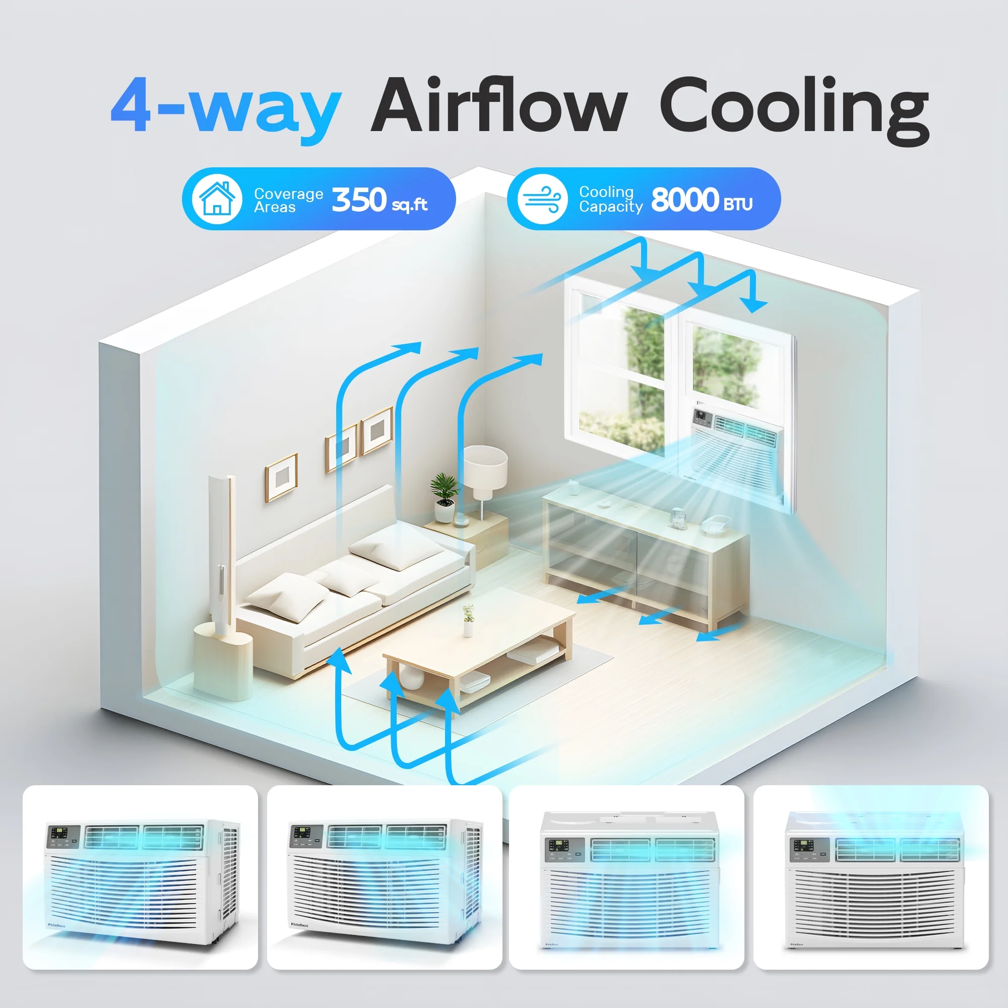 - ?��Faster&Powerful Cooling �� 8000 BTU Window Air Conditioneris a Powerful Indoor Air Conditioner With Multiple Cooling Modes: From Cooling, Dehumidification, Fan and ECO Sleep Mode. Air Conditioner Window unit That Provides Consistent, Fast, And Efficient Cooling for A Single Bedroom or Approximately 350 Sq Ft Room. Very Suitable for Bedrooms, Offices, Game Rooms, Cabins, Living Rooms, and Apartments.