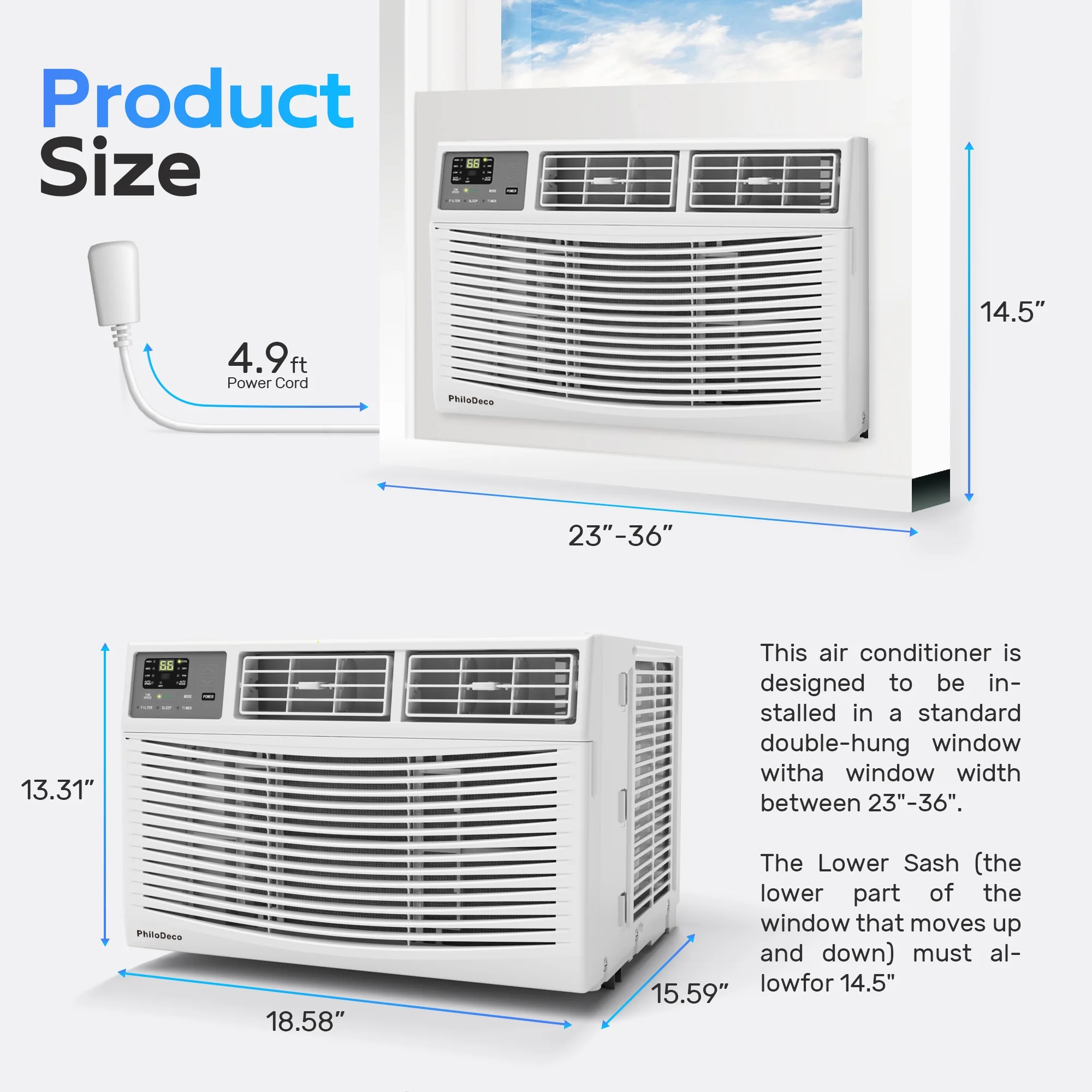 - ��Easy instalation�� PhiloDeco Ac Window Unit Can be Successfully Installed Without the Need for Professional Personnel. Suitable for 110V/120V Power Sockets, With Single or Double Hung Windows of 23-36 Inches, A Minimum Height of 14.5 Inches, and Can Be Self Installed In As Fast As 15 Minutes. the Adjustable Side Panel Can Minimize Air Leakage and Ensure That Cold Air Stays in the Room. Start Enjoying A Cooler and More Comfortable Home. (for Details, Please Refer to the Installation Page in the Manual).