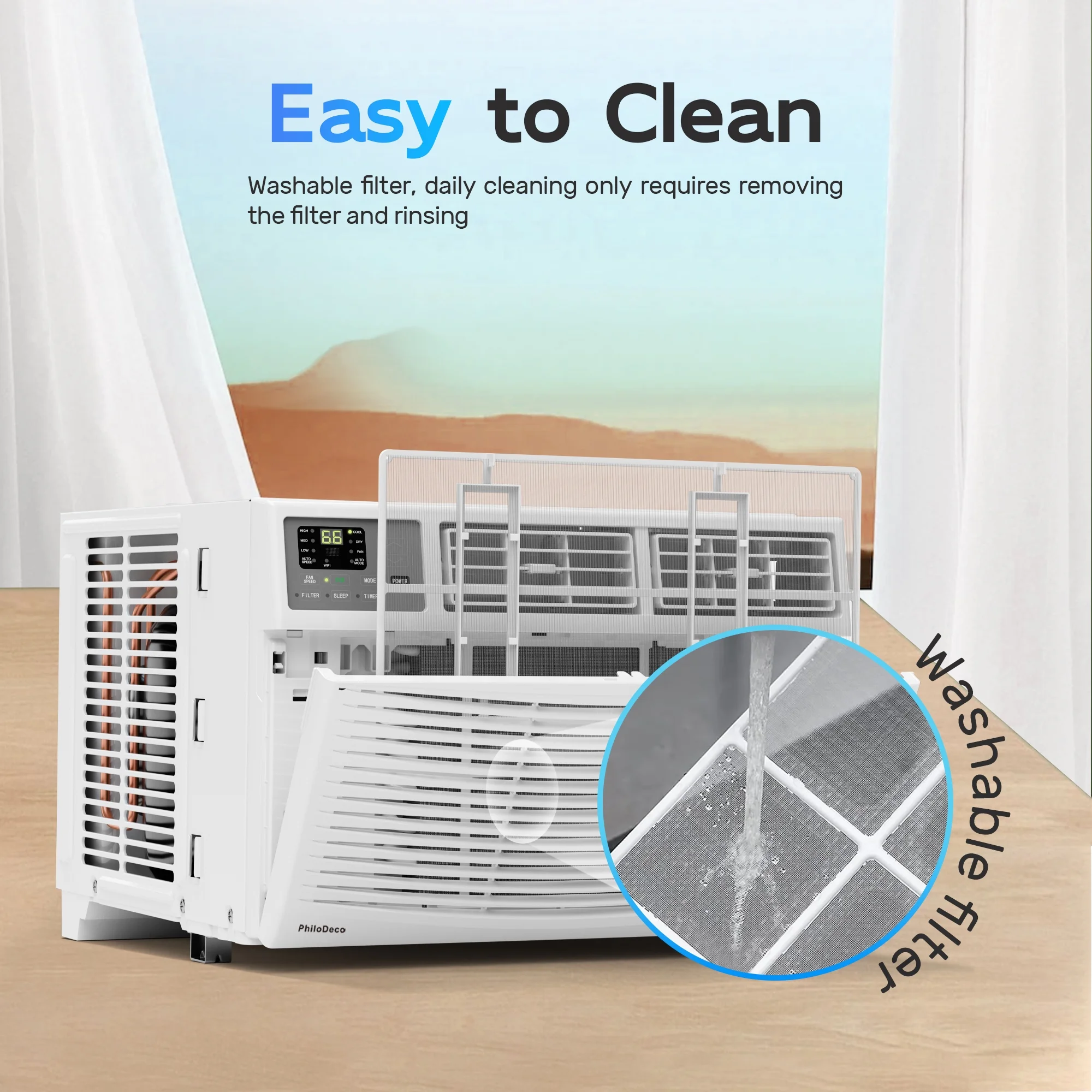 - ��Quietand Easy to Disassemble��PhiloDeco window air conditioner can operate as low as 54 dB (low noise mode). There window ac units is no need to disassemble the machine for cleaning, simply remove the filter from the front as shown in the main picture, rinse it with water periodically and reinstall it. The removable and reusable air filter protects your family and living space from dust and pet hair.