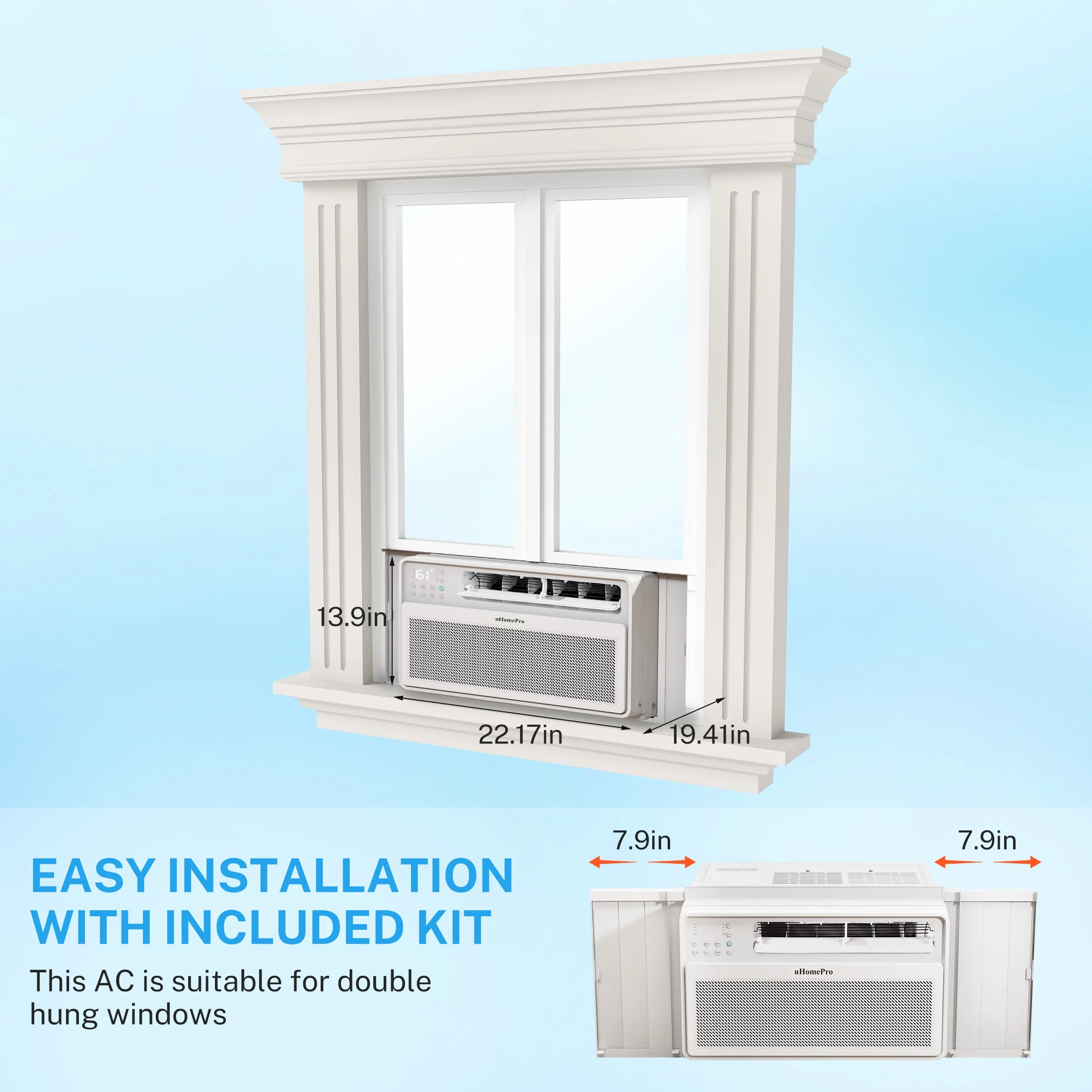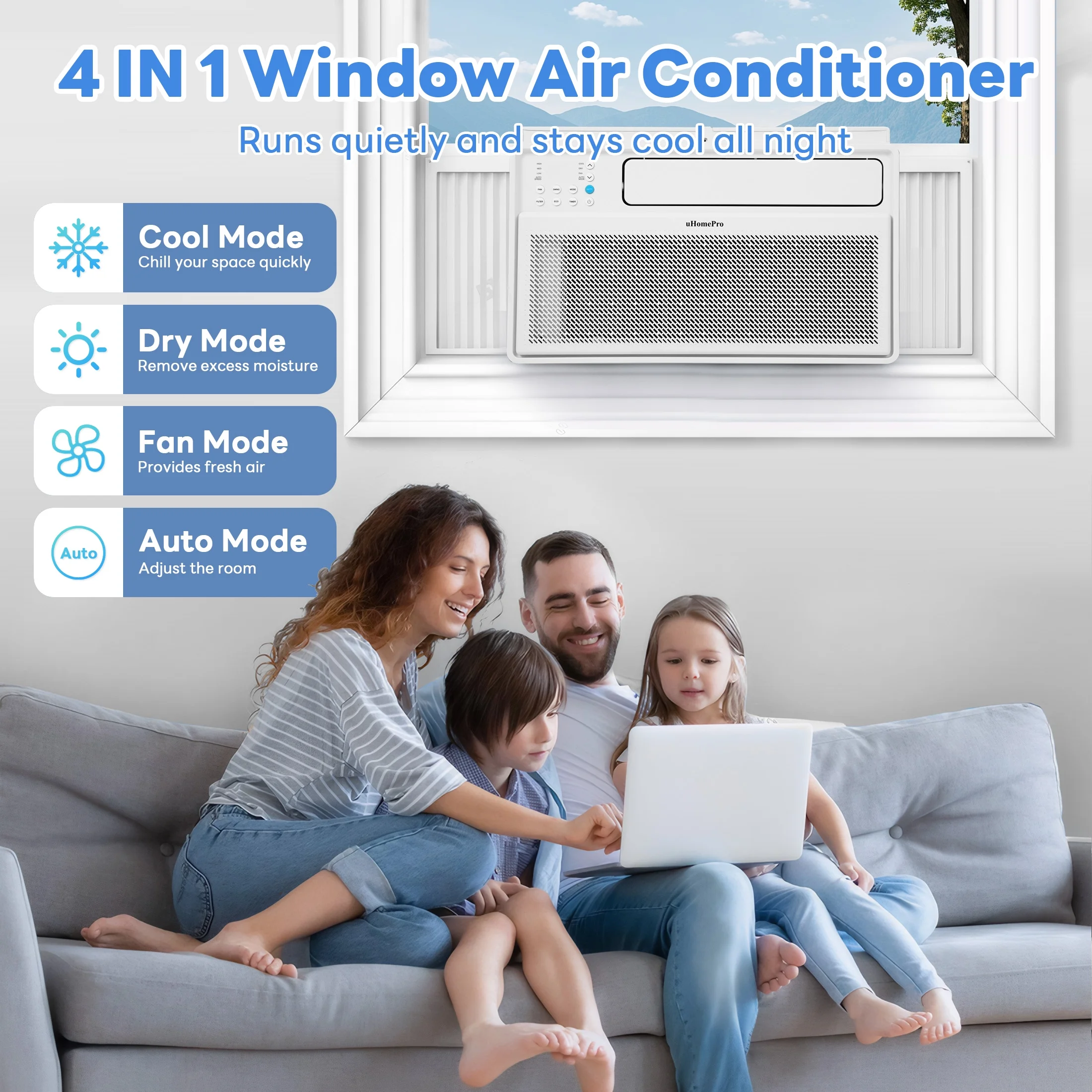 Upgrade your space with this UHOMEPRO window air conditioner, a low-profile air conditioner designed for bedrooms, apartments, or small rooms. This quiet window air conditioner seamlessly switches between Cool, Dry, Fan, and Auto modes: Cool lowers temps while reducing humidity; Dry combats sticky air with automated cycles; Fan offers a gentle breeze; and Auto adjusts modes based on room conditions using seven smart sensors. Optimize nighttime comfort with SLEEP mode��it gradually raises temps every 30-60 minutes (up to 6 cycles) and dims lights for undisturbed rest. ECO mode saves energy by cycling the compressor on/off once your desired temp is reached, while the fan maintains airflow. Control settings remotely via the Smart Wi-Fi Control or included remote��adjust modes, fan speeds, timers, or toggle the LED display for a serene ambiance. As a small window AC unit, its compact, air conditioner portable design fits most windows and includes easy-slide filters with a 500-hour reminder for cleaning��simply vacuum or wash monthly to prevent airflow issues. Ideal as an apartment air conditioner or air conditioner for bedroom, it balances power and efficiency (under 43 dB) with smart features like frost-prevention sensors and intermittent fan delays for energy savings. Perfect for renters or small spaces, this ac window unit delivers year-round comfort without sacrificing style or space.