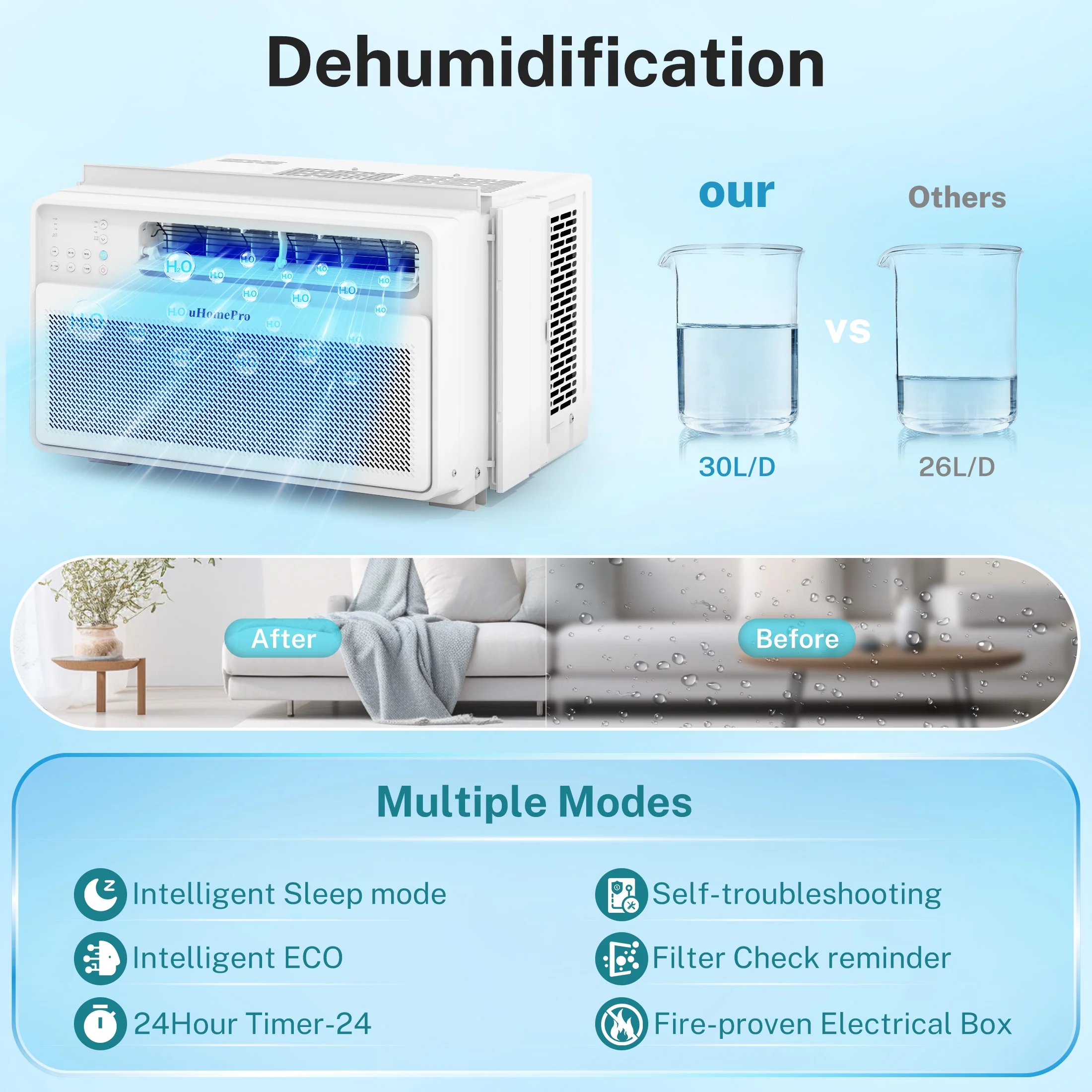 DEHUMIDIFICATION EFFICIENCY 30 LITERS/DAY: 2-in-1 air conditioner and dehumidifier: enjoy superior dehumidification, outperforming many high-power models. Stay cool and dry with efficiency!