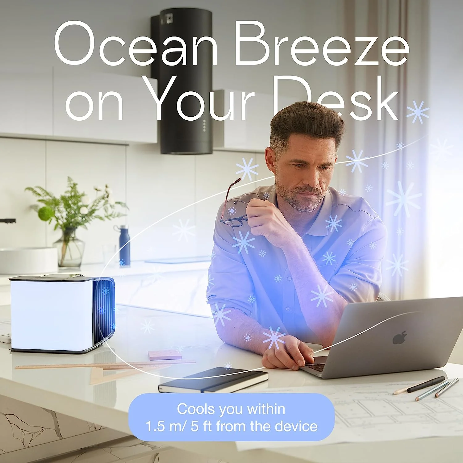 - NATURAL PERSONAL COOLING �C Efficiently cools your personal space using evaporative technology. Ideal solution for hot, dry climates. Feel the pleasant cool breeze within 3 - 5 feet in the direction of airflow. Contrary to other personal air conditioners, evaSMART doesn��t use Freon-like liquids, the temperature drop is a result of the water evaporation process.