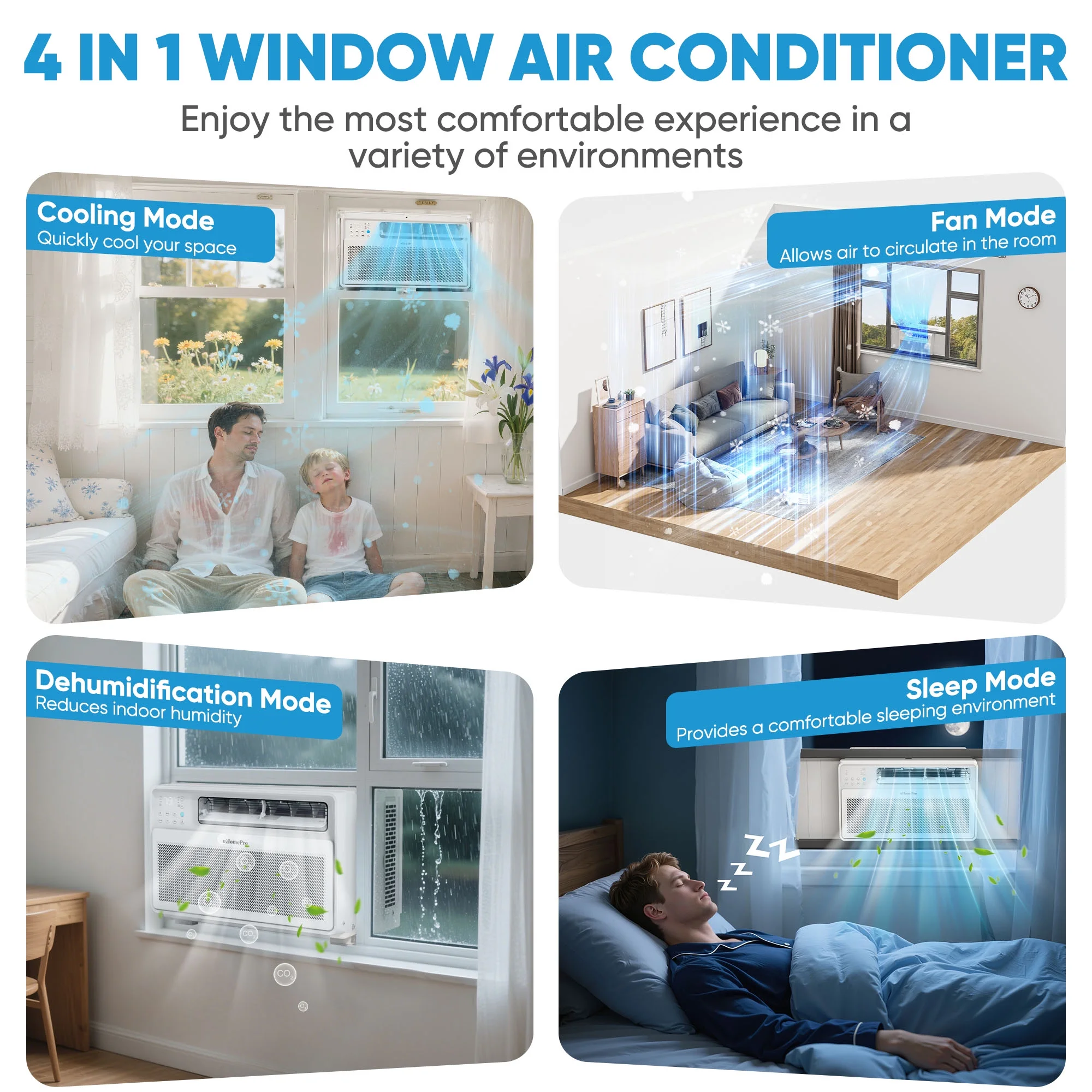 - 4-in-1 All-in-One Mode: Cooling / Dehumidification / Ventilation / Sleep, suitable for all seasons and adaptable to changing weather conditions.