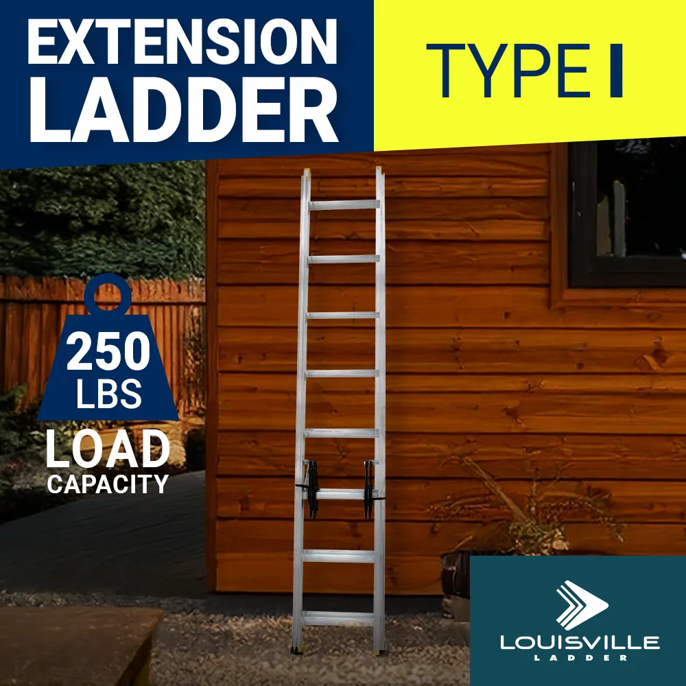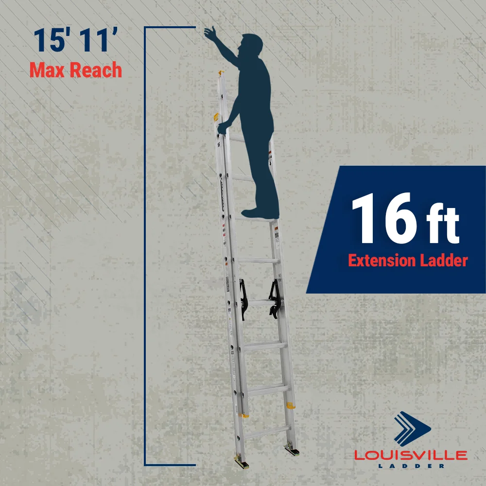 This 16-foot Louisville Ladder aluminum extension ladder has a 250 lbs. load capacity, rated ANSI I. This extension ladder is great for working on light construction and residential jobs. It features D shaped rungs that are fully serrated for a slip resistant surface. It has mar-resistant rail end caps to protect landing surfaces and provide longer life. Includes two extra heavy duty slide guides at the top of the base section combined with a stop on the fly section to prevent over extending the extension ladder. Features steel swivel safety shoes with metal shields specifically designed for extension ladders, ensures stability and safety even on uneven surfaces.