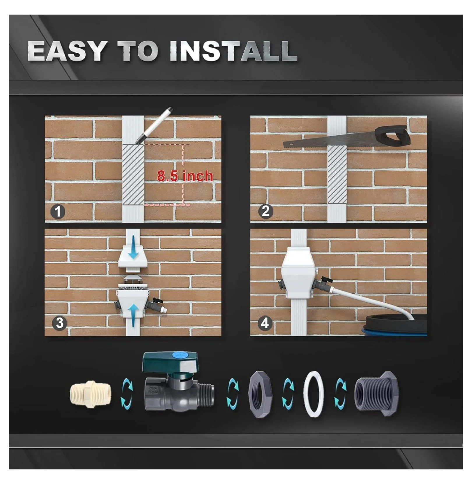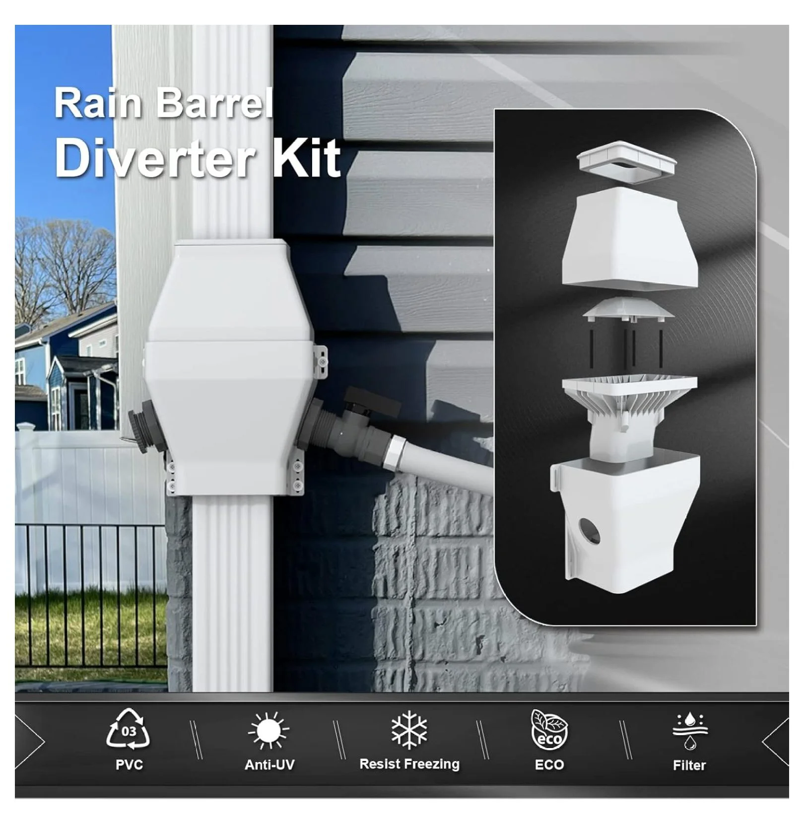 • Rain Diverter Kit, Rainwater Collection System Fits for 2x3 or 3x4 Inch Downspout Diverter, Upgrade PVC Rain Water Diverter for Gutters with Filter and Spigot Kit (White)