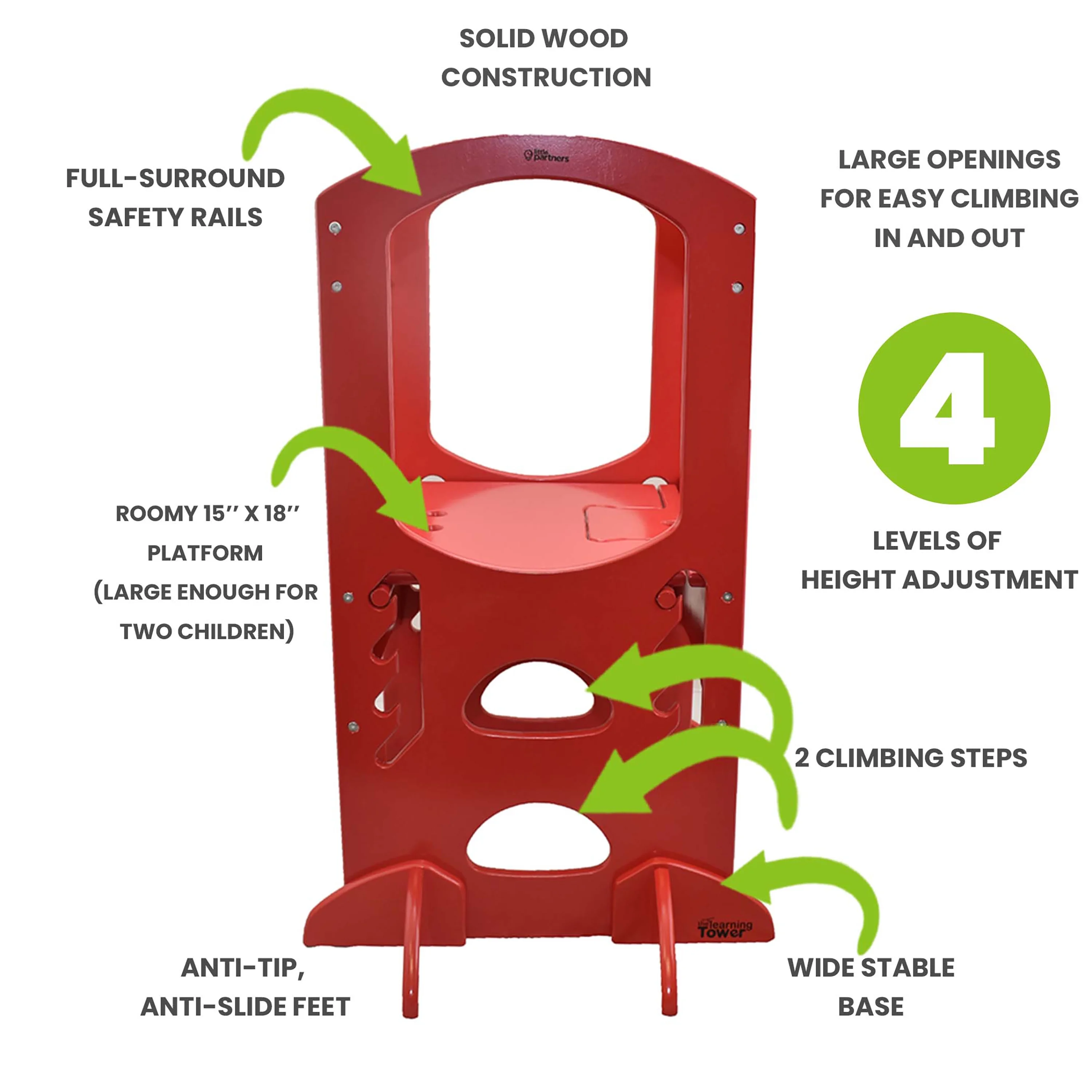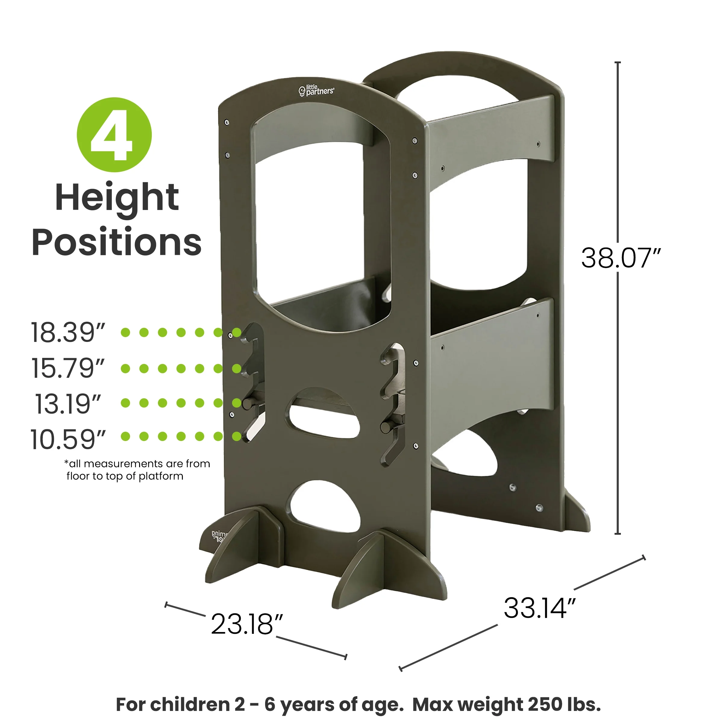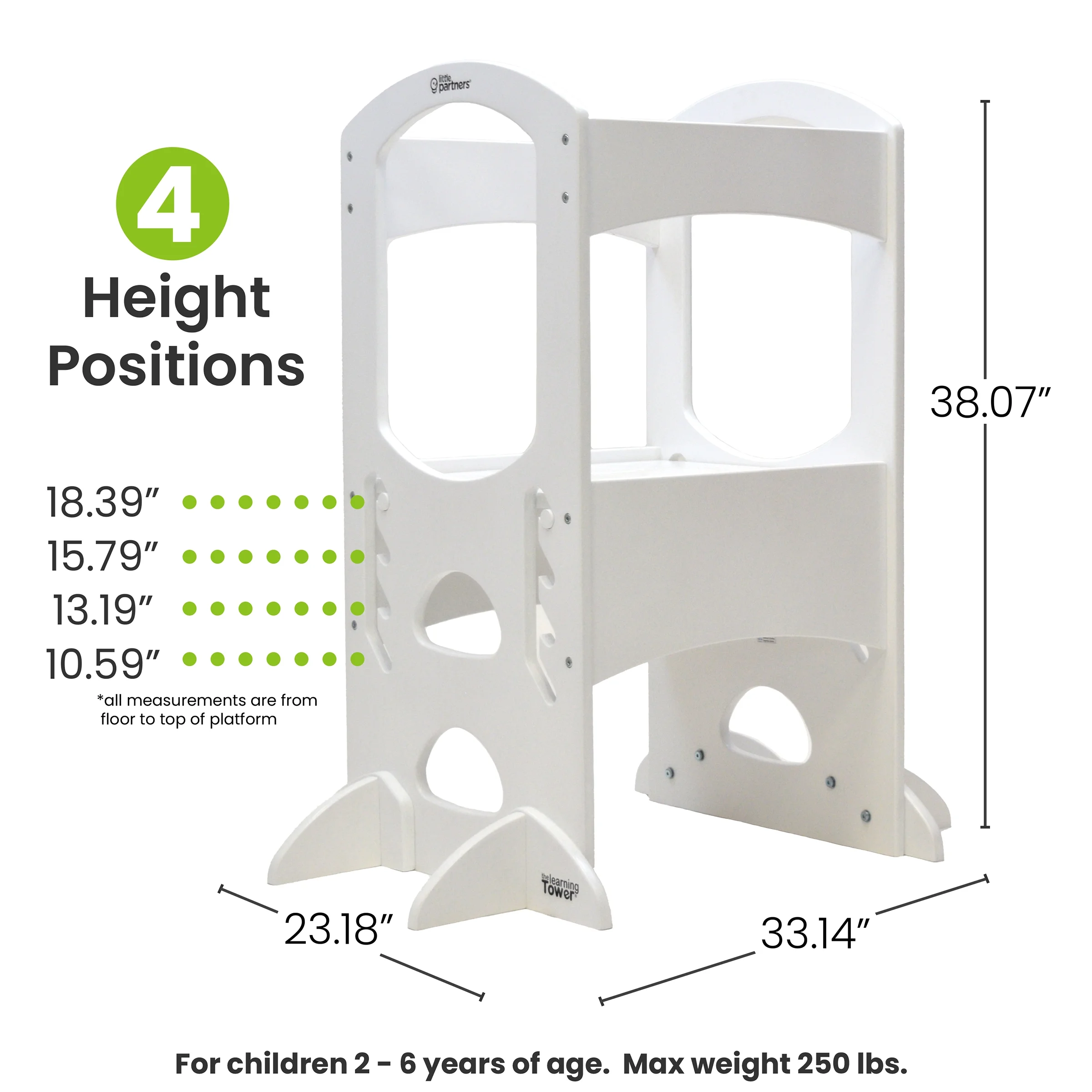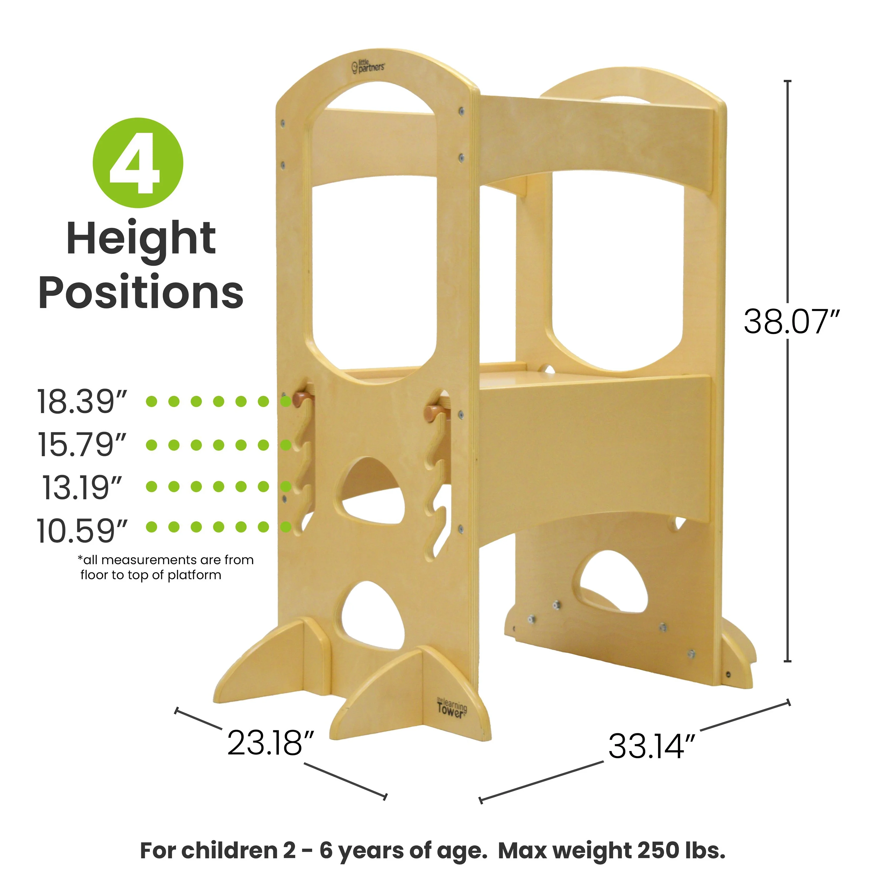 - SPECIFICATIONS: Assembly is required. For care, wipe clean with a damp cloth. Designed for ages 2-6, our Learning Tower holds up to 250 lbs, has anti-tip and anti-slide feet, and features four height adjustments. Tools are included.