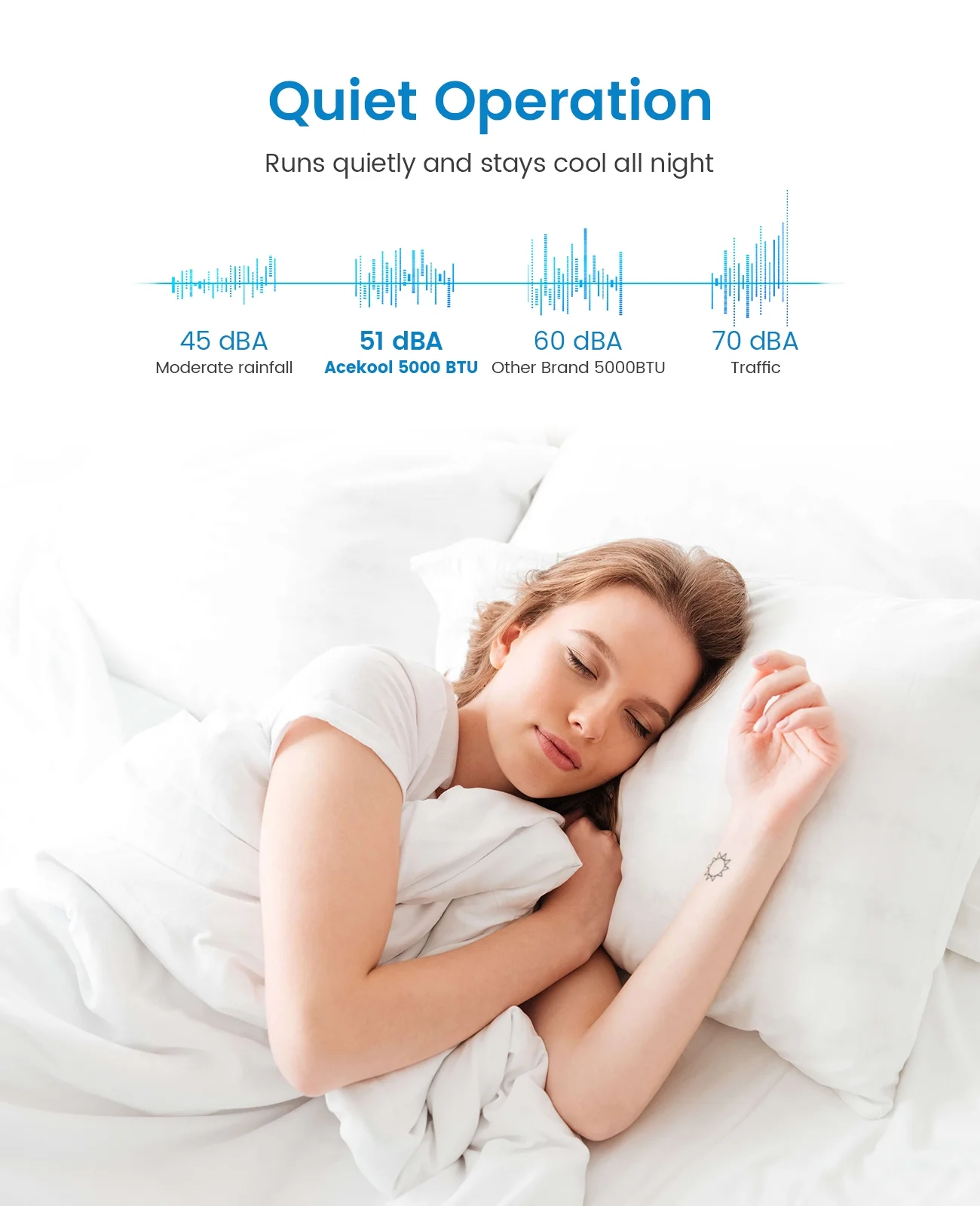 - Low Noise The 5000 BTU AC window unit is designed with a low noise level of only 50 dB, comparable to the quiet ambiance of a library. It meets the highest standards for noise reduction among similar products in the market.