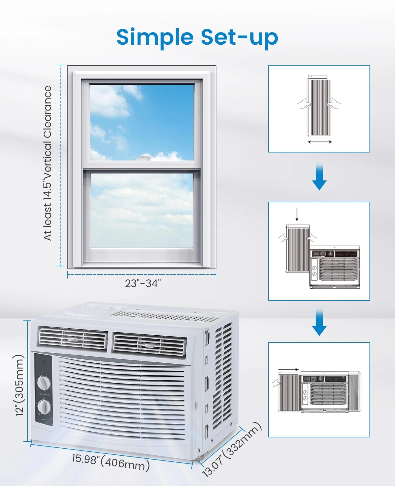 - Effortless Installation - Easily install in your home or apartment's existing window frame. This compact window-mounted ac suitable for windows measuring 23"-34" in width and a minimum of 14.5'' in height. Mounting accessories include a window installation kit, adjustable side panels, expandable to fit standard windows. For some window frames,holes are recommended before installing screws. Please see included instruction manual for further details