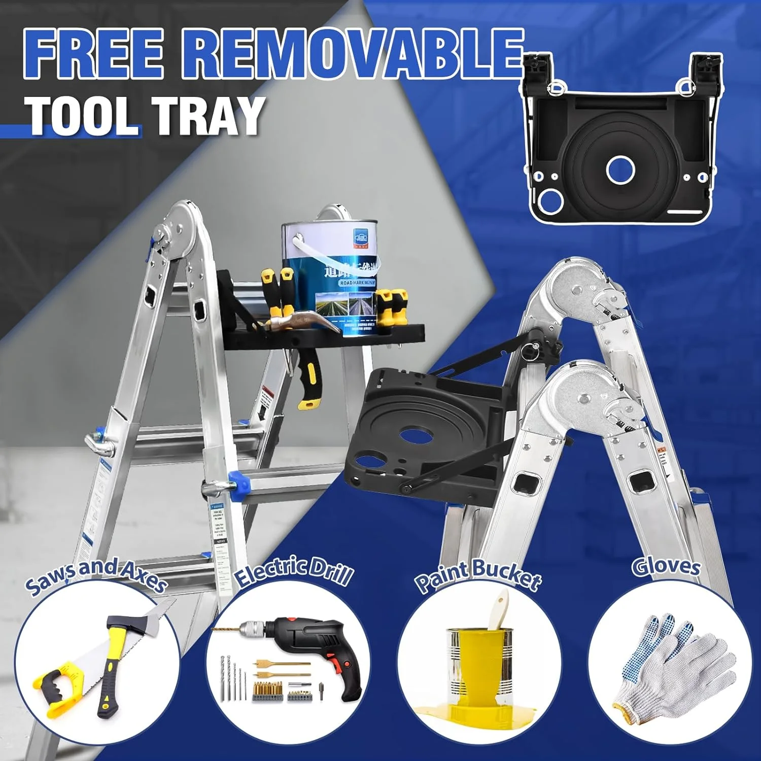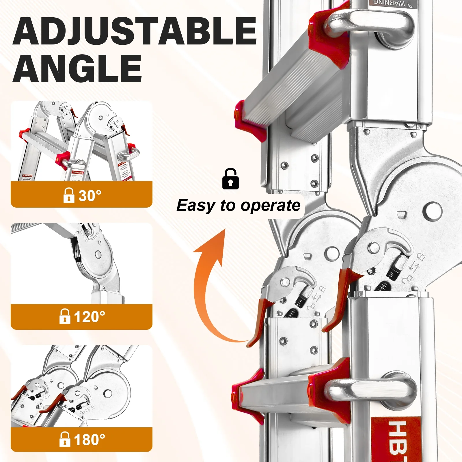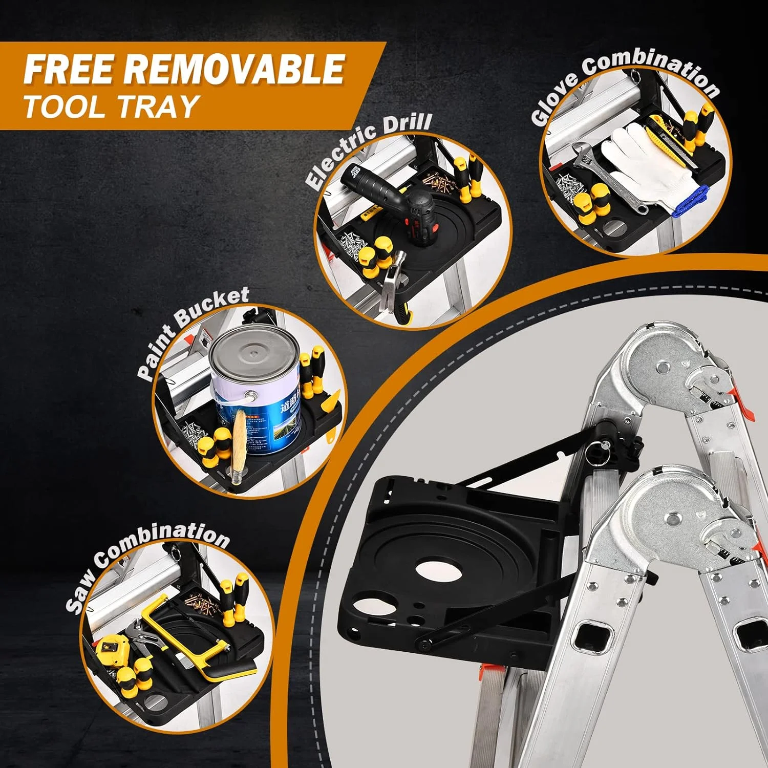 Hbtower Ladder, A Frame 4 Step Extension Ladder, 14 Ft Multi Position Ladder with Removable Tool Tray and Stabilizer Bar, 330 lb Capacity Telescoping Ladder for Household and Outdoor Work