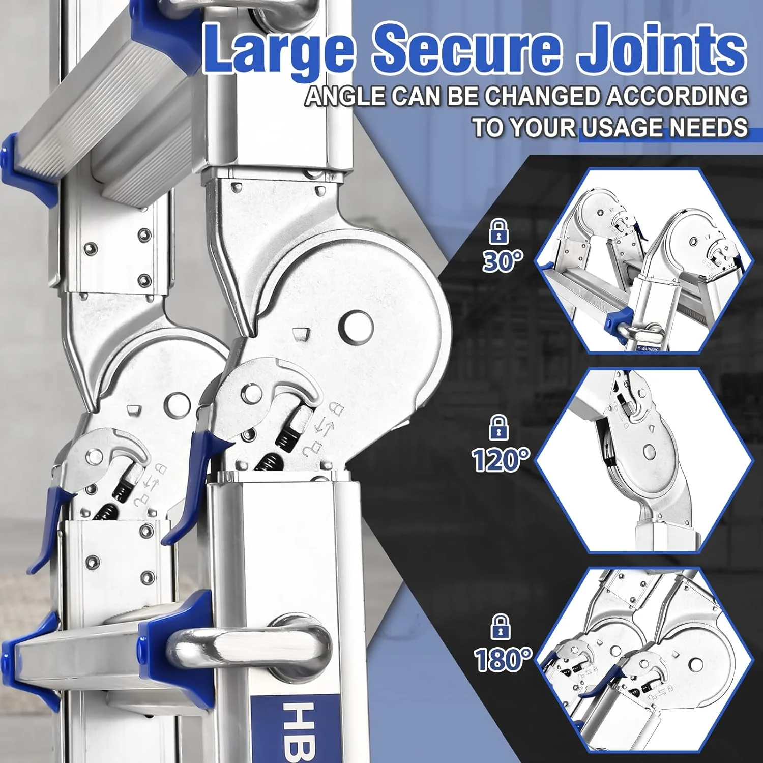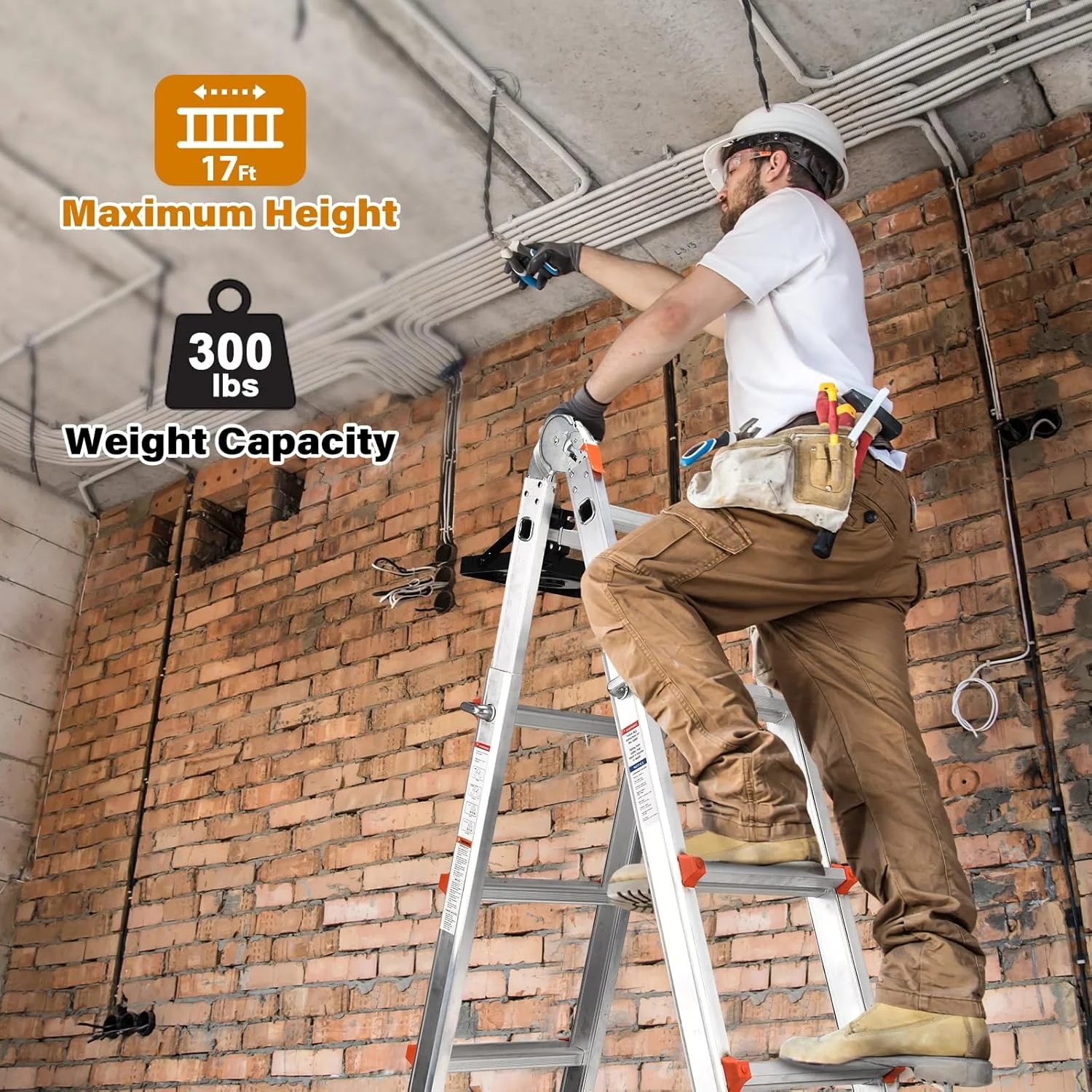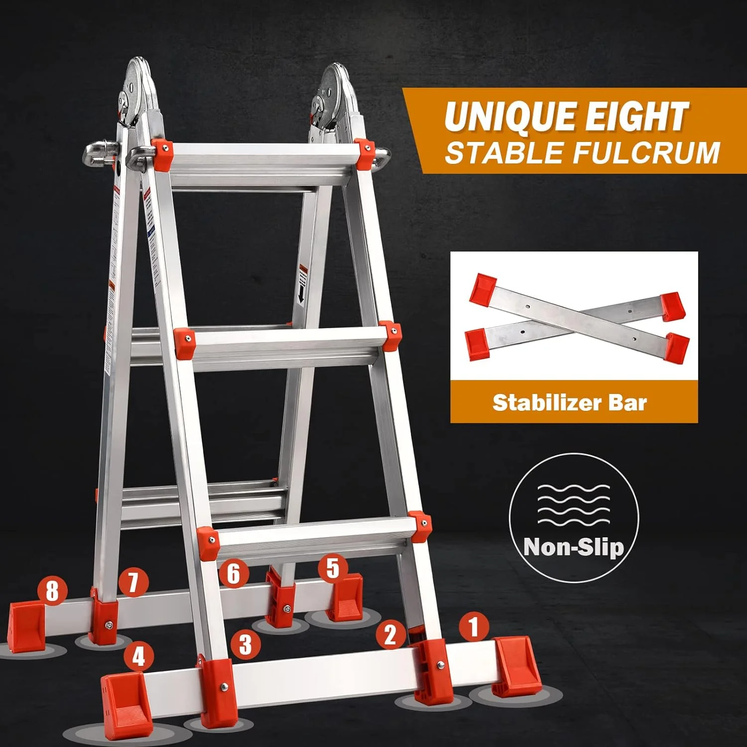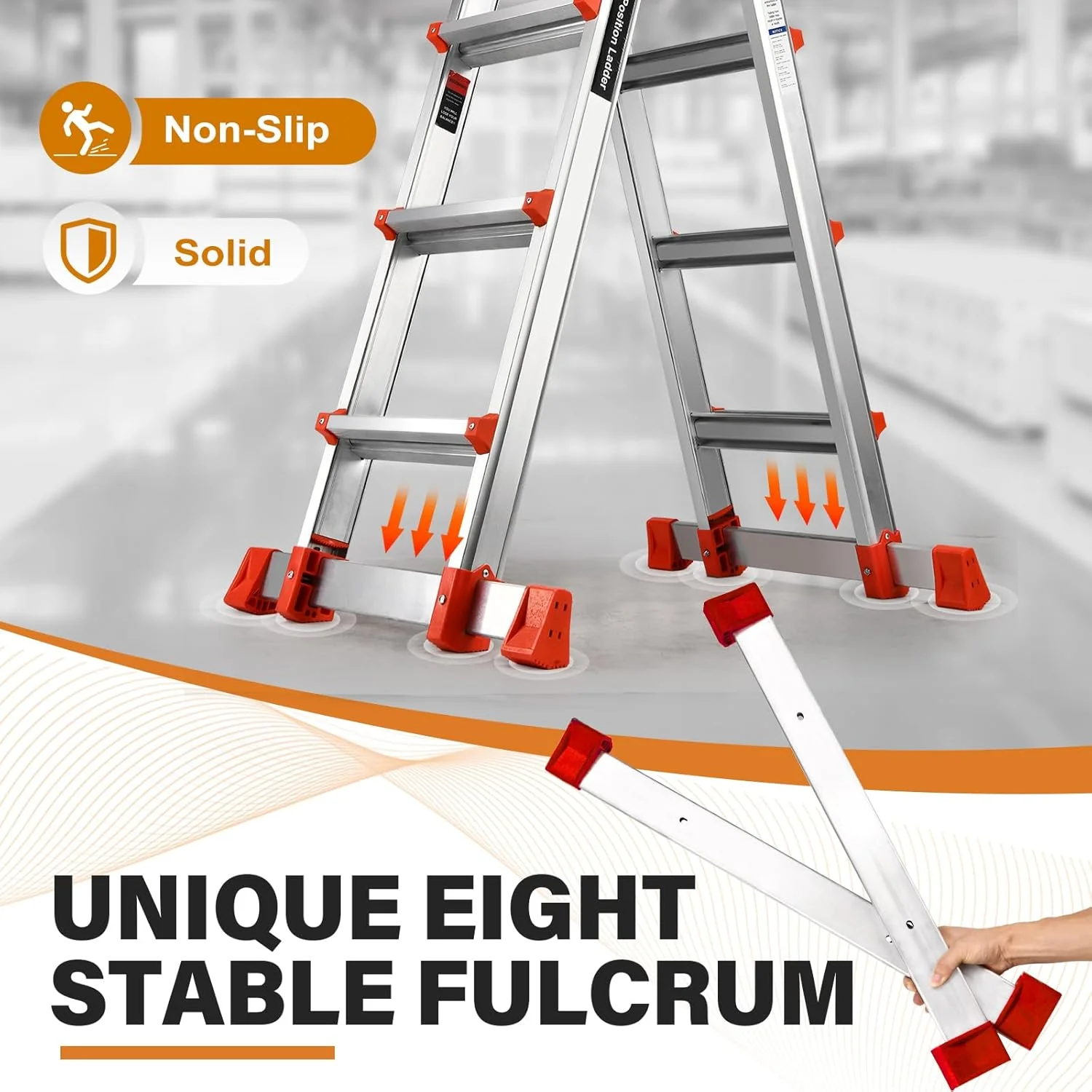Hbtower Ladder, A Frame 4 Step Extension Ladder, 14 Ft Multi Position Ladder with Removable Tool Tray and Stabilizer Bar, 330 lb Capacity Telescoping Ladder for Household and Outdoor Work