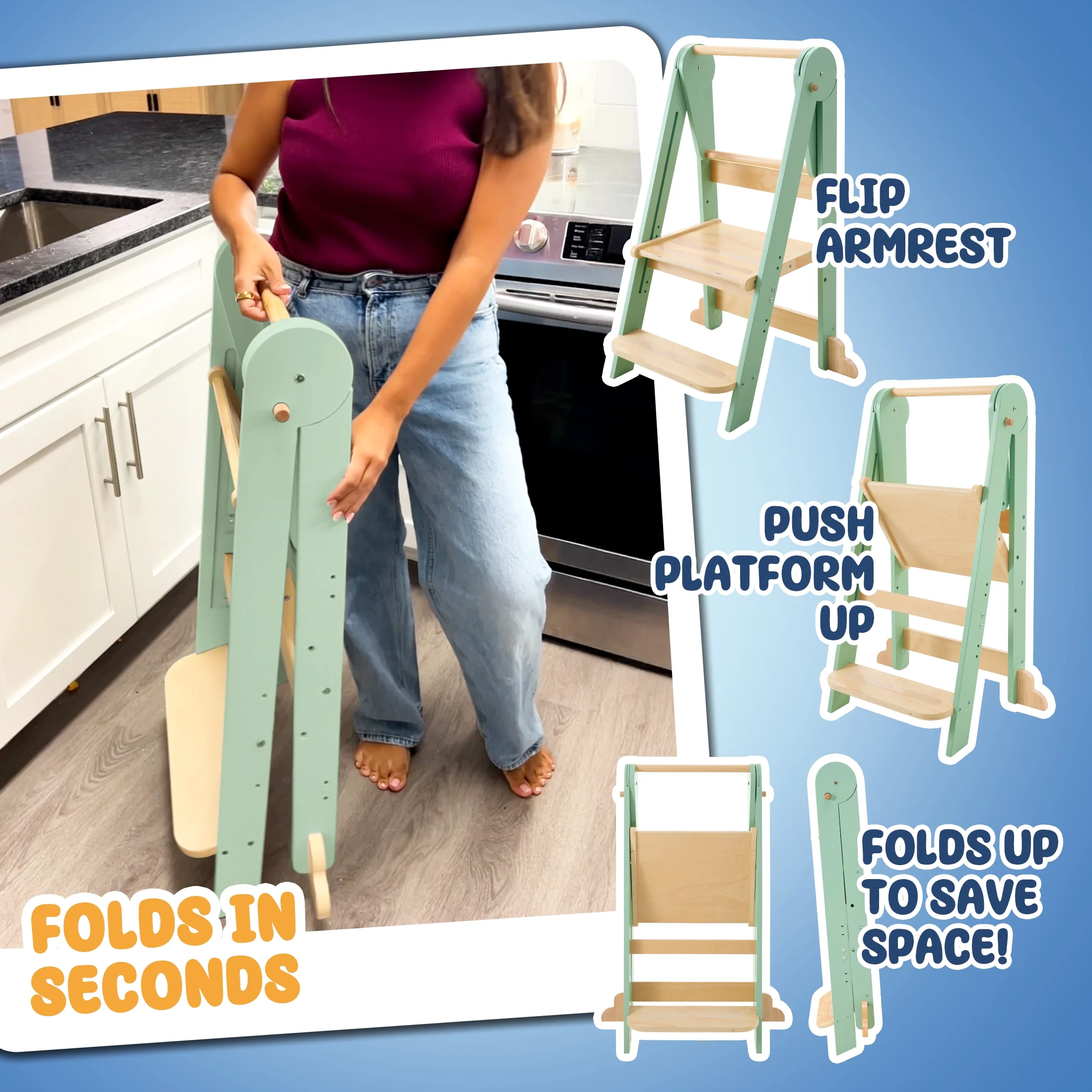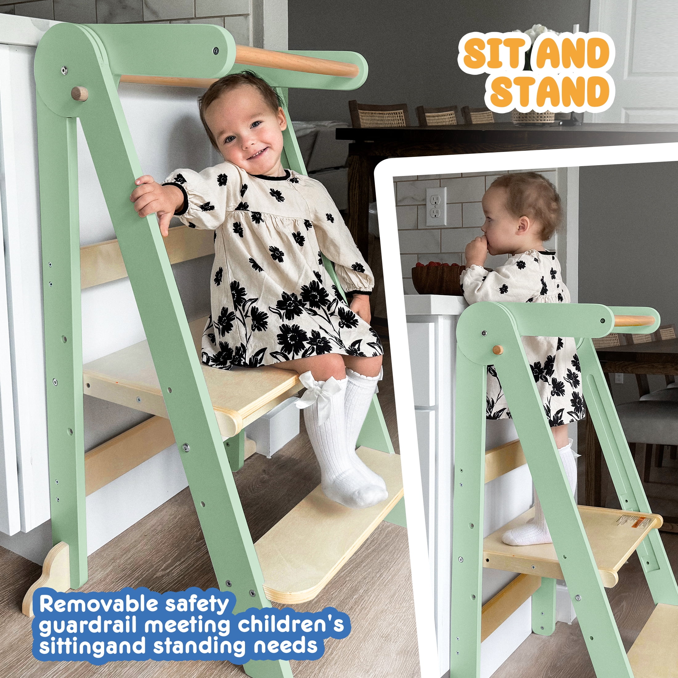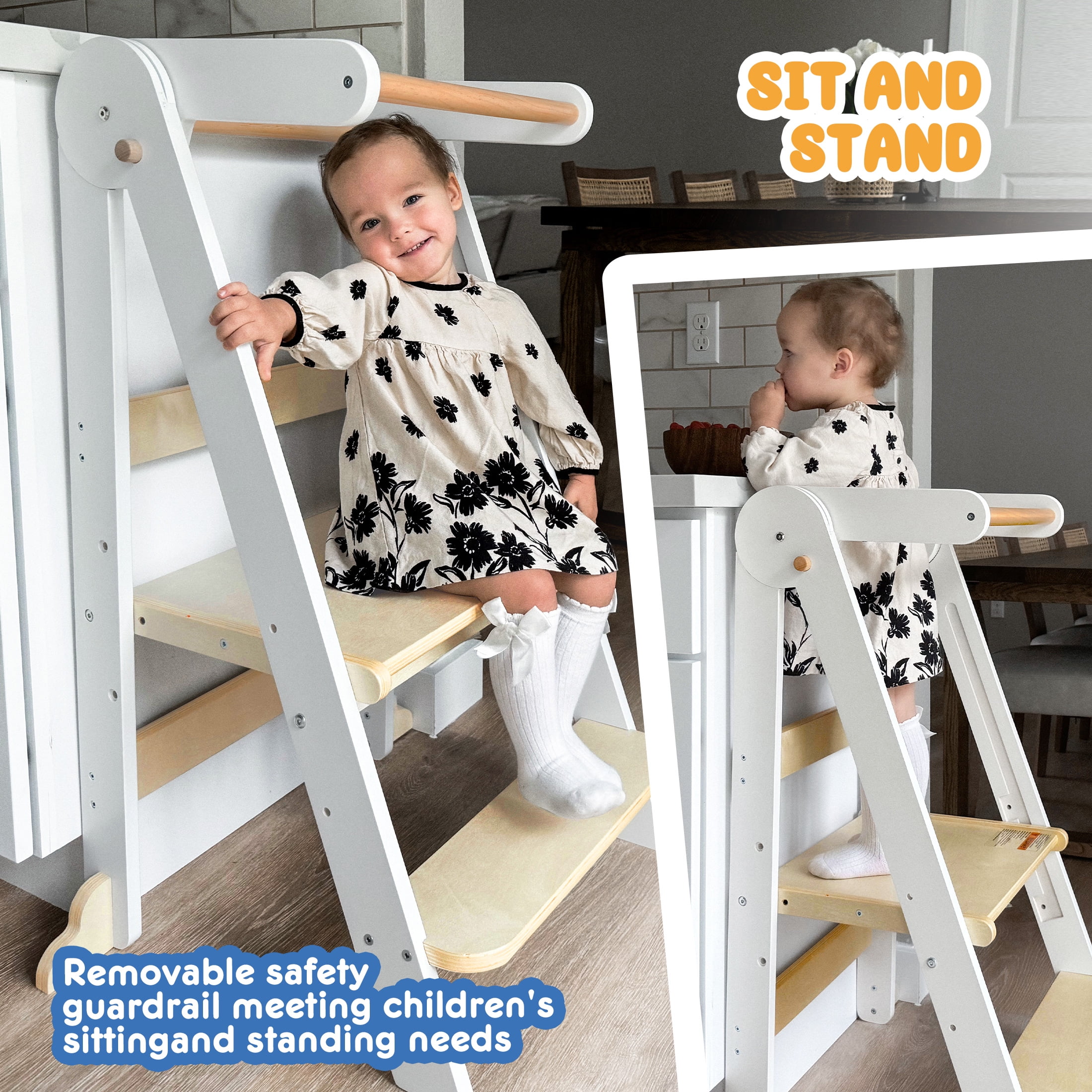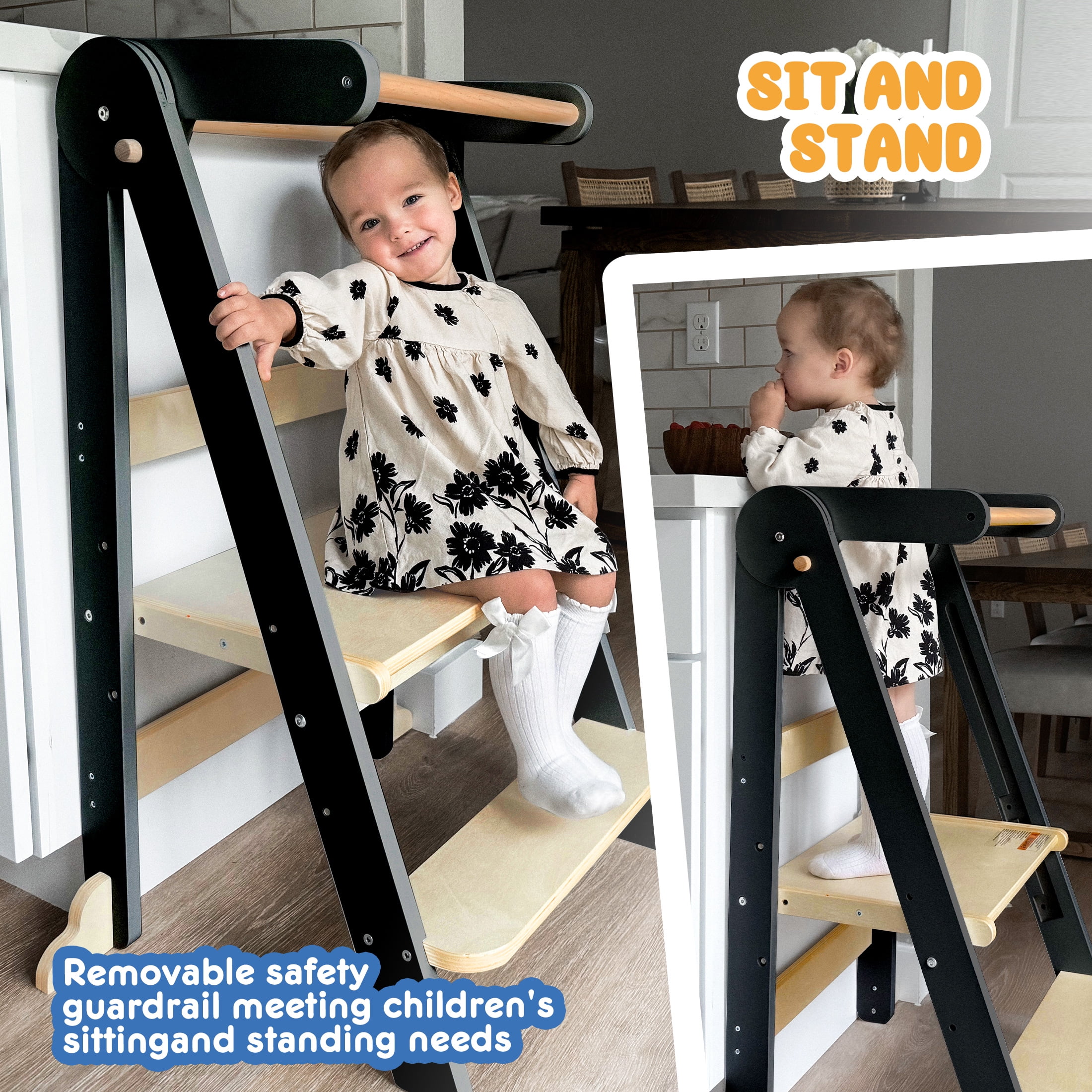 - Sit or Stand 2 in 1: The Foldable Toddler Learning Kitchen Tower offers the flexibility to sit or stand, ensuring your child stays comfortable while engaging in various tasks. Simply rotate the safety rail to transform it into a seat, perfect for quiet activities.