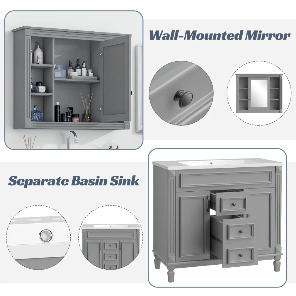36'' Bathroom Vanity Set, Undermount Bathroom Cabinet and Mirror Cabinet, Ceramic Sink Top, Storage Cabinet with 2 Soft Closing Doors and 2 Drawers, Vanity Cabinet Set, Suit for 4'' Faucet, Gray