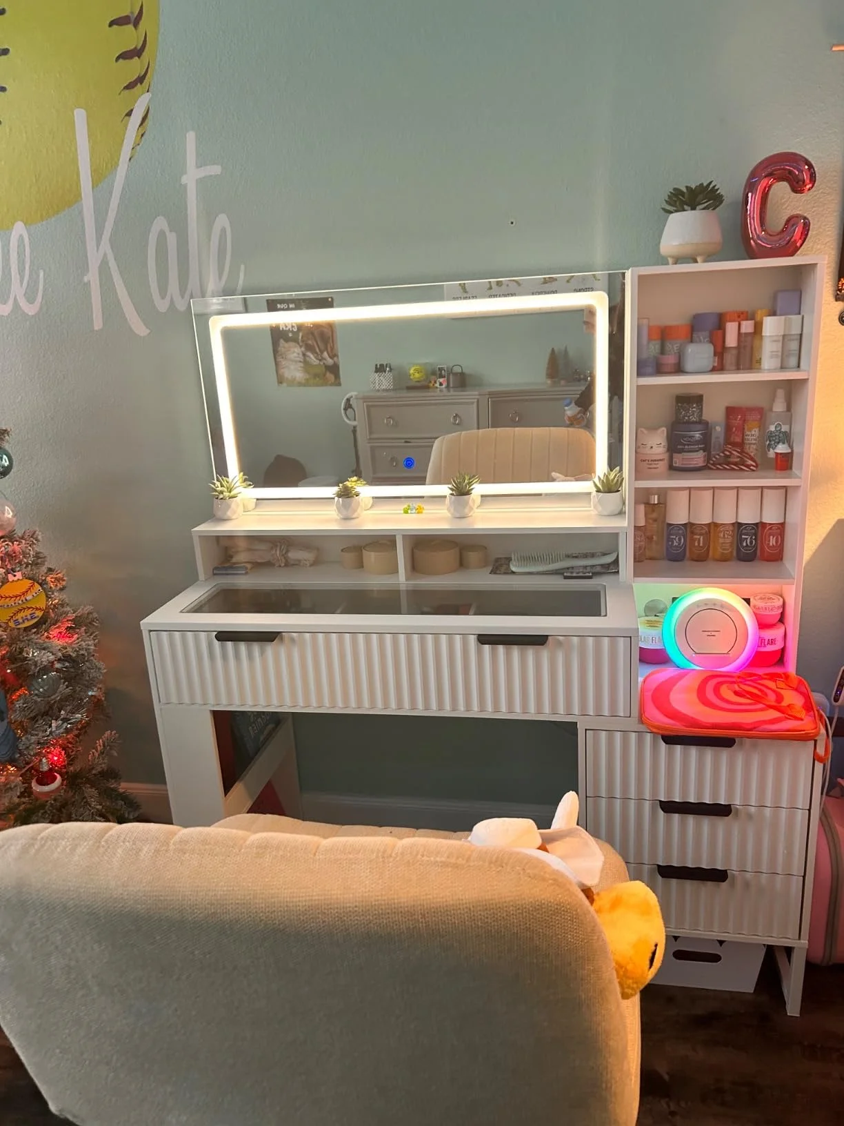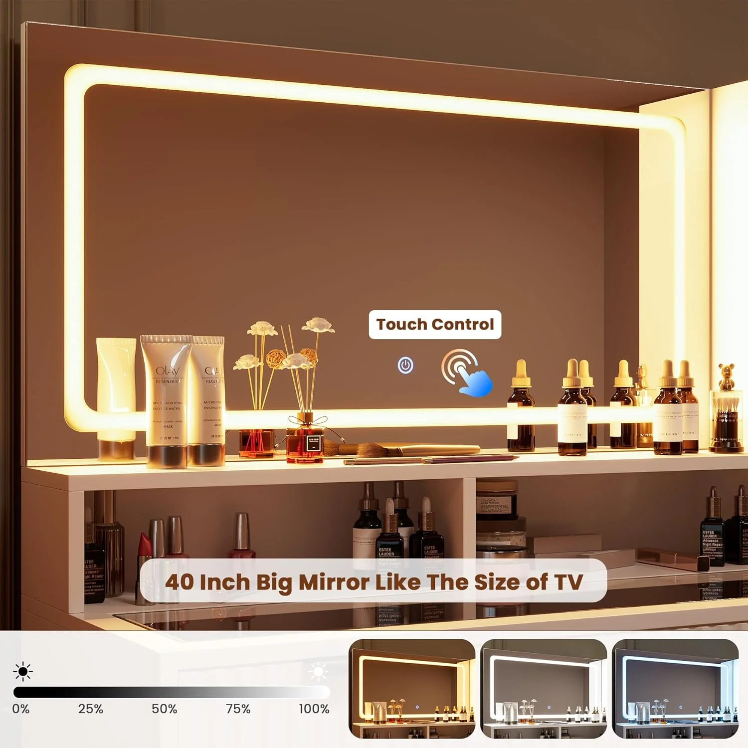 - Ample storage capacity with 2 drawers, three open shelves, a storage cabinet, a storage stool, and a desktop partitioned storage for all your beauty essentials.